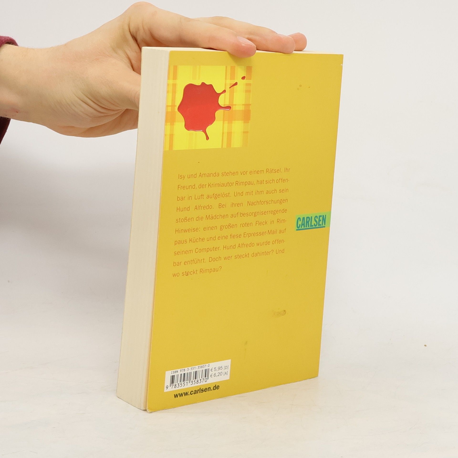 Rätselhaft! Isys und Amandas Freund, der Krimiautor Rimpau, ist spurlos verschwunden. Und mit ihm sein Hund Alfredo. Bei ihren Nachforschungen stoßen die Mädchen auf einen großen roten Fleck in der Küche und eine fiese Erpresser-Mail. Alfredo scheint entführt worden zu sein. Aber wer steckt dahinter und wo steckt Rimpau?
