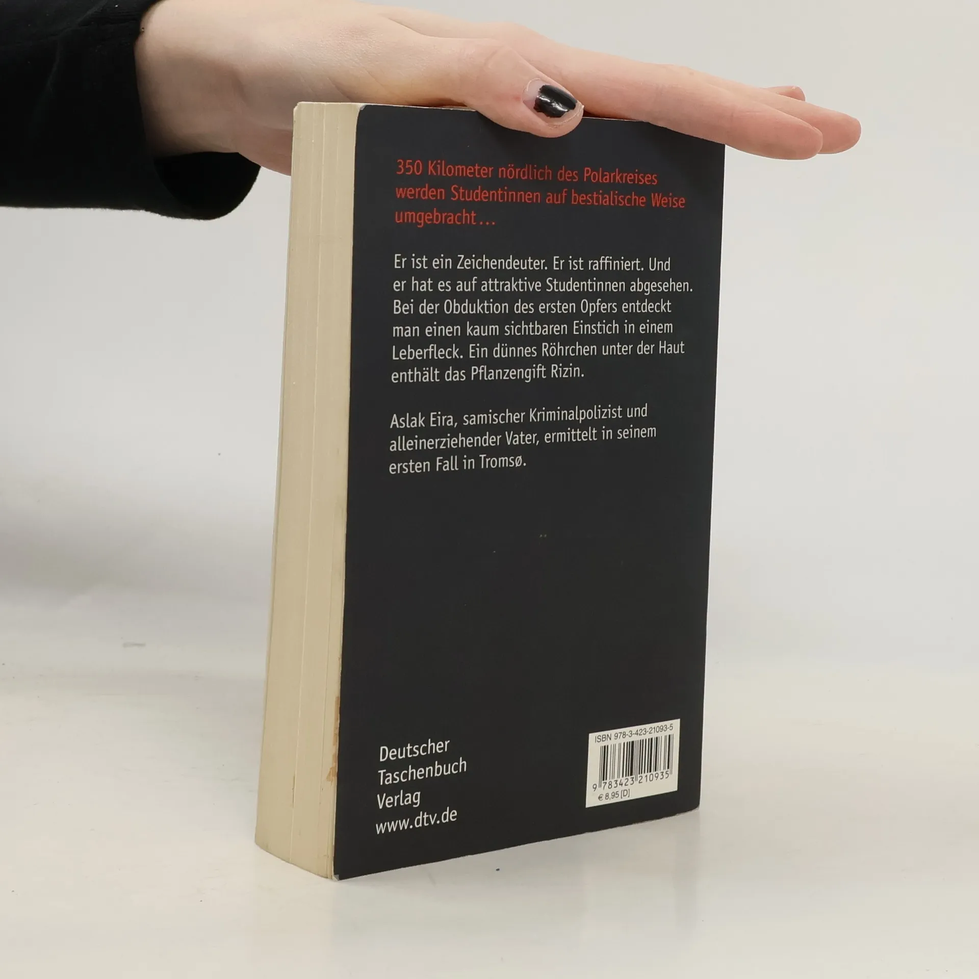 In der norwegischen Stadt Tromso wird eine attraktive Studentin tot aufgefunden. Bei der Obduktion entdeckt der Gerichtsmediziner, dass das Opfer vergewaltigt und dann mit einem Pflanzengift getötet wurde. - 1. Fall für den samischen Kriminalkommissar Aslak Eira und seine Kollegin Kine Berger.