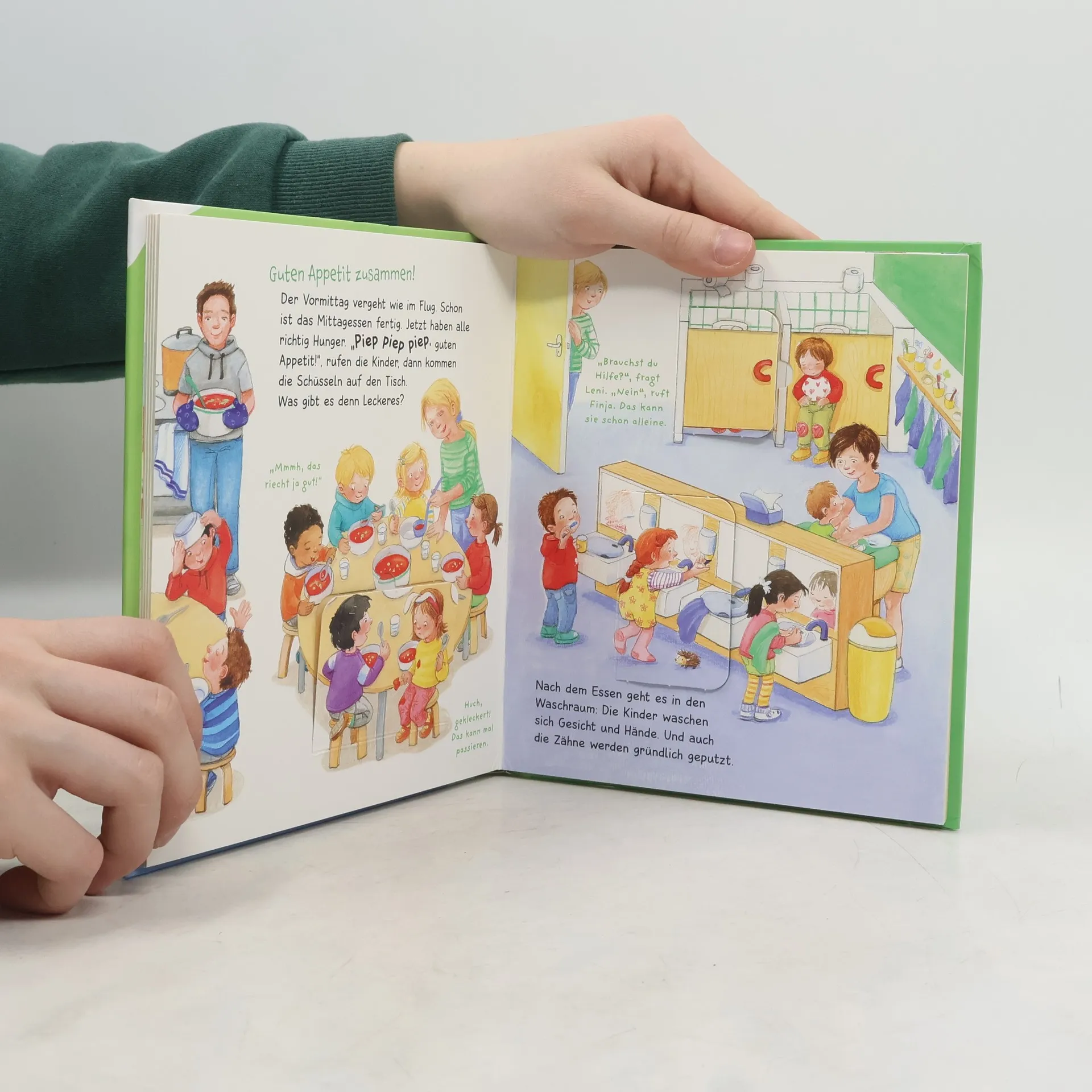Für Finja ist heute ein ganz besonderer Tag: Ihre Zeit im Kindergarten beginnt! Neugierig, aufgeregt und gleichzeitig ein bisschen ängstlich läuft sie an Mamas Hand Richtung Eingangstüre. Die Erzieherin begrüßt sie freundlich und zeigt ihr die Gruppenräume. Mit Singen, Basteln, Turnen, einer gemütlichen Pause und dem Spielen mit ihren neuen Freunden im Garten vergeht der Tag so schnell, dass Finja fast enttäuscht ist, als Mama sie wieder abholen kommt. Durch farbenfrohe, witzige Illustrationen des typischen Kindergartenalltags und kurze Texte gibt das Buch Anreize zum Gespräch zwischen Kindern und Eltern – in einer Zeit, die für die ganze Familie einen neuen Lebensabschnitt darstellt! WAS IST WAS Meine Welt – die neue Sachbuchreihe mitten aus dem Leben.