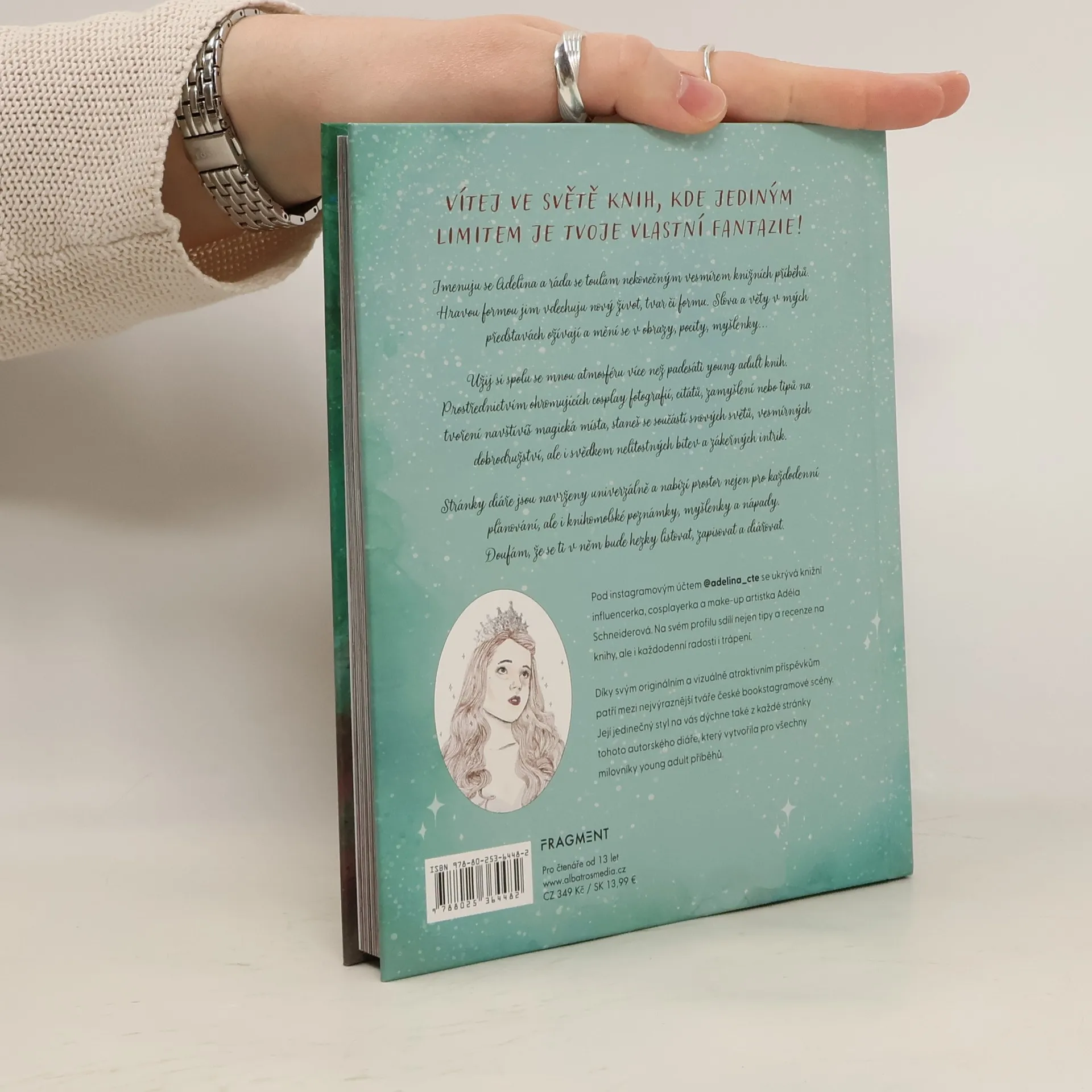 Vítej ve světě knih, kde jediným limitem je tvoje vlastní fantazie! Jmenuju se Adelína a ráda se toulám nekonečným vesmírem knižních příběhů. Hravou formou jim vdechuju nový život, tvar či formu. Užij si spolu se mnou prostřednictvím ohromujících cosplay fotografií, citátů, zamyšlení nebo kreativních nápadů atmosféru více než padesáti young adult knih. Stránky diáře jsou navrženy univerzálně a nabízí prostor nejen pro každodenní plánování, ale i knihomolské poznámky a myšlenky. Listuj, čti, zapisuj, diářuj!