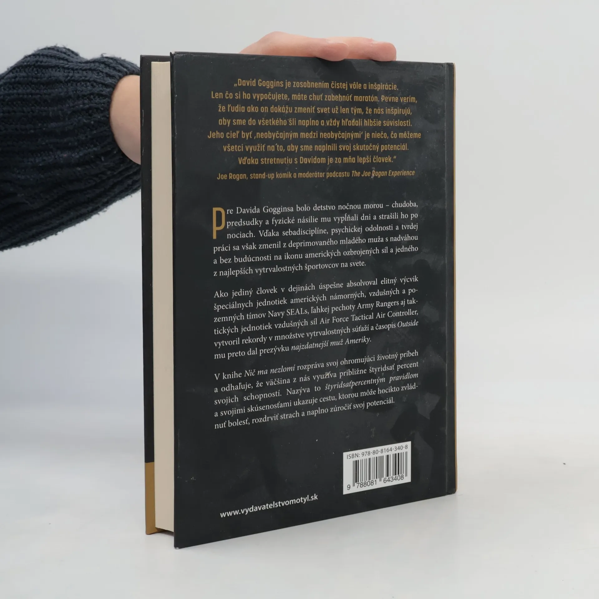 V knihe Nič ma nezlomí rozpráva David svoj ohromujúci životný príbeh a odhaľuje, že väčšina z nás využíva približne štyridsať percent svojich schopností. Nazýva to štyridsaťpercentným pravidlom a svojimi skúsenosťami ukazuje cestu, ktorou môže hocikto zvládnuť bolesť, rozdrviť strach a naplno zúročiť svoj potenciál.Pre Davida Gogginsa bolo detstvo nočnou morou - chudoba, predsudky a fyzické násilie mu vypĺňali dni a strašili ho po nociach. Vďaka sebadisciplíne, psychickej odolnosti a tvrdej práci sa však zmenil z deprimovaného mladého muža s nadváhou a bez budúcnosti na ikonu amerických ozbrojených síl a jedného z najlepších vytrvalostných športovcov na svete.