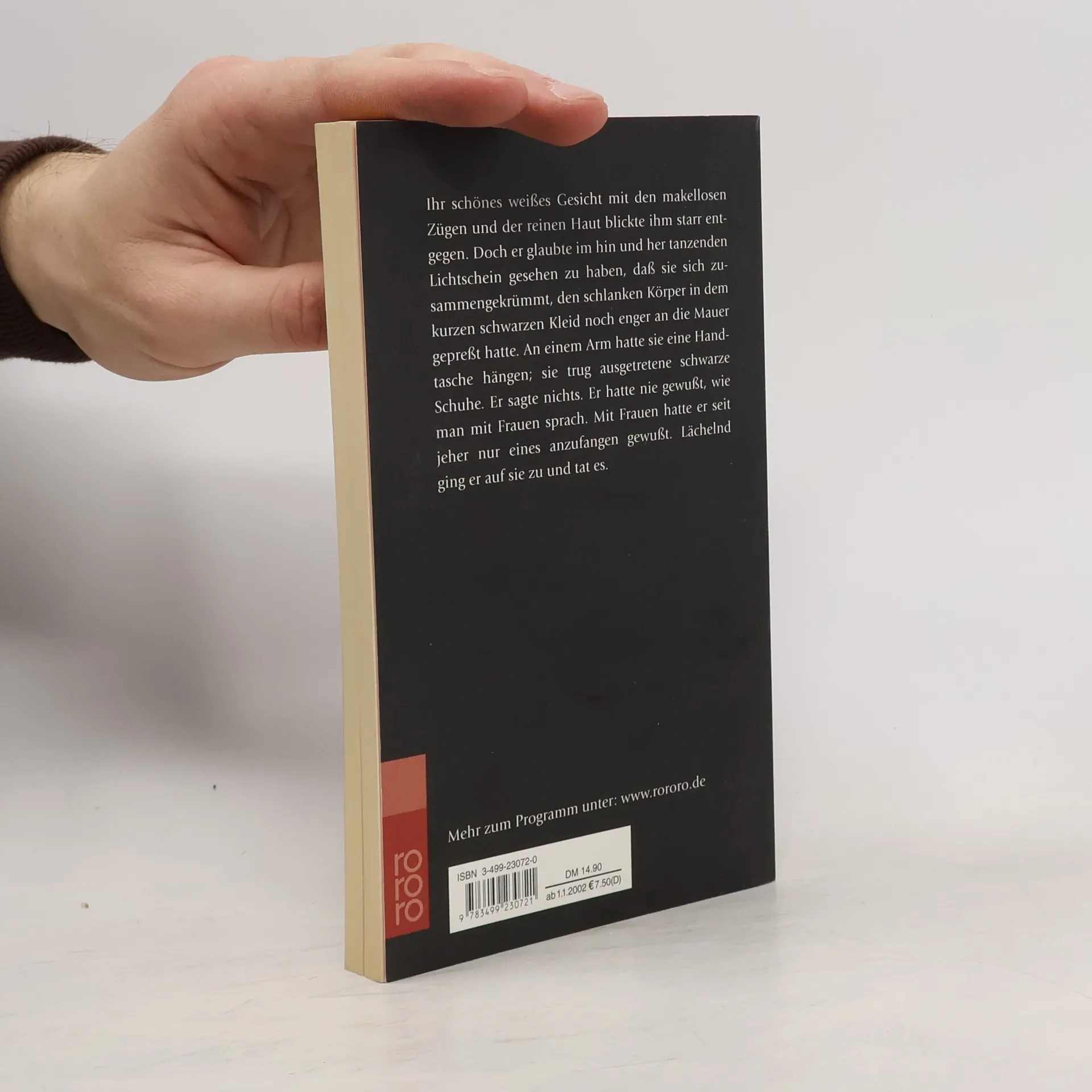 "Ihr schönes weißes Gesicht mit den makellosen Zügen und der reinen Haut blickte ihm starr entgegen. Doch er glaubte im hin und her tanzenden Lichtschein gesehen zu haben, daß sie sich zusammengekrümmt, den schlanken Körper in dem kurzen schwarzen Kleid noch enger an die Mauer gepreßt hatte. An einem Arm hatte sie eine Handtasche hängen; sie trug ausgetretene schwarze Schuhe. Er sagte nichts. Er hatte nie gewußt, wie man mit Frauen sprach. Mit Frauen hatte er seit jeher nur eines anzufangen gewußt. Lächelns ging er auf sie zu und tat es."