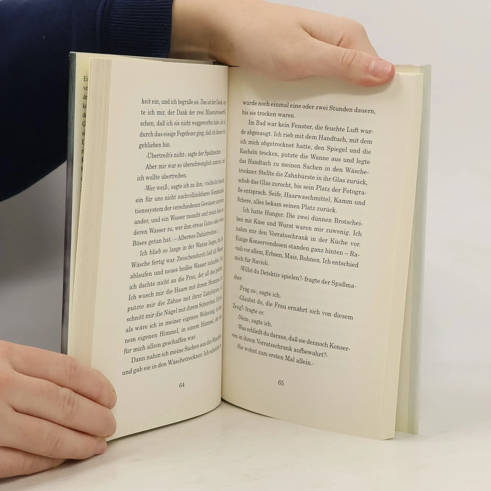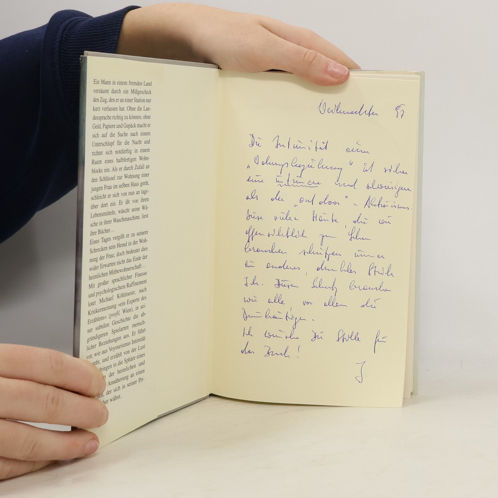 Ein Mann in einem fremden Land versäumt durch ein Missgeschick den Zug, den er an einer Station nur kurz verlassen hat. Ohne die Landessprache richtig zu können, ohne Geld, Papiere und Gepäck macht er sich auf die Suche nach einem Unterschlupf für die Nacht und richtet sich notdürftig in einem Raum eines halbfertigen Wohnblocks ein. Als er durch Zufall an den Schlüssel zur Wohnung einer jungen Frau im selben Haus gerät, schleicht er sich von nun an tagsüber dort ein. Er isst von ihren Lebensmitteln, wäscht seine Wäsche in ihrer Waschmaschine, liest ihre Bücher. Eines Tages vergisst er zu seinem Schrecken sein Hemd in der Wohnung der Frau; doch bedeutet dies wider Erwarten nicht das Ende der heimlichen Mitbewohnerschaft ... Mit großer sprachlicher Finesse und psychologischem Raffinement lotet Michael Köhlmeier, nach Kritikermeinung>ein Experte des Erzählens