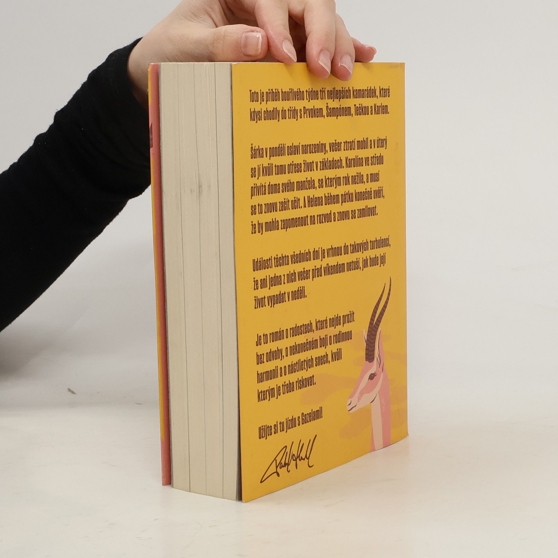 Gazely vypráví příběh jednoho bouřlivého týdne tří blízkých kamarádek, které kdysi chodily do školy s Prvokem, Šampónem, Tečkou a Karlem. Šárka začíná týden narozeninovou oslavou, ale ztráta mobilu jí už v úterý převrátí život naruby. Karolína se ve středu setkává se svým manželem, se kterým po roce odloučení zkouší obnovit vztah. Helena v pátek zjišťuje, že by mohla nechat rozvod za sebou a znovu najít lásku. Během těchto několika dní se jejich životy ocitnou ve víru změn, takže ani jedna z nich nemá tušení, jaké překvapení je čeká do neděle. Tento román je o radosti, která vyžaduje odvahu, o neustálém úsilí najít rovnováhu v rodině a o snech z mládí, kvůli kterým stojí za to riskovat.