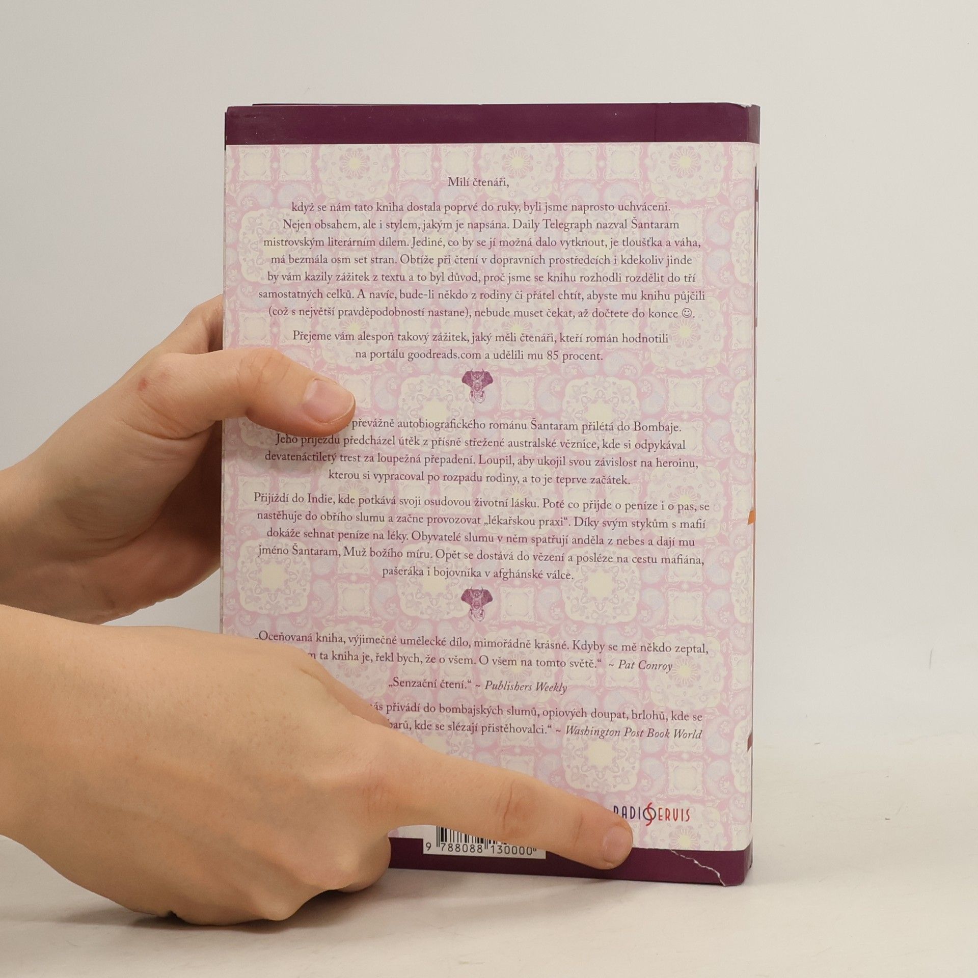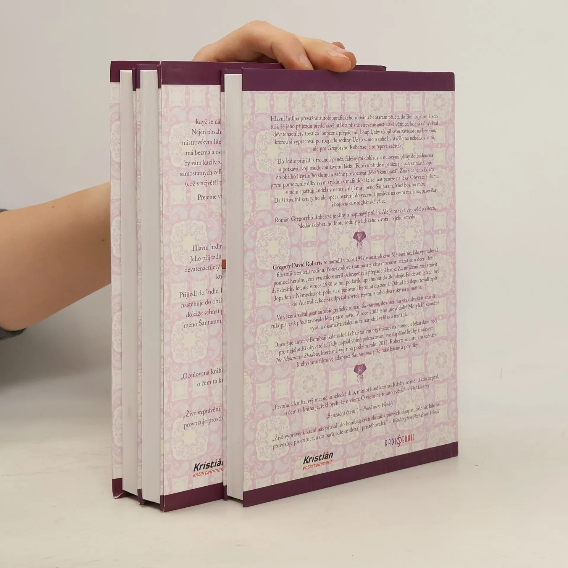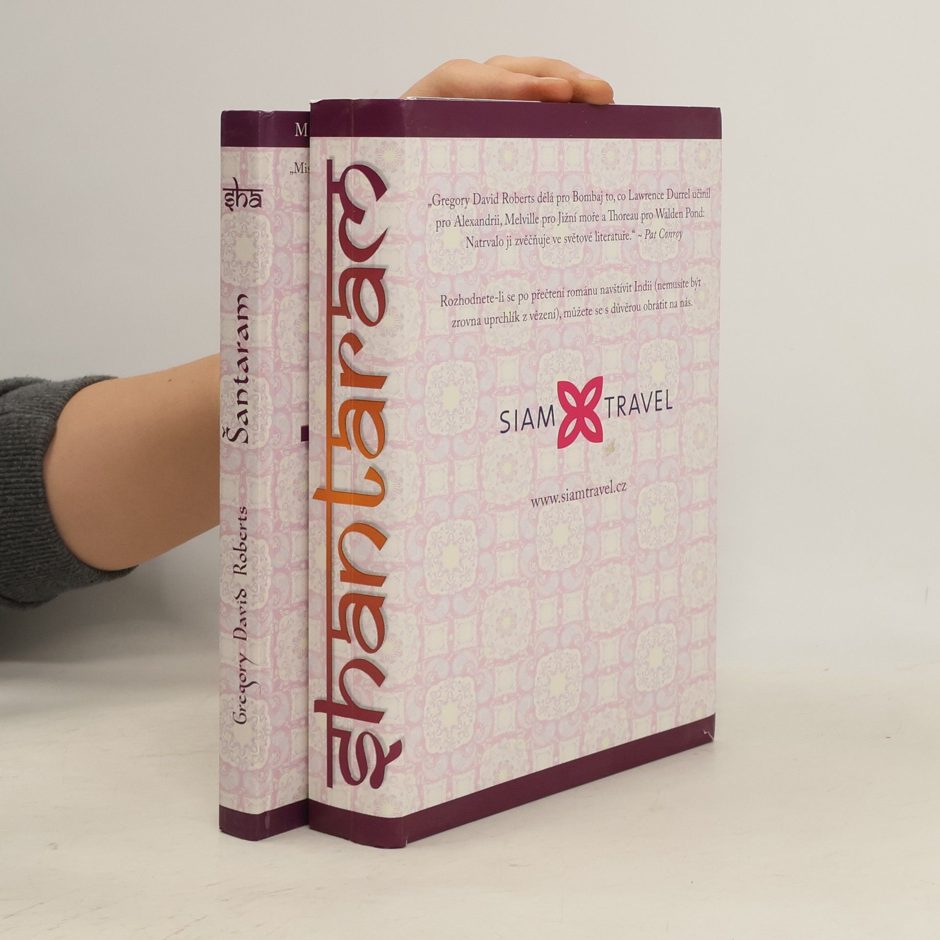 Hlavní hrdina převážně autobiografického románu Šantaram přilétá do Bombaje, aniž kdo tuší, že jeho příjezdu předcházel útěk z přísně střežené australské věznice, kde si odpykával devatenáctiletý trest za loupežná přepadení. Loupil, aby ukojil svou závislost na heroinu, kterou si vypracoval po rozpadu rodiny. V Bombaji získává přátele, kteří mu pomohou zorientovat se v tamějším životě, ale další životní zvraty ho opět dostávají do vězení a posléze na cestu mafiána, pašeráka i bojovníka v afghánské válce. Román Šantaram je silný a napínavý příběh. Ale je to také výpověď o citech, hledání dobra, hodnotě rodiny a lidského života i jeho smyslu. Kniha je také označována jako „novodobý Motýlek“ a po vydání okamžitě získala mezinárodní věhlas a uznání. Filmová práva vlastní Johny Depp, v roce 2016 je očekávána premiéra filmu. Gregory David Roberts, který v románu popsal své vlastní zážitky, dnes žije v Bombaji, kde založil charitativní organizaci zajišťující lékařskou péči pro nejchudší obyvatele. Tady napsal i volné pokračování své úspěšné knihy s názvem The Mountain Shadow, která má vyjít letos na podzim. Kniha, jež právě vychází v češtině, je kvůli čtenářskému komfortu rozdělená do tří samostatných oddílů, ale speciální obal z ní činí jeden celek se společným hřbetem.