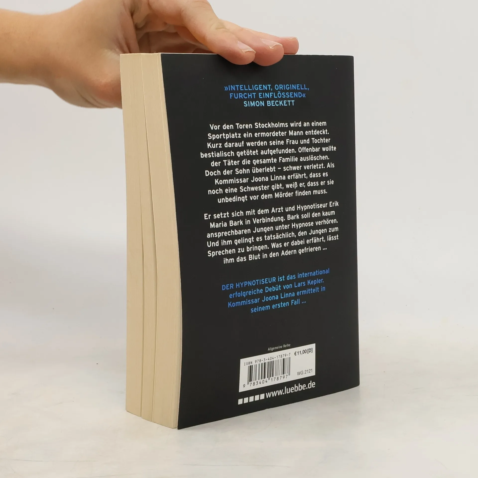 Vor den Toren Stockholms wird an einem Sportplatz ein brutal ermordeter Mann entdeckt. Kurz darauf werden seine Frau und Tochter ebenso bestialisch getötet aufgefunden. Offenbar wollte der Täter die gesamte Familie auslöschen. Doch der Sohn überlebt schwer verletzt. Als Kommissar Joona Linna erfährt, dass es noch eine Schwester gibt, wird ihm klar, dass er sie unbedingt vor dem Mörder finden muss. Er setzt sich mit dem Arzt und Hypnotiseur Erik Maria Bark in Verbindung. Er soll den kaum ansprechbaren Jungen unter Hypnose verhören. Und Bark gelingt es tatsächlich, den Jungen zum Sprechen zu bringen. Was er dabei erfährt, lässt ihm das Blut in den Adern gefrieren ... DER HYPNOTISEUR ist das international erfolgreiche Debüt von Lars Kepler. Kommissar Joona Linna ermittelt in seinem ersten Fall.