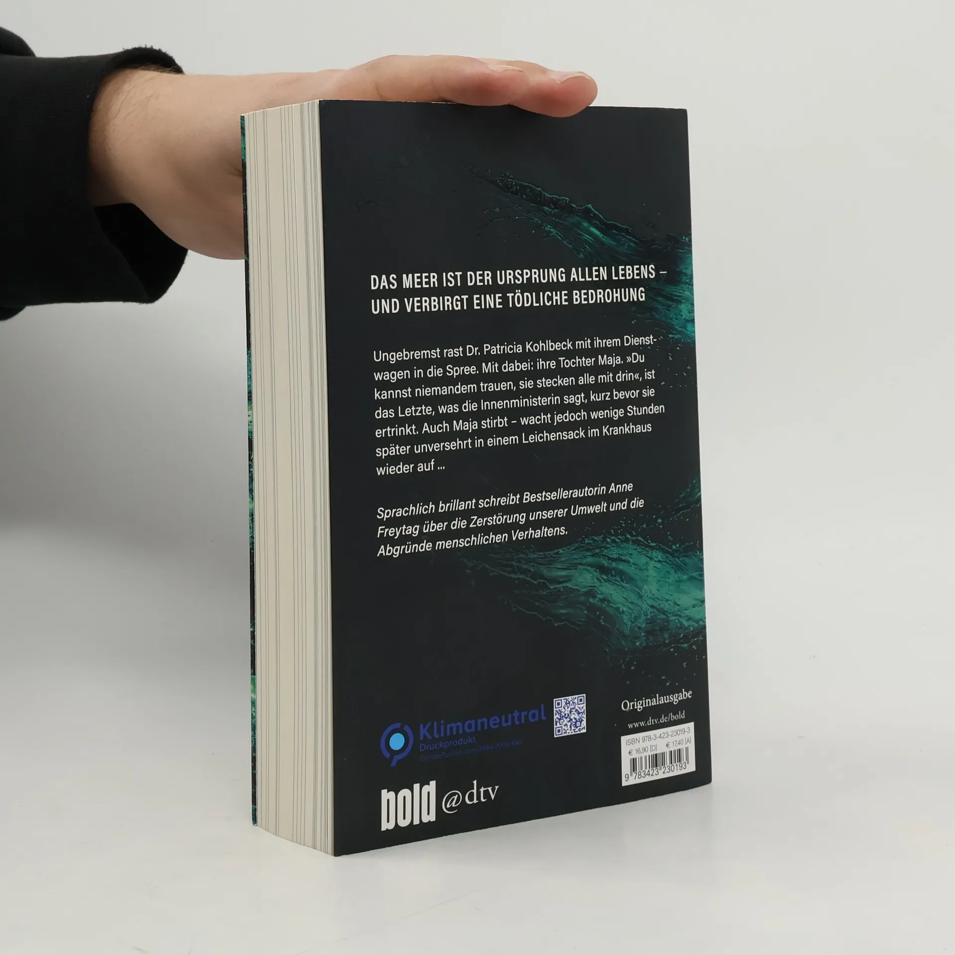 Das Meer ist der Ursprung allen Lebens und verbirgt eine tödliche Bedrohung Ohne zu bremsen, rast die Innenministerin Dr. Patricia Kohlbeck mit ihrem Dienstwagen in die Spree. Mit dabei: ihre Tochter Maja. »Du kannst niemandem trauen, sie stecken alle mit drin«, ist das Letzte, was sie zu ihrer Tochter sagt, bevor sie ertrinkt. Auch Maja stirbt – wacht jedoch wenige Stunden später unversehrt in einem Leichensack im Krankenhaus wieder auf. Wie ist das möglich? Während Maja versucht, Antworten zu finden, ereignet sich eine verheerende Naturkatastrophe nach der anderen. Und gegen ihren Willen gerät sie in einen Konflikt aus Lügen, Intrigen und Machtkämpfen, dessen Folgen fatale Ausmaße annehmen.