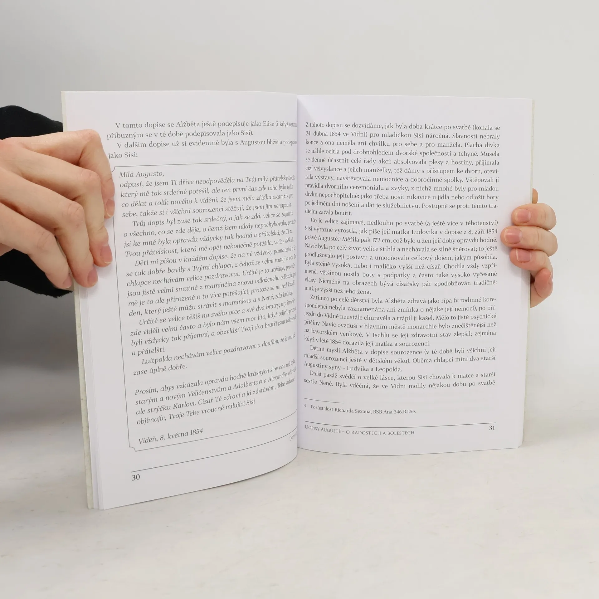 O rakouské císařovně Sisi bylo napsáno mnoho knih. Jen málo z nich ale vychází z autentických primárních pramenů. A ještě méně se jich opírá o její vlastnoručně psané dopisy. Dopisy od Sisi nabízejí jedinečnou možnost začíst se do 24 Alžbětiných dosud nepublikovaných osobních psaní, která pocházejí z Tajného domácího archivu rodu Wittelsbachů. Jedná se o nesmírně vzácné dokumenty, umožňující čtenářům poznat císařovnu osobně. Co svěřovala jejich adresátům? Jaký k nim měla vztah? Co o ní vypovídá její osobitý rukopis? Jak se její korespondence měnila v čase? Kniha představí Alžbětu v různých životních etapách, se všemi jejími radostmi i starostmi. Český překlad dopisů doplňují skeny vybraných originálů a erudovaný výklad autorky.