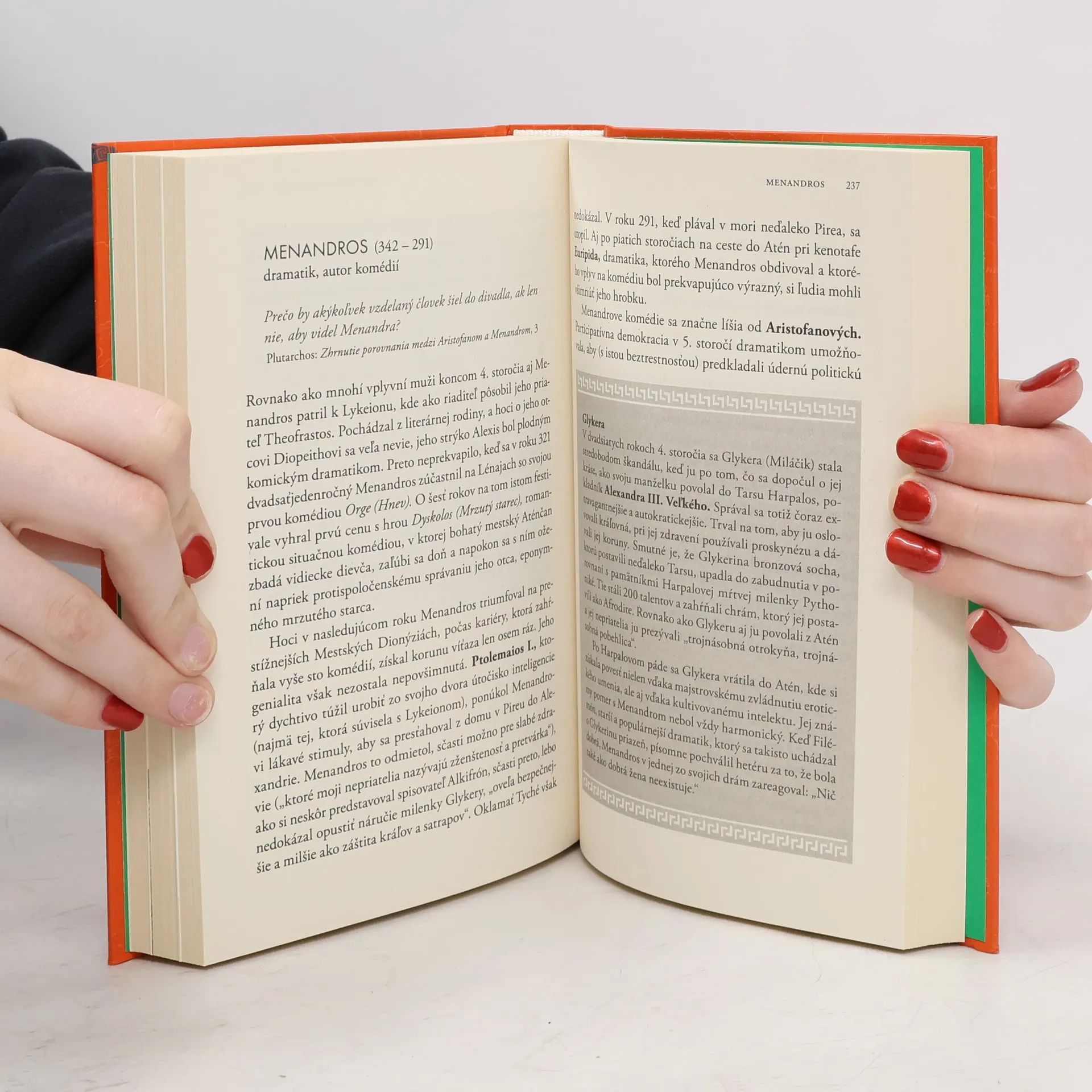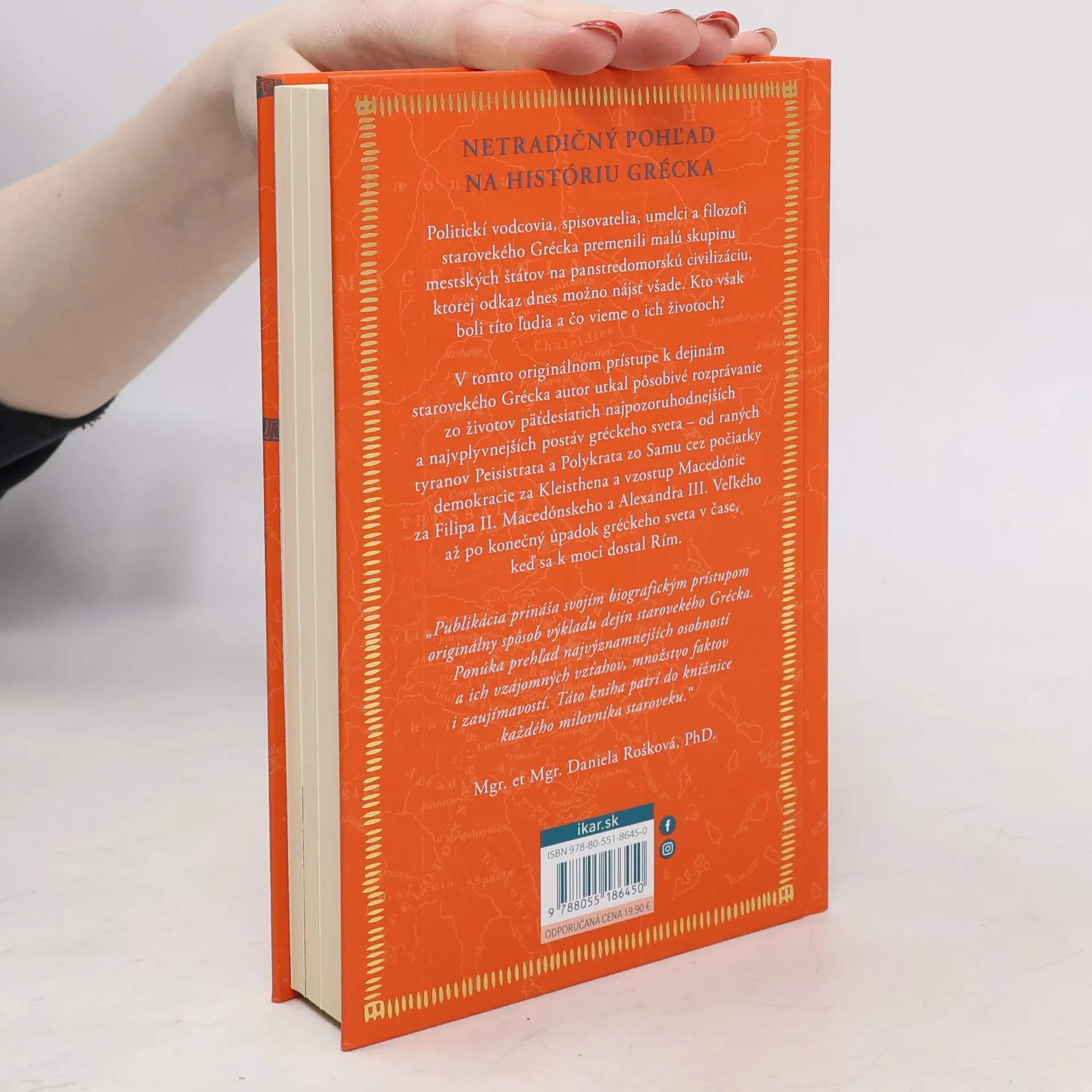 Netradičný pohľad na históriu Grécka je prezentovaný prostredníctvom životopisov významných gréckych osobností. Politickí vodcovia, spisovatelia, umelci a filozofi transformovali malé mestské štáty na panstredomorskú civilizáciu, ktorej odkaz pretrváva dodnes. Autor prepojil životy päťdesiatich najvplyvnejších postáv, od tyranov ako Peisistratos a Polykrates, cez demokratické reformy Kleisthena, až po vzostup Macedónie pod Filipom II. a Alexandrom III. Veľkým, a konečný úpadok gréckeho sveta s príchodom Ríma. Okrem známych osobností ako Herodotos a Alexander Veľký sa objavujú aj menej známe figúry ako Demetrios a Alelles. Zaujímavé je zvýraznenie mien osobností, s ktorými sa daná postava stretla, čo obohacuje historické súvislosti. Kniha je určená milovníkom antiky a mala by byť súčasťou školských knižníc od základných až po vysoké školy humanitného zamerania. Odborníci na antické Grécko ocenia jej prehľad a nové prepojenia dejín. Autor, známy popularizátor antickej kultúry, začína prehľadom gréckej historiografie a jednotlivé biografie sú doplnené zaujímavými faktami a 25 farebnými fotografiami a 4 mapami.