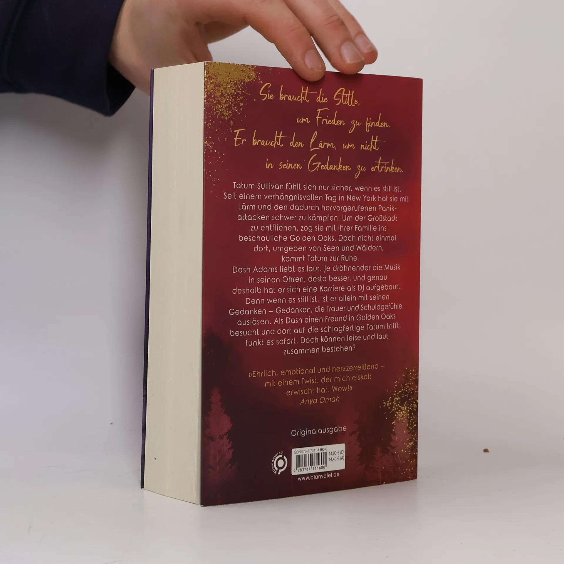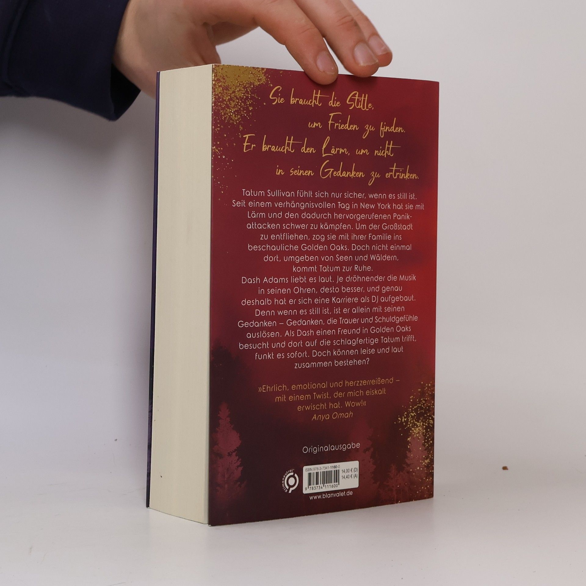 Tatum & Dash: Sie braucht die Stille, um Frieden zu finden. Er braucht den Lärm, um mit seinen Gedanken nicht alleine zu sein. Doch können leise und laut gemeinsam bestehen? Tatum Sullivan fühlt sich nur sicher, wenn es still ist. Seit einem verhängnisvollen Tag in New York hat sie mit Lärm und den dadurch hervorgerufenen Panikattacken schwer zu kämpfen. Um der lauten Großstadt zu entfliehen, zog sie vor einigen Jahren mit ihrer Familie ins beschauliche Golden Oaks, Connecticut. Doch nicht einmal dort, umgeben von Seen und endlosen Wäldern, kommt Tatum zur Ruhe. Dash Adams liebt es laut. Je dröhnender die Musik in seinen Ohren, desto besser, und genau deshalb hat er sich auch eine Karriere als DJ aufgebaut. Denn wenn es still ist, ist er allein mit seinen Gedanken – Gedanken, die Trauer und Schuldgefühle auslösen. Als Dash einen Freund in Golden Oaks besucht und dort auf die schlagfertige Tatum trifft, funkt es sofort. Doch können leise und laut zusammen bestehen? »Ich bin Tatum und Dash hoffnungslos verfallen. Ihre Geschichte ist ehrlich, emotional und herzzerreißend – mit einem Twist, der mich eiskalt erwischt hat. Wow!« Anya Omah