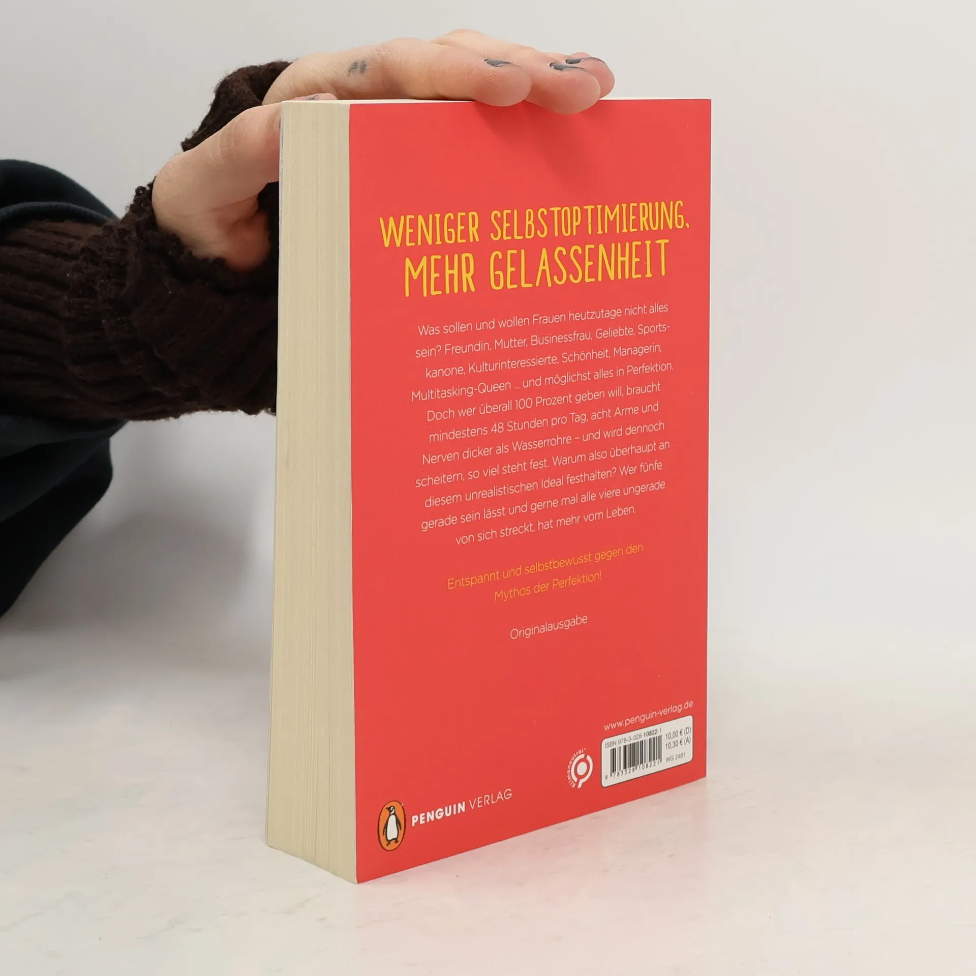 Weniger Selbstoptimierung, mehr Gelassenheit Was sollen und wollen Frauen heutzutage nicht alles sein? Freundin, Mutter, Gattin, Businessfrau, Geliebte, Sportskanone, Kulturinteressierte, Schönheit, Hausfrau, Multitasking-Queen, Taxi, Coach und Krankenschwester … Und möglichst alles in Perfektion. Doch wer überall 100 Prozent geben will, braucht mindestens 48 Stunden pro Tag, acht Arme und Nerven dicker als Wasserrohre – und wird dennoch scheitern, so viel steht fest. Warum also überhaupt an diesem unrealistischen Ideal festhalten? Wer fünfe gerade sein lässt und gerne mal alle viere ungerade von sich streckt, hat mehr vom Leben. Ein Plädoyer gegen den Mythos der Perfektion.