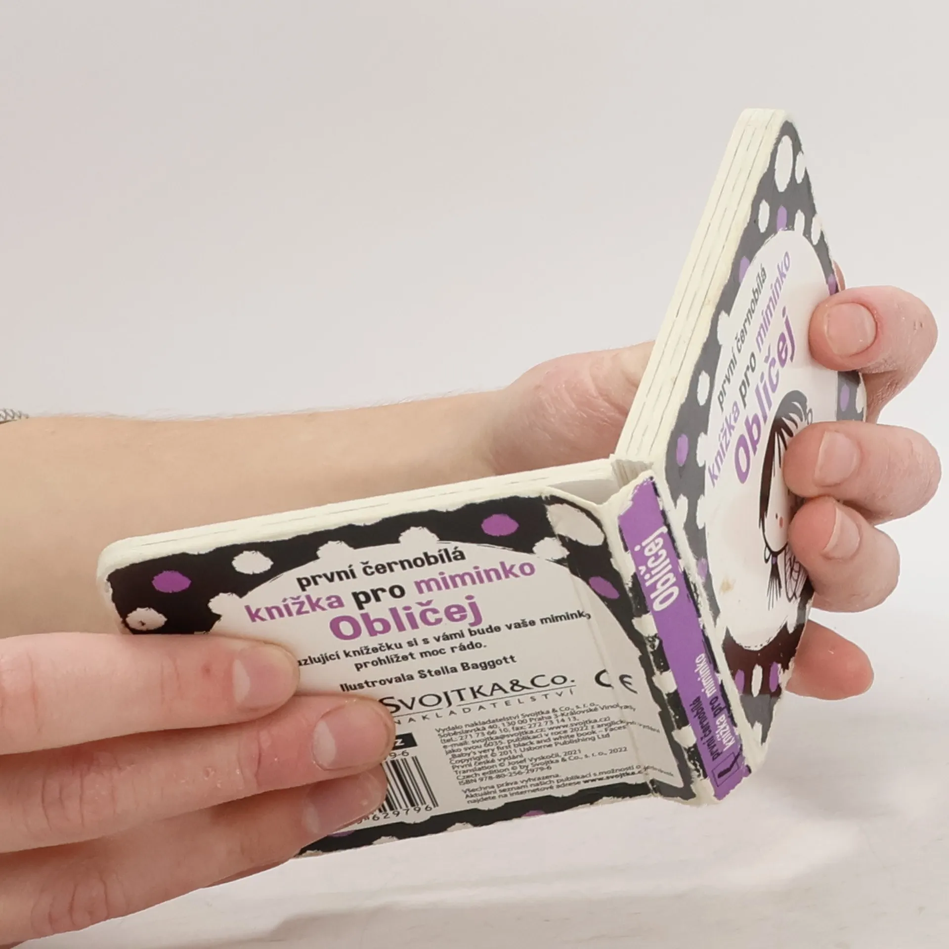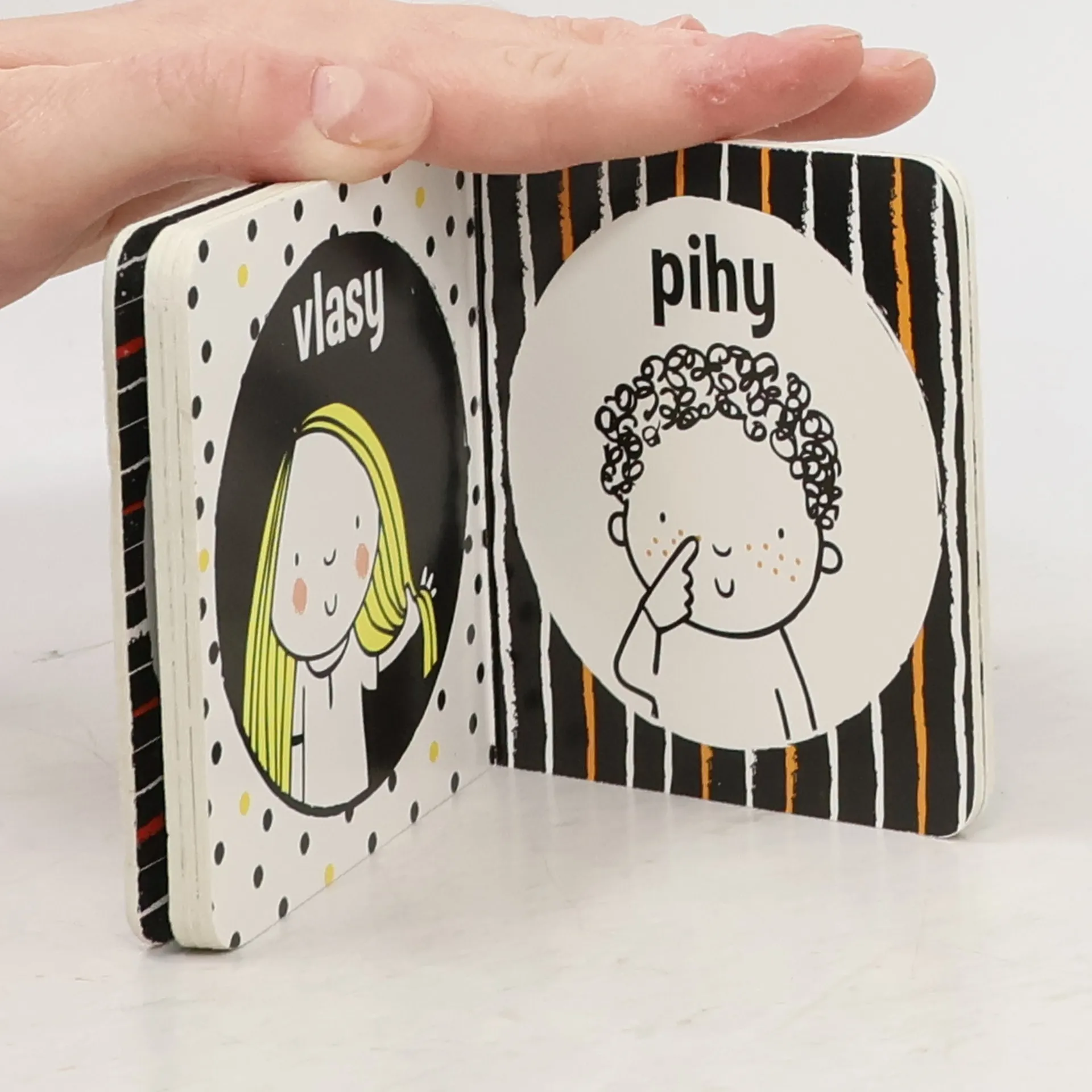 Kapesní knížka s tvrdými stránkami a jednoduchými kontrastními obrázky částí obličeje.