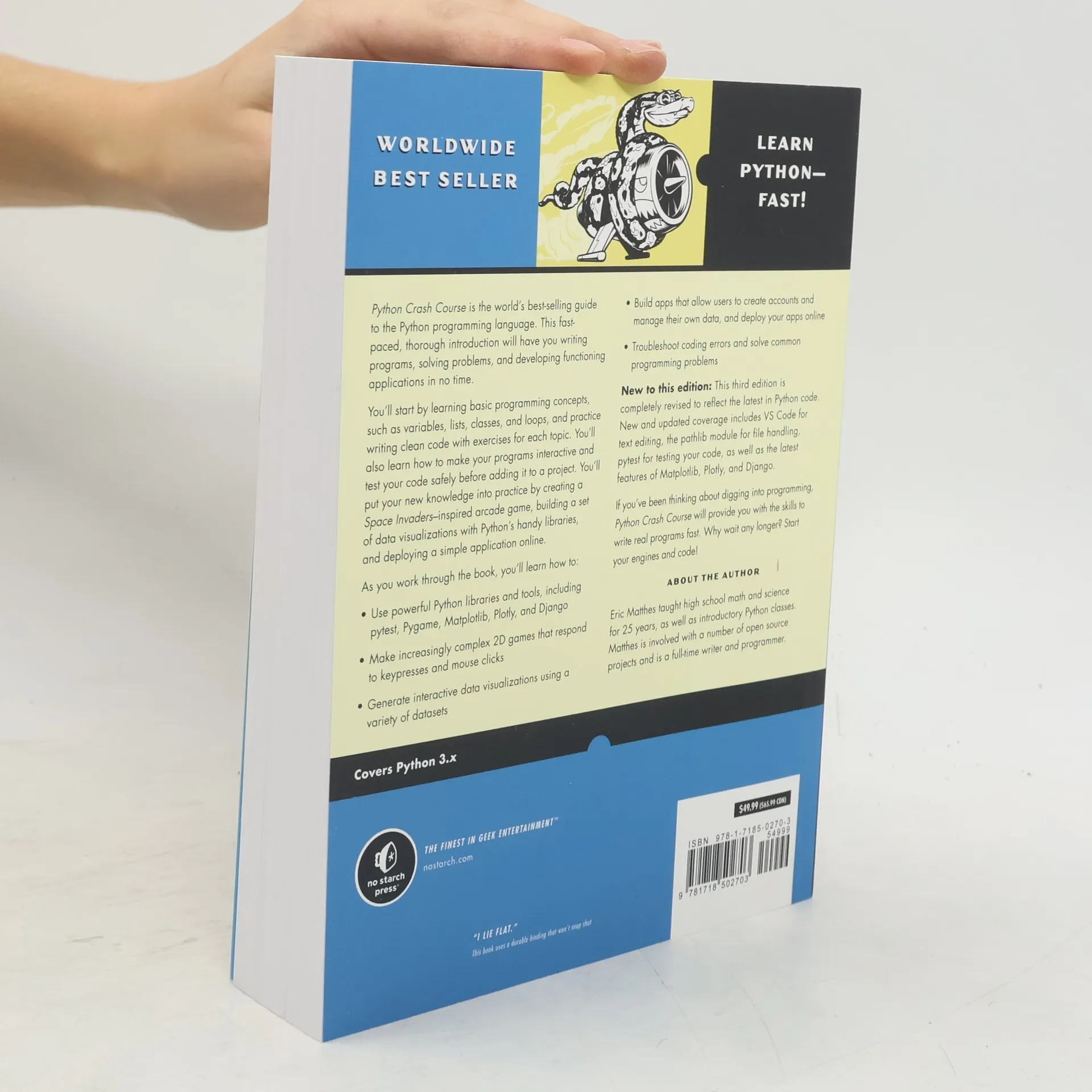 Second edition of the best selling Python book in the world. A fast-paced, no-nonsense guide to programming in Python. This book teaches beginners the basics of programming in Python with a focus on real projects. This is the second edition of the best selling Python book in the world. Python Crash Course, 2nd Edition is a straightforward introduction to the core of Python programming. Author Eric Matthes dispenses with the sort of tedious, unnecessary information that can get in the way of learning how to program, choosing instead to provide a foundation in general programming concepts, Python fundamentals, and problem solving. Three real world projects in the second part of the book allow readers to apply their knowledge in useful ways. Readers will learn how to create a simple video game, use data visualization techniques to make graphs and charts, and build and deploy an interactive web application. Python Crash Course, 2nd Edition teaches beginners the essentials of Python quickly so that they can build practical programs and develop powerful programming techniques.