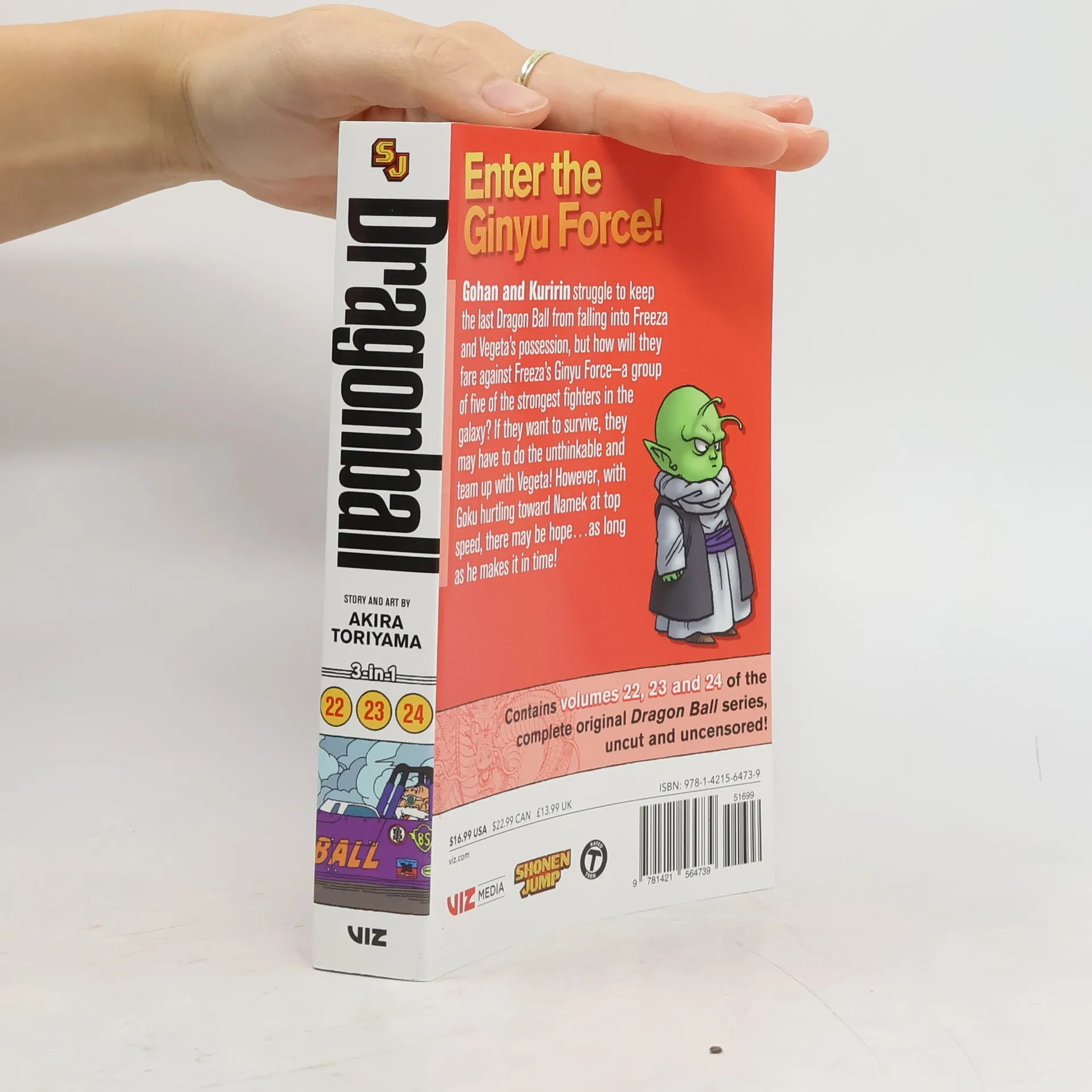 Akira Toriyama's groundbreaking, iconic, best-selling series now in an omnibus edition! Dragon Ball introduces a young monkey-tailed boy named Goku (a wry update of the classic Chinese "Monkey King" legend), whose quiet life changes when he meets a girl named Bulma who is on a quest to collect seven "Dragon Balls." If she gathers them all, an incredibly powerful dragon will appear and grant her one wish. But the precious orbs are scattered all over the world, and Bulma could use the help of a certain super-strong boy... Enter the Ginyu Force! Gohan and Kuririn struggle to keep the last Dragon Ball from falling into Freeza and Vegeta’s possession, but how will they fare against Freeza’s Ginyu Force—a group of five of the strongest fighters in the galaxy? If they want to survive, they may have to do the unthinkable and team up with Vegeta! However, with Goku hurtling toward Namek at top speed, there may be hope…as long as he makes it in time!