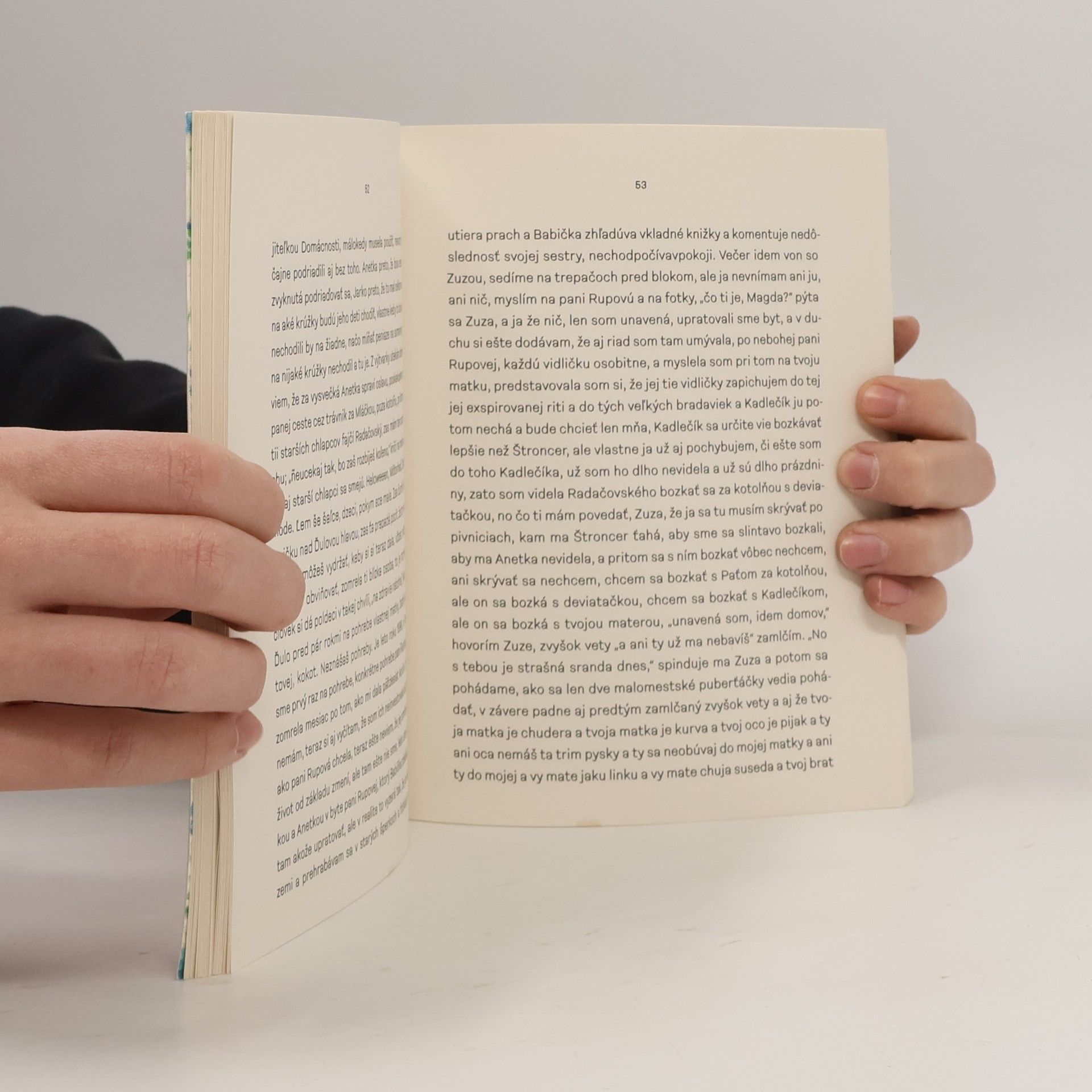 Deväťdesiate roky, malomestské sídlisko. Detstvá, dospievania, starnutia, rozbité kolená, premočené papuče, susedia, krčmy, škôlky a školy, malomestské životy, Maria Callas a jedna Babička. Piata kniha Ivany Gibovej vychádza v novej edícii Ivana G.