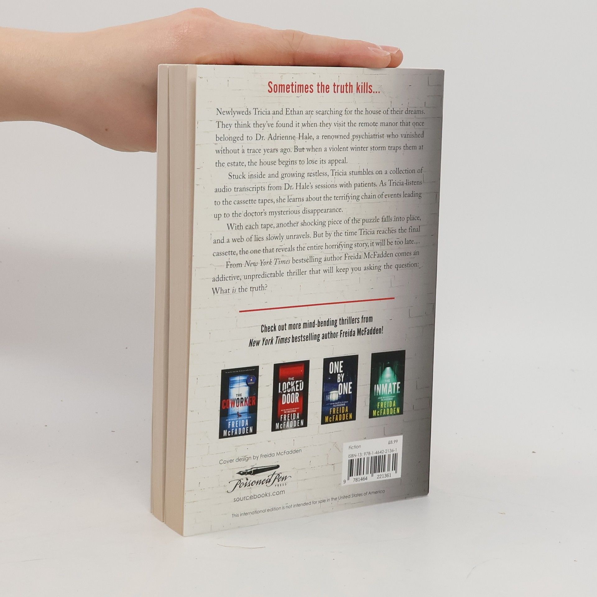 A twisting, pulse-pounding thriller from the Sunday Times bestselling author of The Housemaid and The Coworker! Sometimes the truth kills... Newlyweds Tricia and Ethan are searching for the house of their dreams. They think they've found it when they visit the remote manor that once belonged to Dr. Adrienne Hale, a renowned psychiatrist who vanished without a trace years ago. But when a violent winter storm traps them at the estate, the house begins to lose its appeal. Stuck inside and growing restless, Tricia stumbles on a collection of audio transcripts from Dr. Hale's sessions with patients. As Tricia listens to the cassette tapes, she learns about the terrifying chain of events leading up to the doctor's mysterious disappearance. With each tape, another shocking piece of the puzzle falls into place, and a web of lies slowly unravels. But by the time Tricia reaches the final cassette, the one that reveals the entire horrifying story, it will be too late... From Sunday Times bestselling author Freida McFadden comes an addictive, unpredictable thriller that will keep you asking the question: what is the truth?