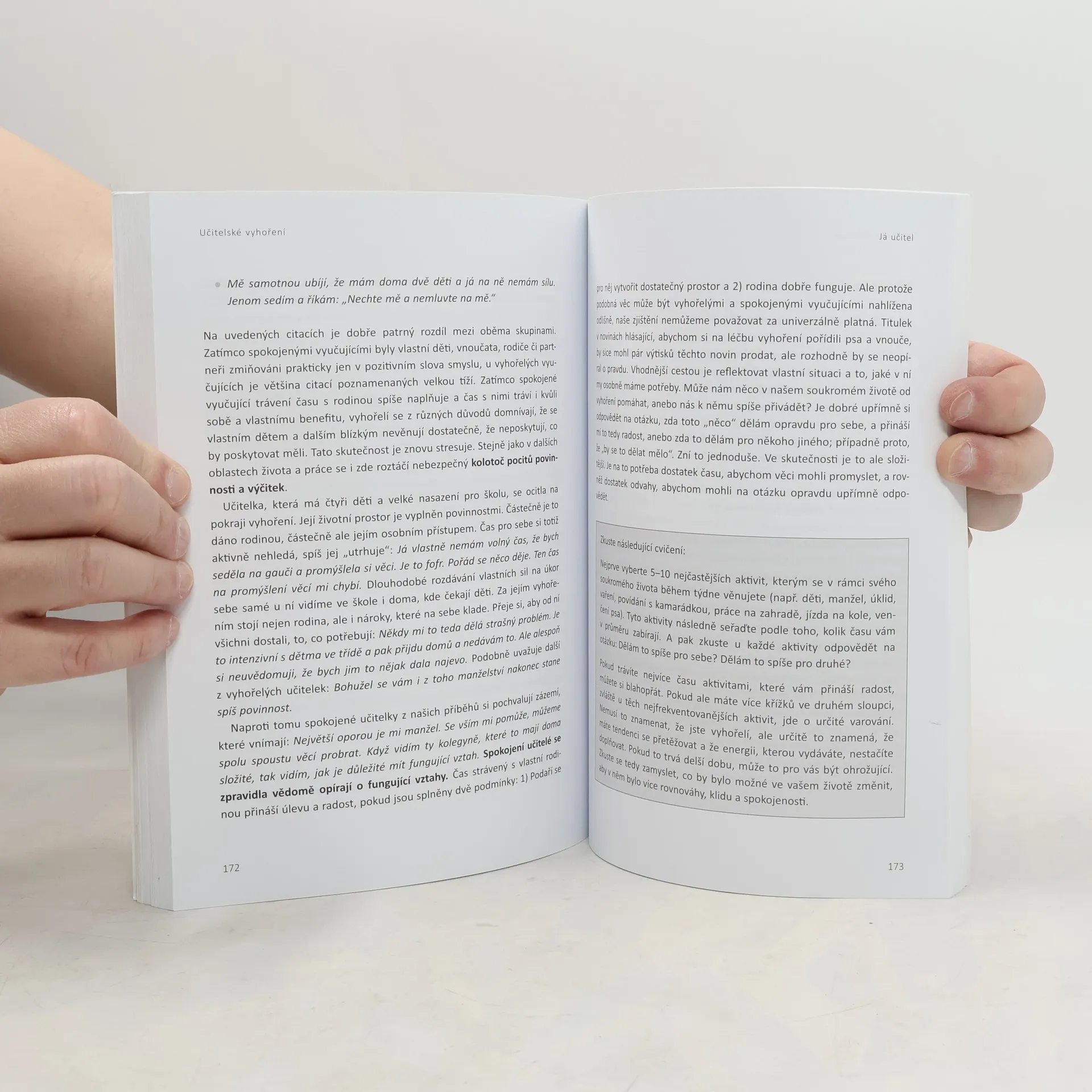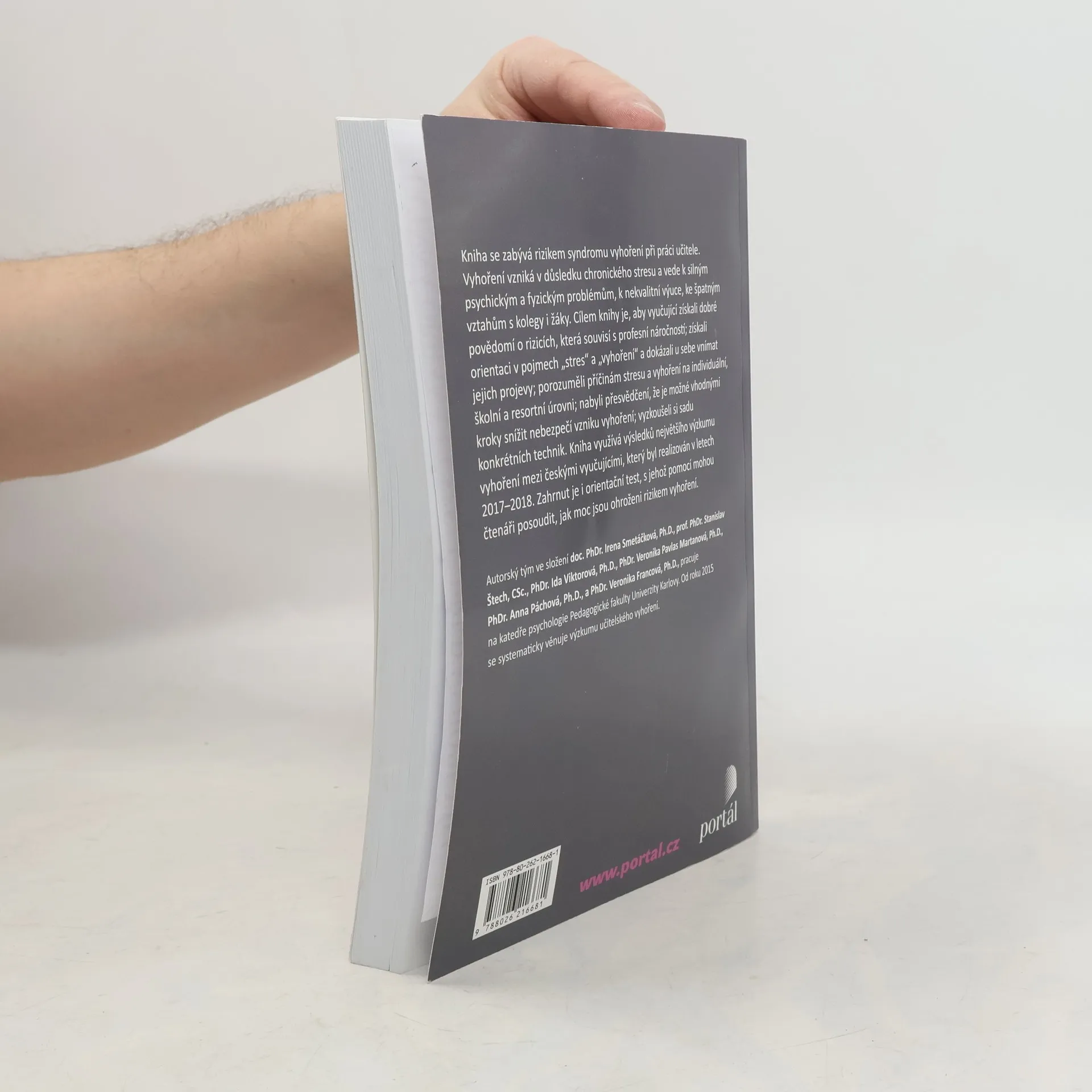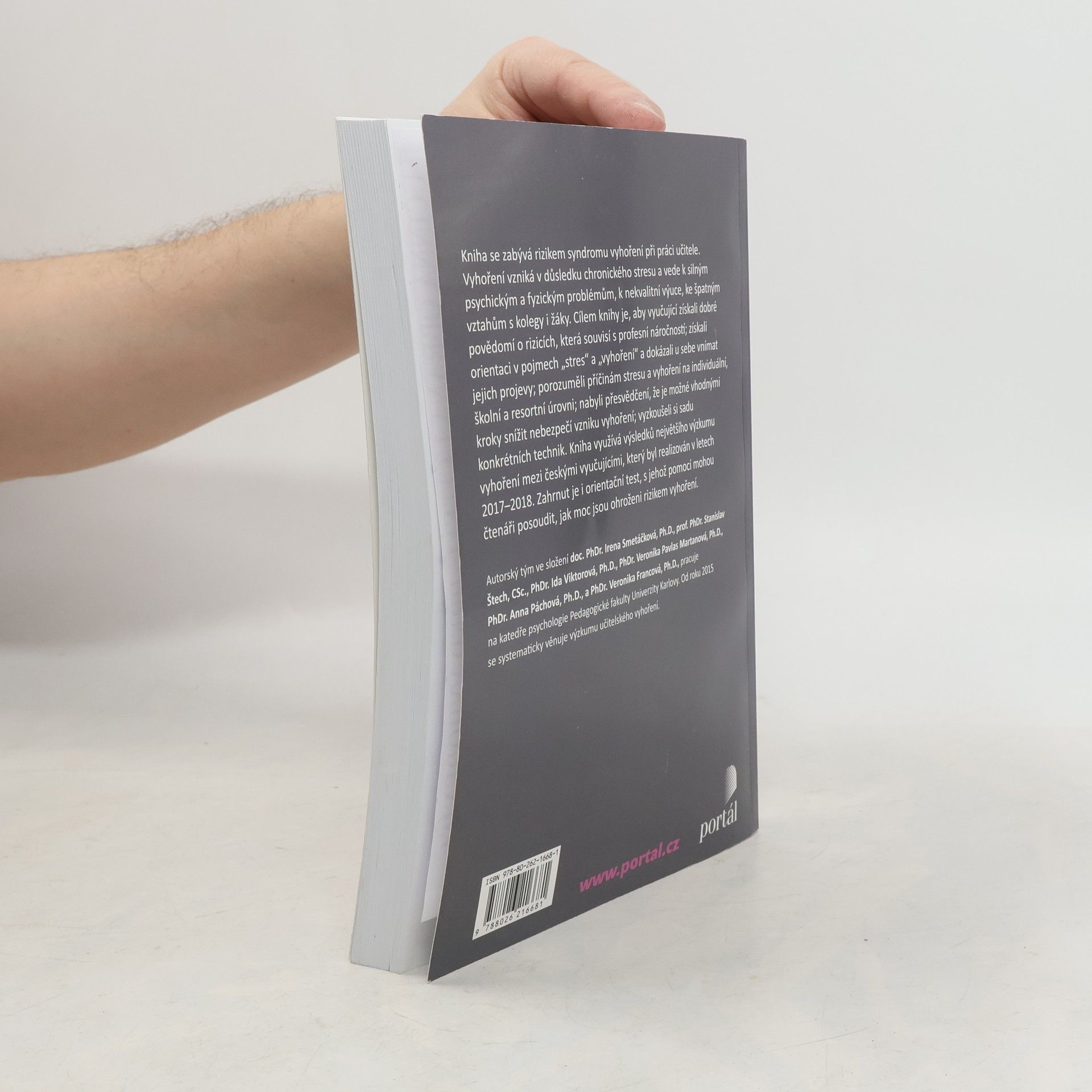 Kniha se zabývá rizikem syndromu vyhoření při práci učitele. Vyhoření vzniká v důsledku chronického stresu a vede k silným psychickým a fyzickým problémům, k nekvalitní výuce, ke špatným vztahům ke kolegům a žákům. Cílem knihy je, aby vyučující získali dobré povědomí o rizicích, která souvisejí s profesní náročností, získali orientaci v pojmech „stres“ a „vyhoření“ a dokázali u sebe vnímat jejich projevy, porozuměli příčinám stresu a vyhoření na individuální, školní a resortní úrovni, nabyli přesvědčení, že je možné vhodnými kroky snížit nebezpečí vzniku vyhoření, vyzkoušeli si sadu konkrétních technik. Kniha využívá výsledků největšího výzkumu vyhoření mezi českými vyučujícími, který byl realizován v letech 2017–2018.