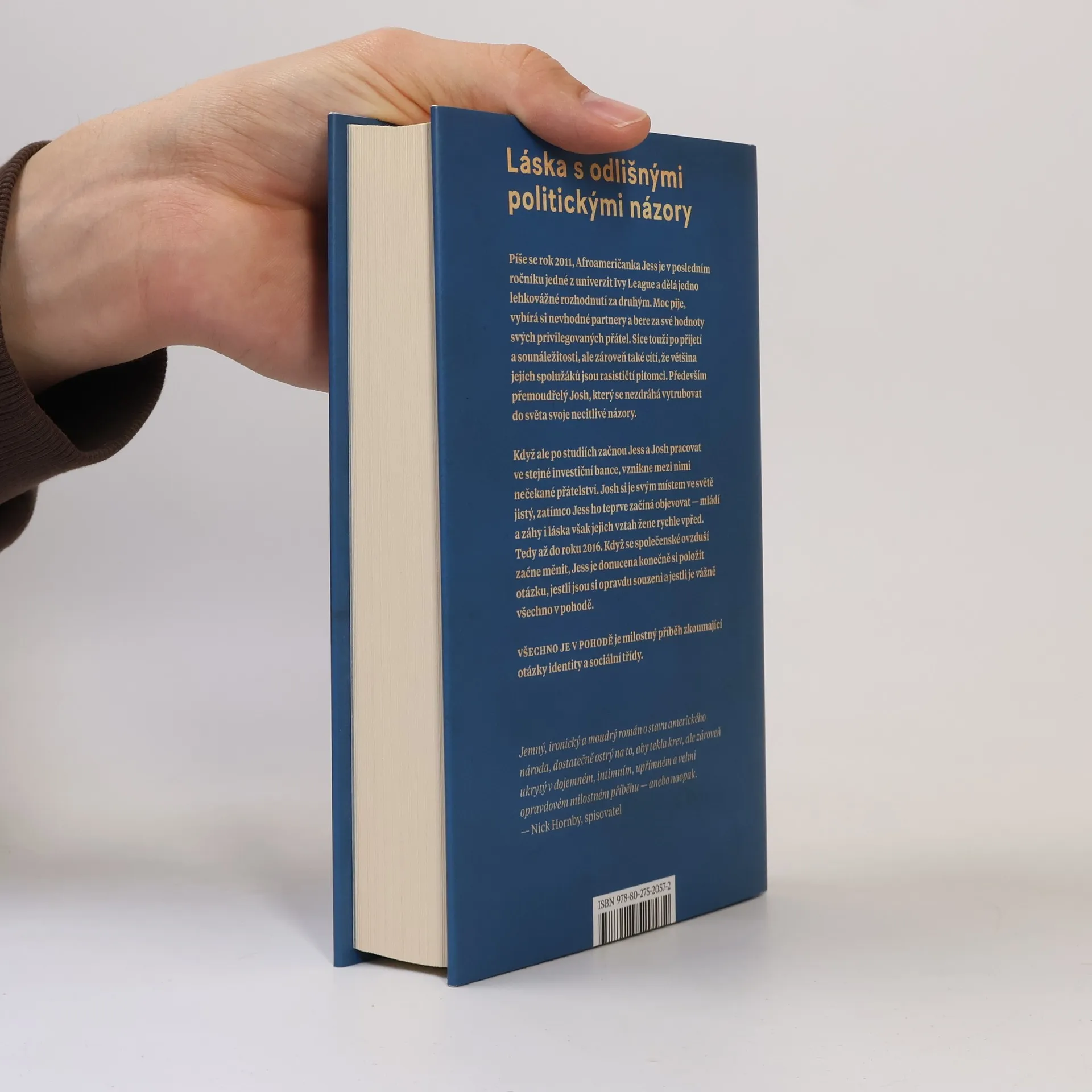 Láska s odlišnými politickými názory. Píše se rok 2011, Afroameričanka Jess je v posledním ročníku jedné z univerzit Ivy League a dělá jedno lehkovážné rozhodnutí za druhým. Moc pije, vybírá si nevhodné partnery a bere za své hodnoty svých privilegovaných přátel. Sice touží po přijetí a sounáležitosti, ale zároveň také cítí, že většina jejích spolužáků jsou rasističtí pitomci. Především přemoudřelý Josh, který se nezdráhá vytrubovat do světa svoje necitlivé názory. Když však po studiích začnou Jess a Josh pracovat ve stejné investiční bance, vznikne mezi nimi nečekané přátelství. Josh si je svým místem ve světě jistý, Jess ho teprve začíná objevovat mládí a záhy také láska však jejich vztah žene rychle vpřed. Tedy až do roku 2016. Když se společenské ovzduší začne měnit, Jess je donucena konečně si položit otázku, jestli jsou si opravdu souzeni a jestli je vážně všechno v pohodě. Všechno je v pohodě je milostný příběh, který zkoumá otázky identity a sociální třídy.