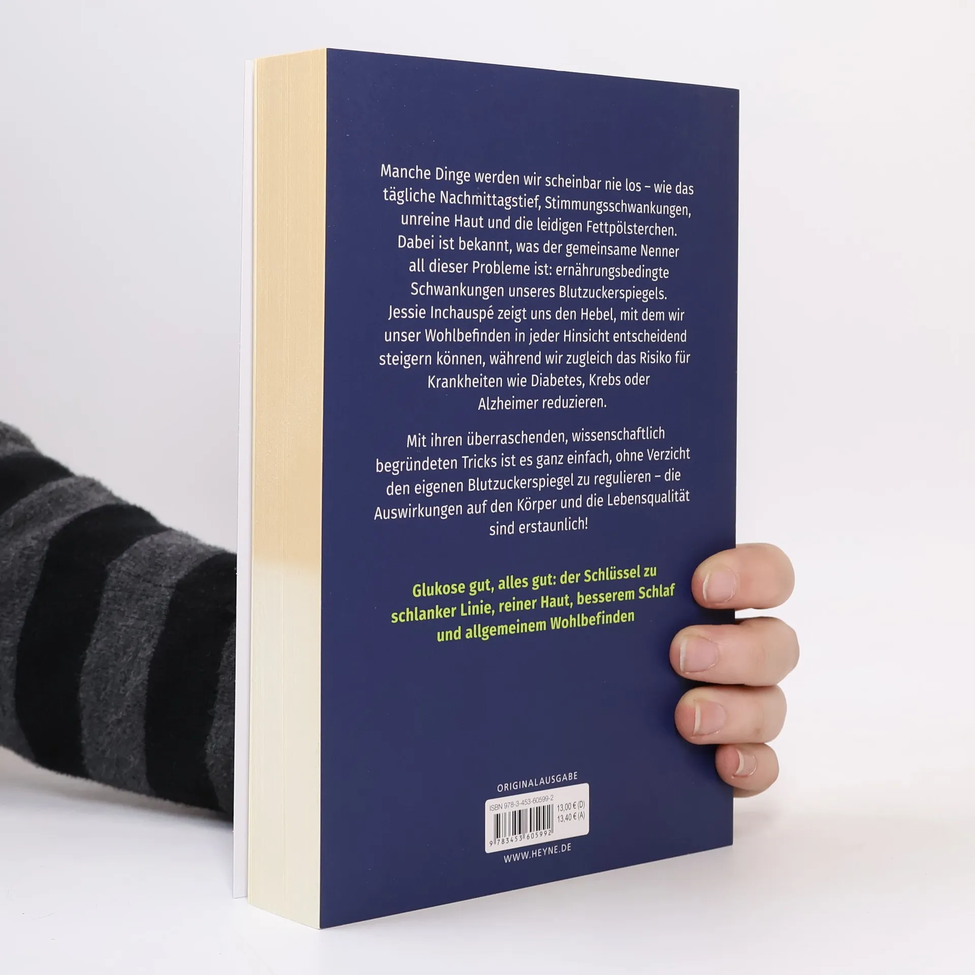 Welches Frühstück löst Fressattacken aus? Welches Essen verursacht Stimmungsschwankungen? Warum ist Salat die beste Vorspeise und weshalb ist die Reihenfolge beim Essen relevant? Manche Dinge werden wir scheinbar nie los – wie das tägliche Nachmittagstief, Stimmungsschwankungen, unreine Haut und die leidigen Fettpölsterchen. Jessie Inchauspé weiß genau, was der gemeinsame Nenner all dieser Probleme ist: ernährungsbedingte Schwankungen unseres Blutzuckerspiegels. Sie zeigt uns damit einen Hebel, mit dem man sein Wohlbefinden in jeder Hinsicht entscheidend steigern kann, während man zugleich das Risiko für Krankheiten wie Diabetes, Krebs oder Alzheimer reduziert. Dabei ist es überraschend einfach, den eigenen Blutzuckerspiegel zu regulieren – die Auswirkungen auf unseren Körper und unsere Lebensqualität sind erstaunlich. Mit unkomplizierten Tricks können wir unsere Ernährung anpassen und uns endlich in unserem Körper wohlfühlen – ohne auf etwas verzichten zu müssen! „Dieser praktische Leitfaden ist voll von fantastischen Tipps und Tricks, wie und was man essen kann; ein Muss für jeden, der seinen Körper verstehen und seine Gesundheit verbessern will.“ – Professor Tim Spector, Professor für genetische Epidemiologie am King's College, London „Der Glukose Trick wird Ihnen helfen, sich besser zu fühlen, seltener Heißhunger zu haben, mehr zu sich selbst zu finden, Ihre Hormone auszugleichen, länger zu leben, etwas über Wissenschaft zu lernen – und Ihnen dabei auch noch ein Lächeln ins Gesicht zaubern.“ – Davinia Taylor, britische Schauspielerin und Sunday Times Bestseller Autorin „Der beste praktische Leitfaden, um den Glukosehaushalt für gute Gesundheit und ein langes Leben zu optimieren.“ – David Sinclair Leserstimmen „Es funktioniert – wenn ich mich daran halte, habe ich keine Fressattacken.“ „Mit einfachen Tricks lernt man, wie man Süßem und Heißhungerattacken widerstehen kann. Nicht nur hilfreich, sondern auch motivierend.“ „Habe durch die Anwendung der „Hacks“ schon einen klareren Kopf und nicht mehr diese Konzentrationsprobleme. Es ist so ein Geschenk!“ „Hilft dabei, schlechte Ernährungsgewohnheiten schnell und mit eindrucksvollen positiven Effekten zu ändern“ „Wissenschaftliche Erkenntnisse werden mit bildhafter Darstellung sehr gut erklärt. Man will direkt mit den Hacks beginnen. Werde das Buch auf jeden Fall weiter empfehlen.“ Ausstattung: durchg. 2c