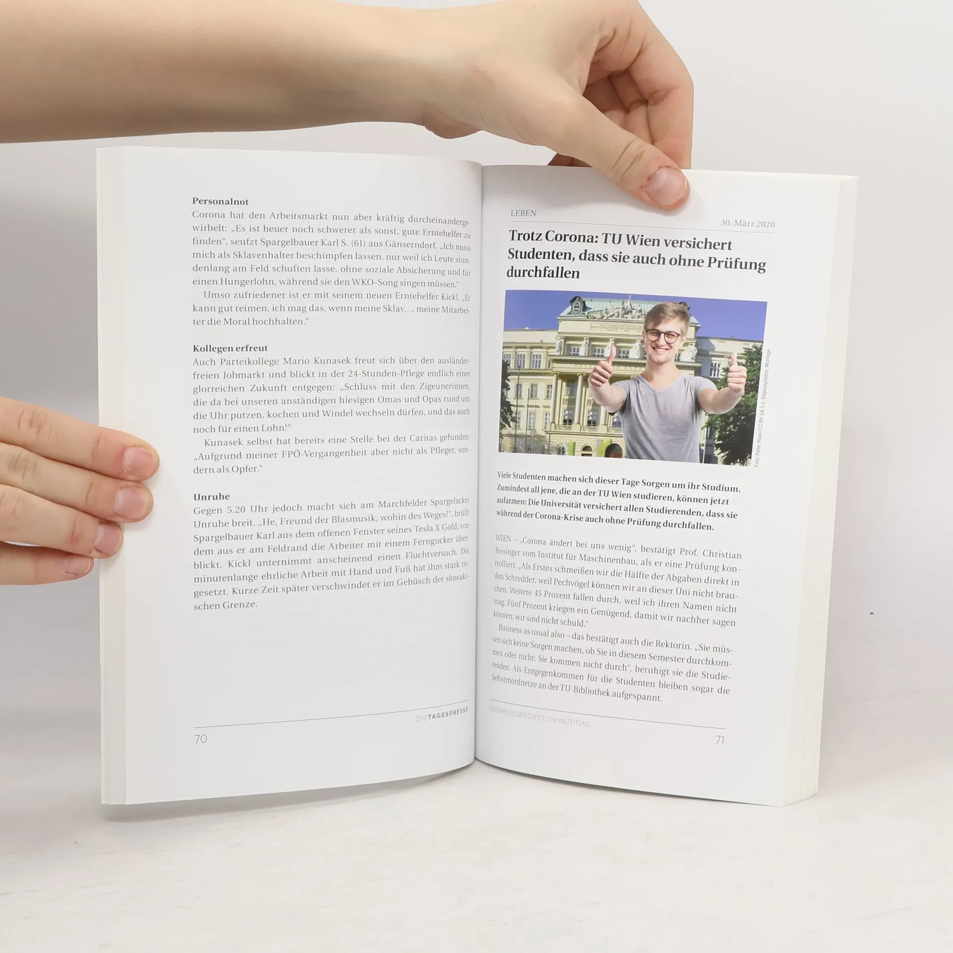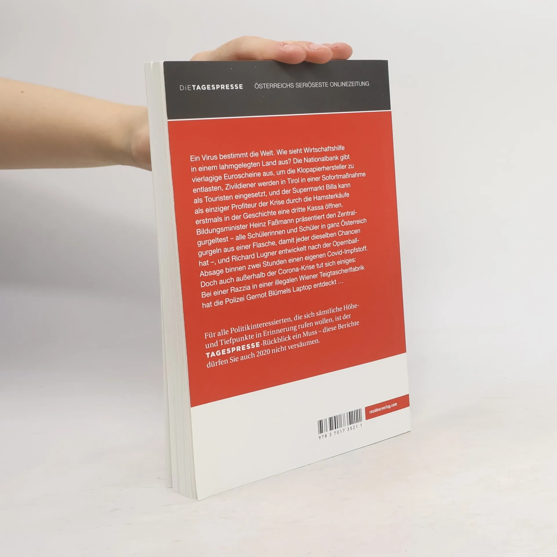 Ein Virus bestimmt die Welt. Wie sieht Wirtschaftshilfe in einem lahmgelegten Land aus? Die Nationalbank gibt vierlagige Euroscheine aus, um die Klopapierhersteller zu entlasten, Zivildiener werden in Tirol in einer Sofortmaßnahme als Touristen eingesetzt, und der Supermarkt Billa kann als einziger Profiteur der Krise durch die Hamsterkäufe erstmals in der Geschichte eine dritte Kassa öffnen. Bildungsminister Heinz Faßmann präsentiert den Zentralgurgeltest – alle Schülerinnen und Schüler in ganz Österreich gurgeln aus einer Flasche, damit jeder dieselben Chancen hat –, und Richard Lugner entwickelt nach der Opernball-Absage binnen zwei Stunden einen eigenen Covid-Impfstoff. Doch auch außerhalb der Corona-Krise tut sich einiges: Bei einer Razzia in einer illegalen Wiener Teigtascherlfabrik hat die Polizei Gernot Blümels Laptop entdeckt.