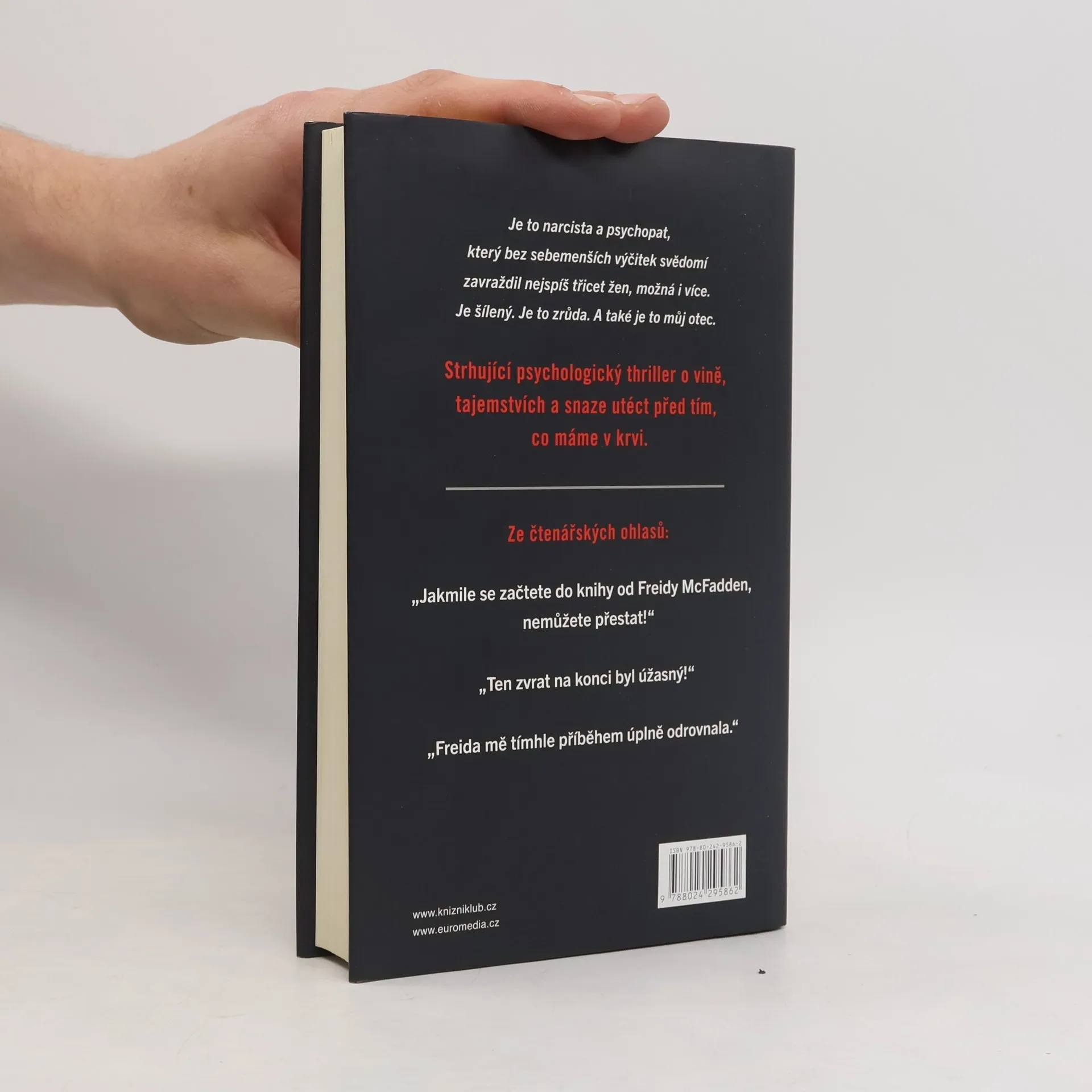 Když si Nora Davisová dělala jako malá v pokojíčku úkoly, netušila, že její otec zatím ve sklepě vraždí ženy. Až do dne, kdy se jim u dveří objevila policie. O desítky let později je Nořin otec stále za mřížemi a ona je úspěšná chirurgyně s poklidným a osamělým životem. Nikdo netuší, že její otec byl sériový vrah. Pak však Nora zjistí, že jedna z jejích pacientek byla zavražděna – a to stejně děsivým a jedinečným způsobem, jakým vraždil i její otec. Někdo ví, kdo Nora je, a chce, aby za ten hrůzný zločin nesla zodpovědnost. Jenže ona není vrah. Policie jí nemůže nic přišít. Pokud se jí tedy někdo nepodívá do sklepa…