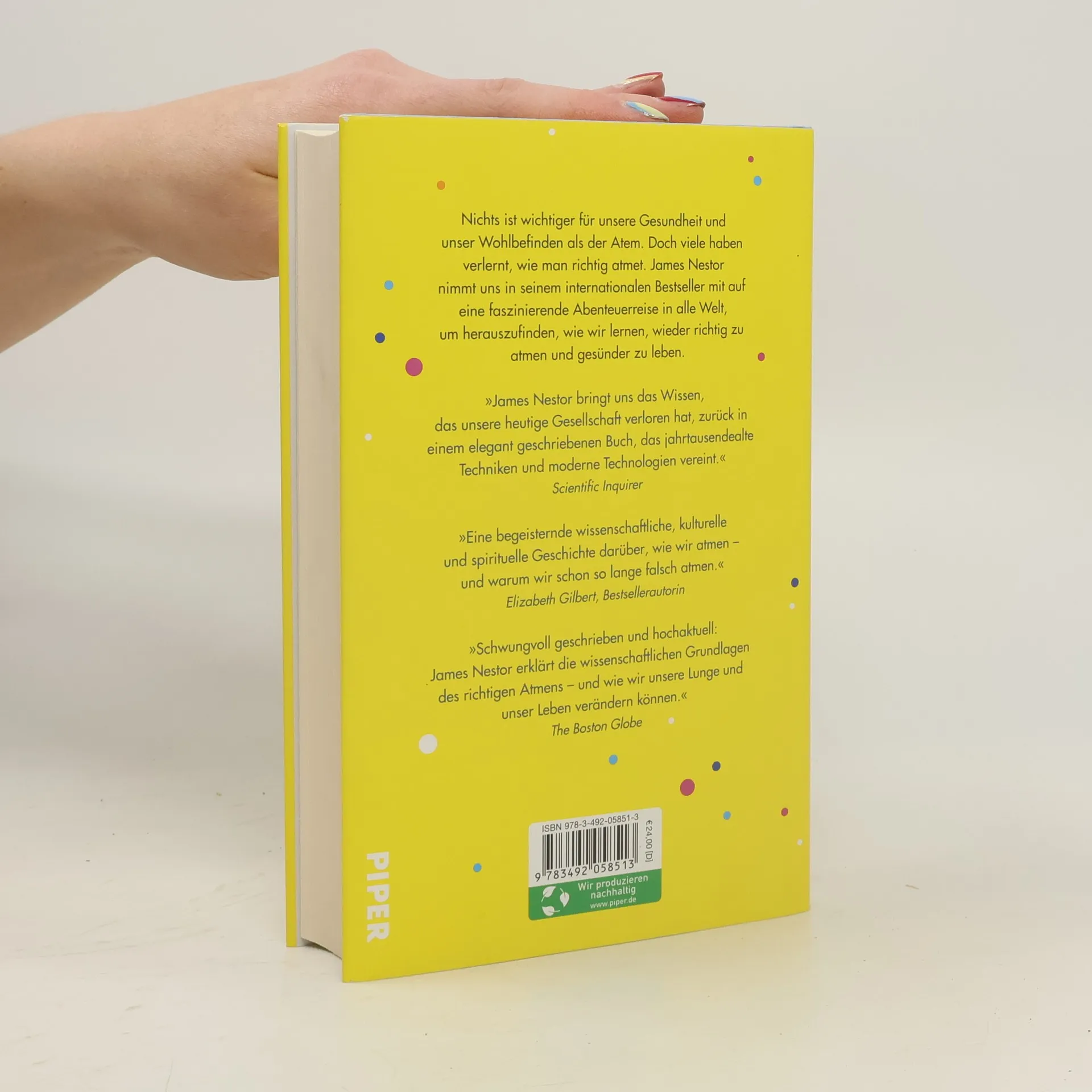 Atmen heißt Leben - James Nestor bringt uns die verlorene Kunst des guten Atmens näher. Die Atmung ist die einzige Körperfunktion, die wir wirklich kontrollieren können, bei der jedoch oft Fehler passieren. Richtiges Atmen kann helfen, Gewicht zu verlieren, die Gesundheit zu verbessern und sogar das Leben zu verlängern. Wer gut atmet, ist selbstbewusster und fokussierter. Nestors Leben war einst chaotisch: gesundheitliche Probleme, Stress und eine dritte Lungenentzündung prägten seinen Alltag. Dies änderte sich, als er einen Kurs für Sudarshan-Kriya-Atmung besuchte. Bis zu diesem Zeitpunkt hatte er sich wenig mit diesem lebenswichtigen Akt beschäftigt. Nach der ersten Sitzung fühlte er sich jedoch deutlich besser und schlief besser als je zuvor, indem er sich auf langsame Atemzüge durch die Nase konzentrierte. Nach zehn Jahren akribischer Forschung, Experteninterviews und dem Testen verschiedener Atemtechniken zeigt Nestor, was Atmung in unserem Körper bewirken kann. Er kombiniert Wissen von Schwimmtrainern, indischen Mystikern und russischen Kardiologen, um die vielfältigen Auswirkungen der Atmung zu verdeutlichen. Diese aufschlussreiche Odyssee durch die faszinierende Welt des Atmens ist nicht nur informativ, sondern auch ein Selbstversuch, der das Buch besonders überzeugend macht. „Rund 10.000 Atemzüge braucht es, sein Buch durchzulesen“, sagt Nestor. Die Mühe lohnt sich – nicht nur wegen der erstaunlichen Fakten, sonde