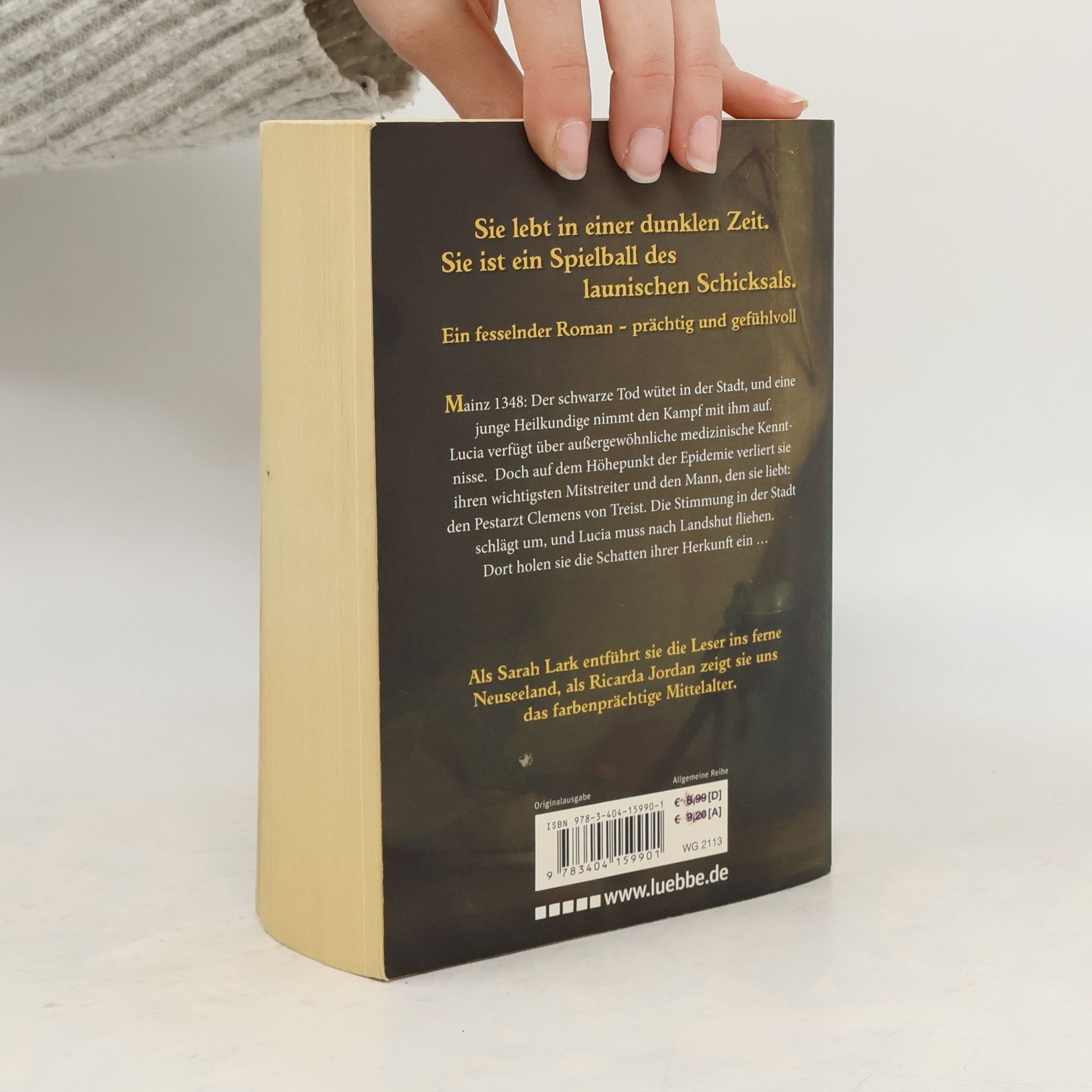 Mainz, 1348: Der schwarze Tod wütet in der Stadt, und eine junge Heilkundige nimmt den Kampf mit ihm auf: Lucia verfügt über außergewöhnliche medizinische Kenntnisse. Doch auf dem Höhepunkt der Epidemie verliert sie ihren wichtigsten Mitstreiter und den Mann, den sie liebt: den Pestarzt Clemens von Treist. Die Stimmung in der Stadt schlägt um, und Lucia muss nach Landshut fliehen. Dort holen sie die Schatten ihrer Herkunft ein ... Bestsellerautorin Sarah Lark schreibt als Ricarda Jordan.