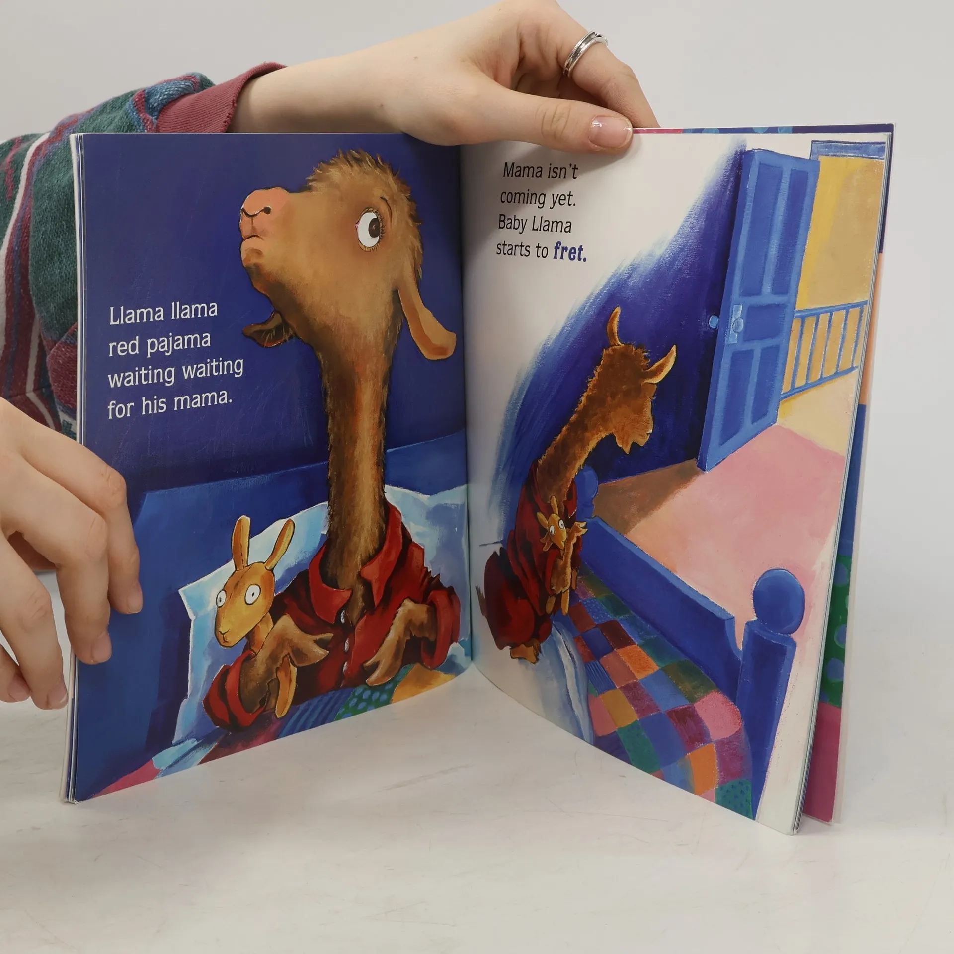 At bedtime, a little llama worries after his mother puts him to bed and goes downstairs.