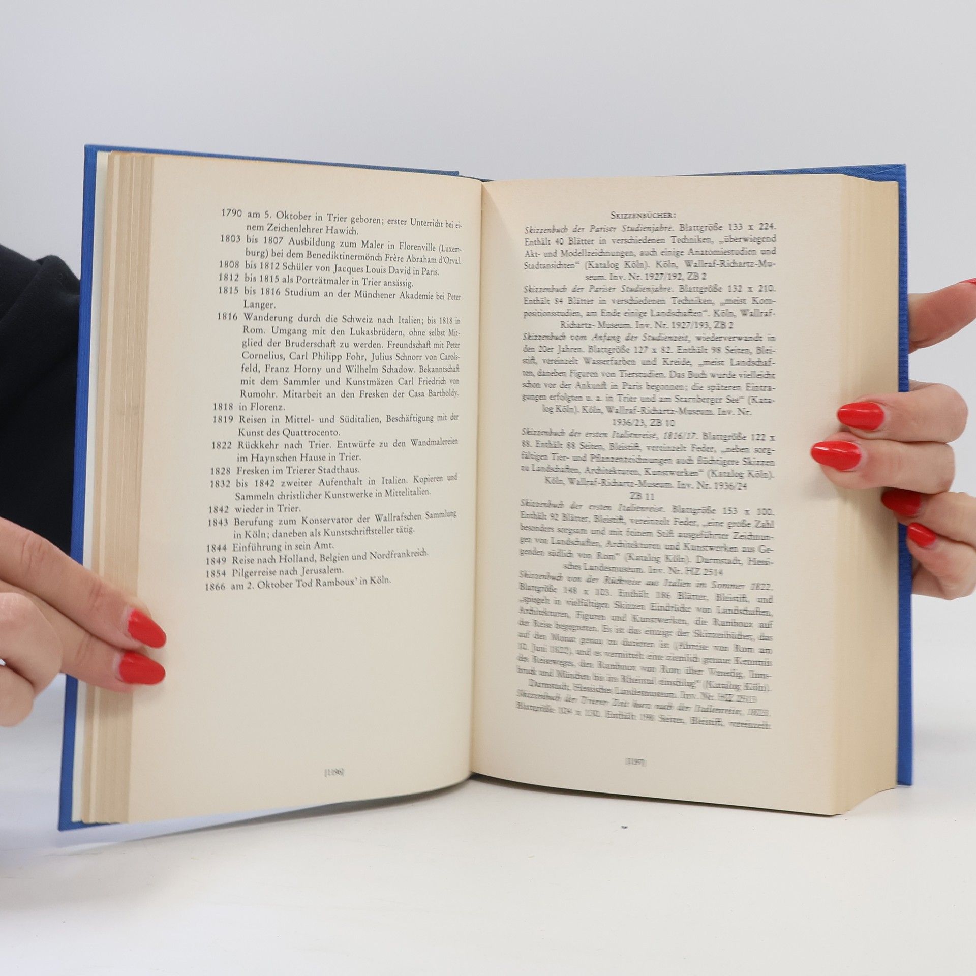 2 volume set, 2016 pages total. Text in German. 2. neu durchgesehene Auflage = 2nd newly revised edition, 1974. [Excerpt from front jacket flap] Die deutsche Romantik, eine der genialsten und vielschichtigsten Epochen der Kunst, hat viele Facetten. Nie zuvor und nie wieder nachher gab es ein so intimes Zusammenspiel und Ineinandergreifen samtlicher Kunste und auch der Dichter komponierten, Baumeister malten, Maler dichteten, Freunde schufen gemeinsame Werke, das Ideal war das progressive Universalgenie, das Gesamtkunstwerk. Ein Zentrum, das Zentrum der Hochromantik, war Rom und seine Umgebung. Hier fanden sich die Lukasbruder, die altdeutsche und altitalienische Kunst erneuern wollten, unter ihnen die Bruder Olivier, Pforr, Overbeck, Veit, Schnorr und der spatere Munchner Akademielehrer Cornelius; hier arbeiteten die Fruhvollendeten Fohr und Horny, war der alte, barbeissige Koch den Jungen Lehrer und Vorbild. Zwei der bedeutendsten Zeichiner der Romantik haben dagegen, ihrer Eigenart entsprechend, Italien nie gesehen — Runge und Friedrich verkorperten mit Carus, Dahl, Kersting und Speckter das nordische auch das norddeutsche Element im Gegensatz zur italienita. Eine deutliche Achse verlauft zwischen Friedrichs und Runges Werken zu den lichten Landschaften der Kunstler in Rom, vom Norden zum Suden hin.
