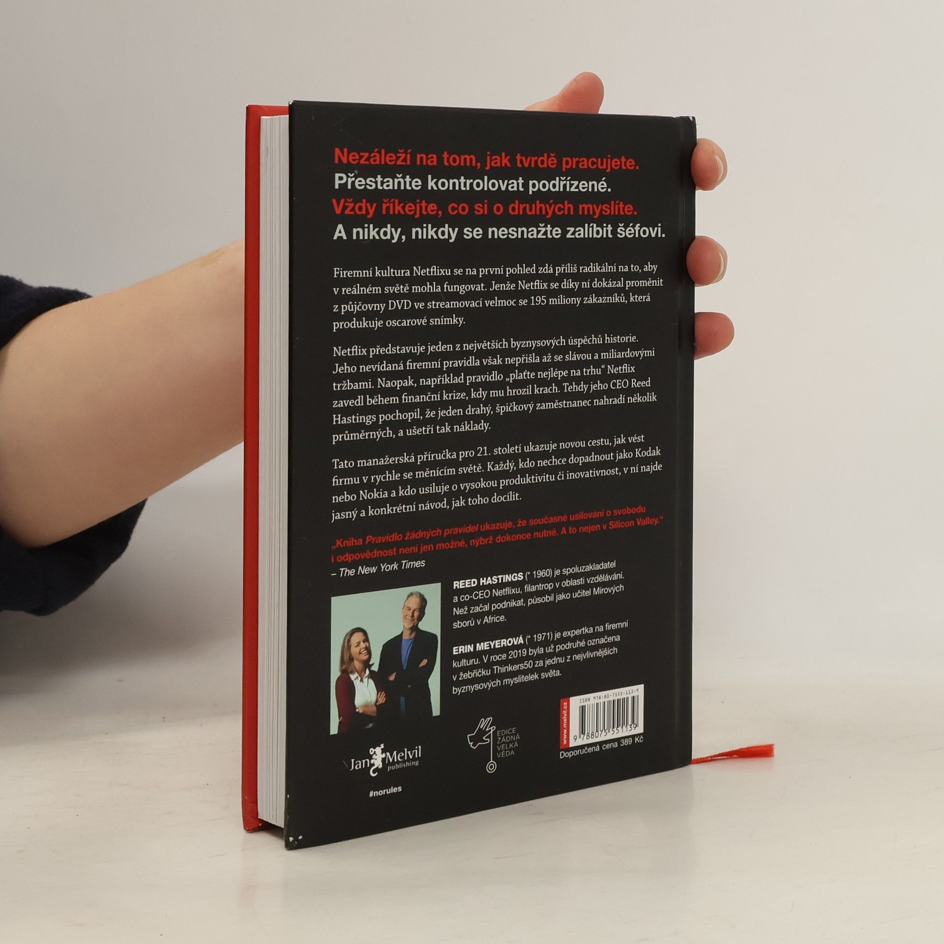 „Než přišel Netflix, nikdy předtím neexistovala společnost jako Netflix.“ Tato revoluční firma generuje miliardové roční příjmy a oslovuje stovky milionů lidí ve více než 190 zemích. Klíčovým faktorem úspěchu je kultura nastavená Reedem Hastingsem, která může na první pohled působit radikálně. Díky této kultuře zaměřené na svobodu a odpovědnost se Netflix dostal na vrchol. V tomto světovém bestselleru spoluzakladatel Hastings odhaluje vnitřní fungování Netflixu: jak nastavuje nové standardy, váží si lidí více než procesů, upřednostňuje inovace před efektivitou a zaměstnance nekontroluje. Neexistují žádná pravidla pro dovolenou ani výdaje. Zaměstnanci se nesnaží potěšit své nadřízené, ale poskytují upřímnou zpětnou vazbu. Tyto neobvyklé metody vedly k bezkonkurenční rychlosti inovací a Netflix se stal jednou z nejoblíbenějších značek na světě. Tato kniha je výbornou a čtivou byznysovou příručkou, která dramaticky proplétá historii Netflixu. Je určena pro ty, kdo vedou týmy, firmy, budují startupy nebo pracují v organizacích, které chtějí zlepšovat.