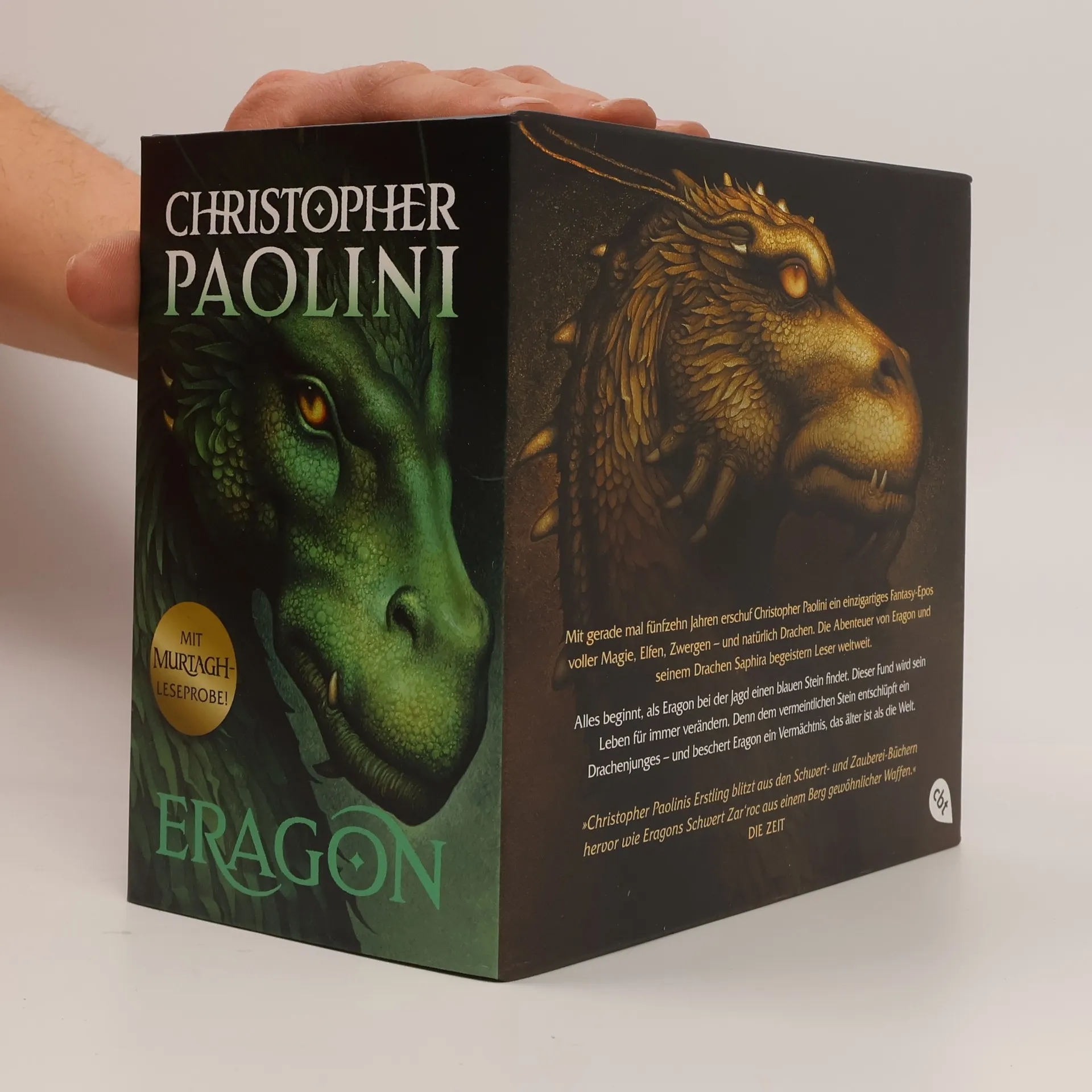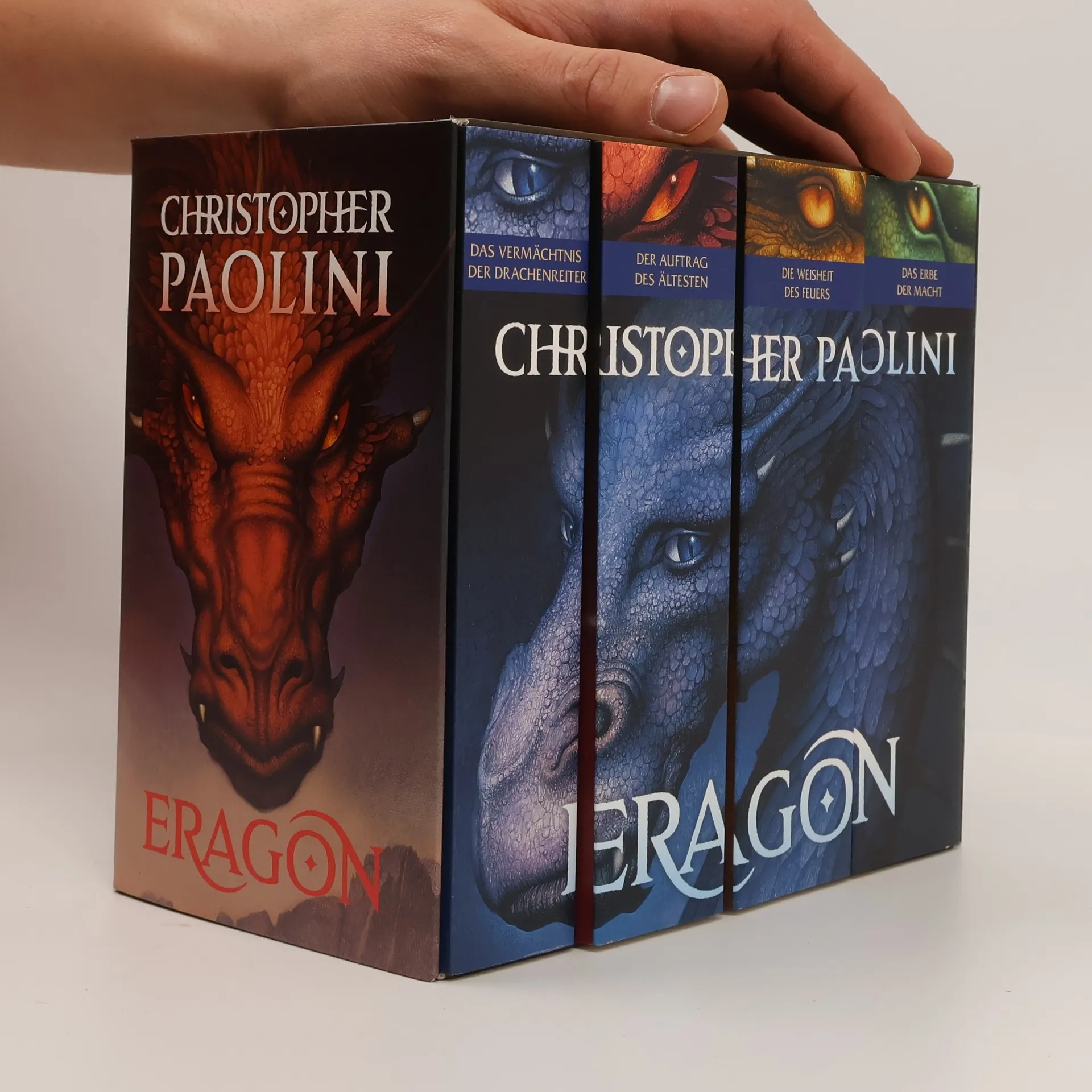 Mehr als 3.500 Seiten epische Fantasy - die vier Bände der Weltbestseller-Drachenreitersaga »Eragon« Der attraktive Schuber zum Vorteilspreis enthält die vier Weltbestseller-Eragon-Romane »Das Vermächtnis der Drachenreiter«, »Der Auftrag des Ältesten«, »Die Weisheit des Feuers« und »Das Erbe der Macht«. Als Erbe der legendären Drachenreiter stellt sich Eragon gemeinsam mit seinem blauen Drachen Saphira dem Kampf gegen den grausamen Herrscher Alagaësias. Das Schicksal aller liegt in seiner Hand ... Alles beginnt, als Eragon bei der Jagd einen blauen Stein findet. Dieser Fund wird sein Leben für immer verändern. Denn dem vermeintlichen Stein entschlüpft ein Drachenjunges – und beschert Eragon ein Vermächtnis, das älter ist als die Welt. Mit seiner Drachenreitersaga Eragon begeistert Christopher Paolini ein Millionenpublikum. Alte Fans und neue Leser*innen lieben Alagaësia, die fantastische und faszinierende Welt der Drachenreiter, die Christopher Paolini mit seinem im November 2023 erscheinenden neuen Roman »Murtagh« noch weiter ausbaut. Alle Bände der World of Eragon : Eragon. Das Vermächtnis der Drachenreiter (Band 1) Eragon. Der Auftrag des Ältesten (Band 2) Eragon. Die Weisheit des Feuers (Band 3) Eragon. Das Erbe der Macht (Band 4) Die Gabel, die Hexe und der Wurm. Geschichten aus Alagaësia (Zusatzband) Murtagh – Eine dunkle Bedrohung