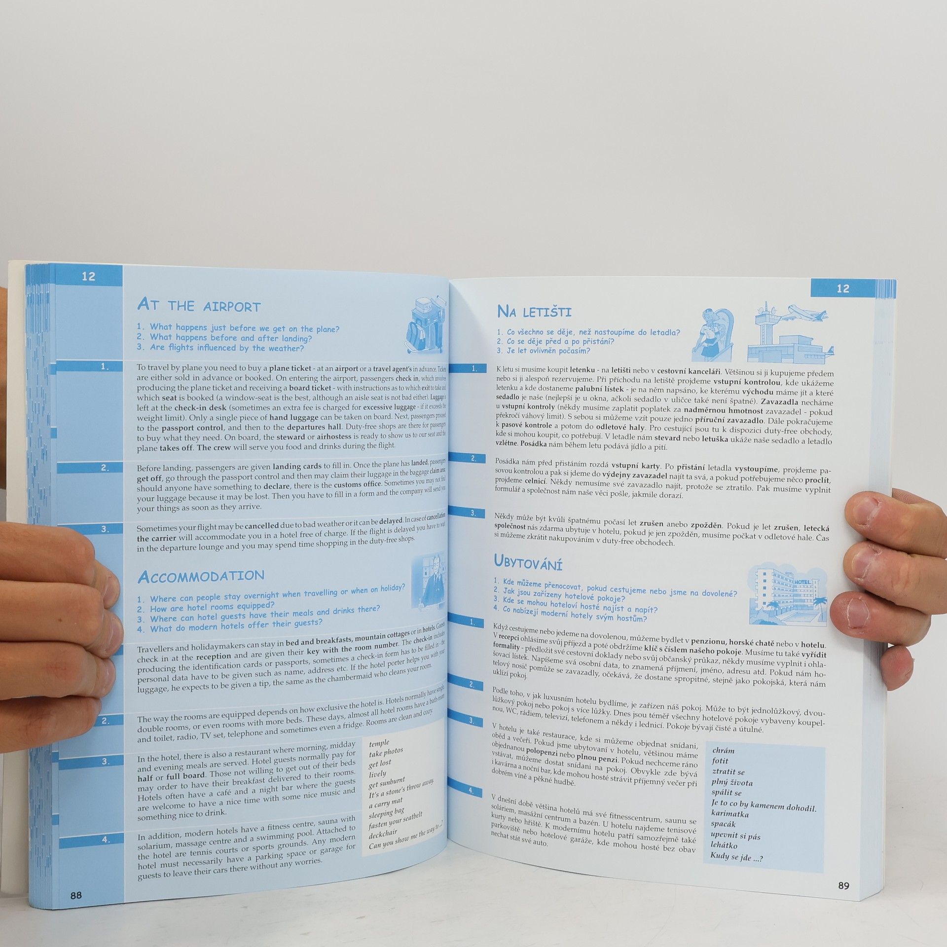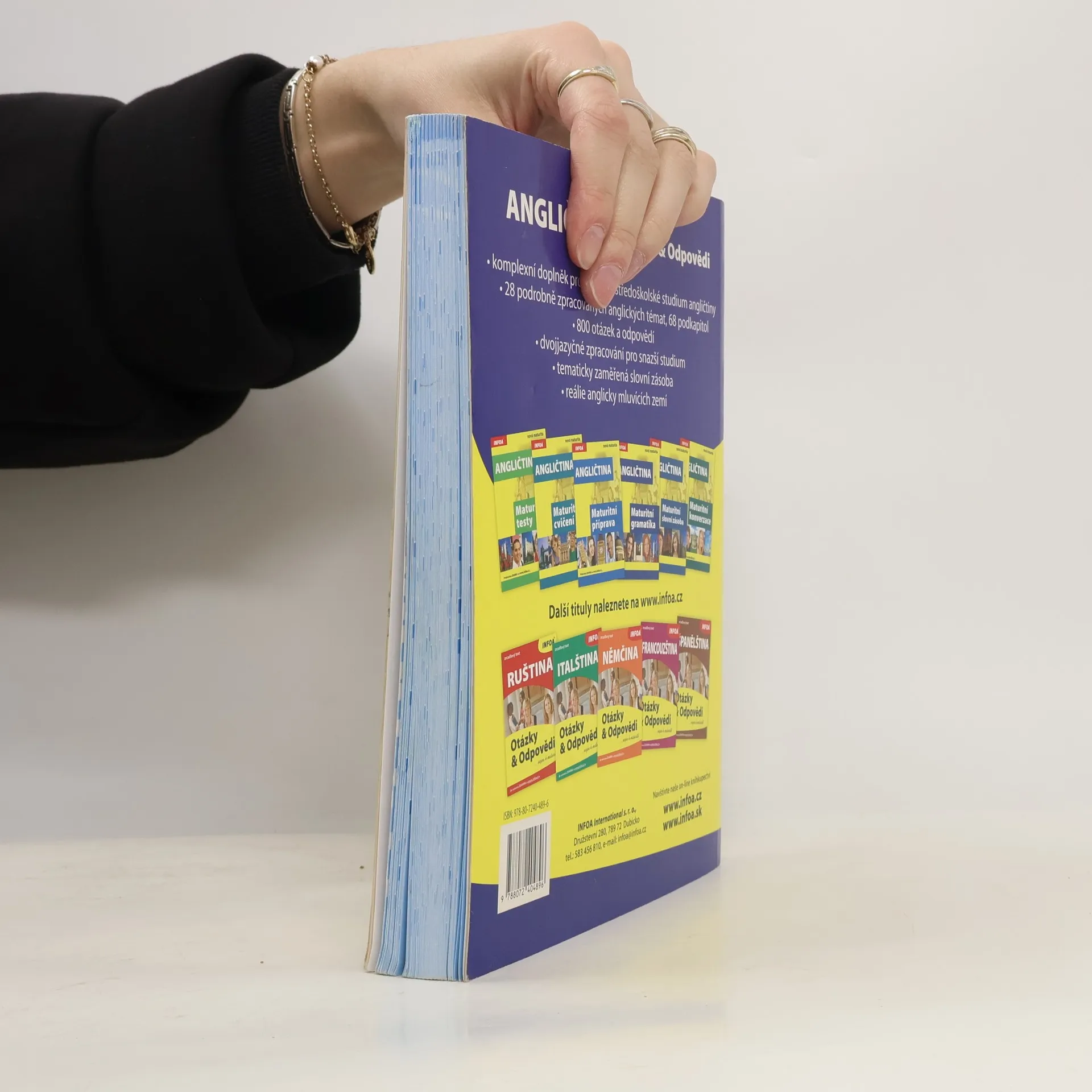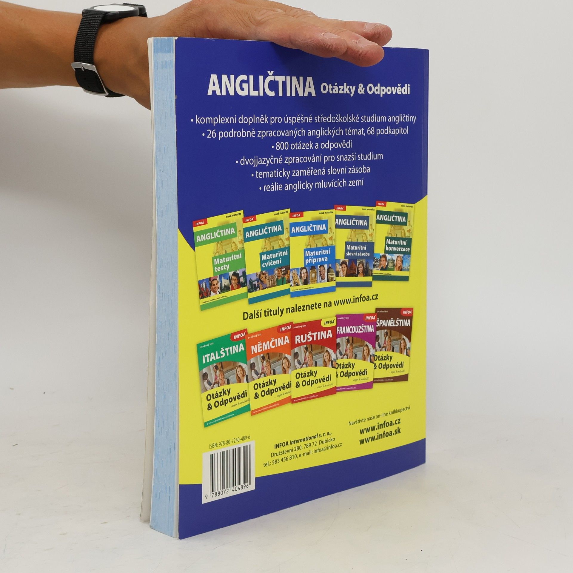 Komplexní doplněk pro úspěšné stredoškolské studium angličtiny, 28 podrobně zpracovaných témat, 68 podkapitol, 800 otázek a odpovědí, dvojjazyčné zpracování pro snazší studium, tematicky zaměřená slovní zásoba, reálie anglicky mluvících zemí, nahrávka anglických textů namluvená rodilými mluvčími V knize najdete podrobně zpracovaná témata: Rodinný život, Bydlení, Denní režim, Volný čas a zábava, Dnešní mládež, Škola a vzdělání, Volba povolání, Životopis, Pokrmy, Nakupování, Služby, Sport, Cestování, Zdraví a nemoci, Svátky, Móda a oblečení, Počasí a příroda, Umění a kultura, Média, Věda a technika, Evropská unie, Česká republika, Praha atd. Z anglických reálií témata: Spojené království Velké Británie a Severního Irska, Londýn, Spojené státy americké, Washington D. C. a jiná města v USA, Britské společenství, Anglická a americká literatura, Anglický jazyk