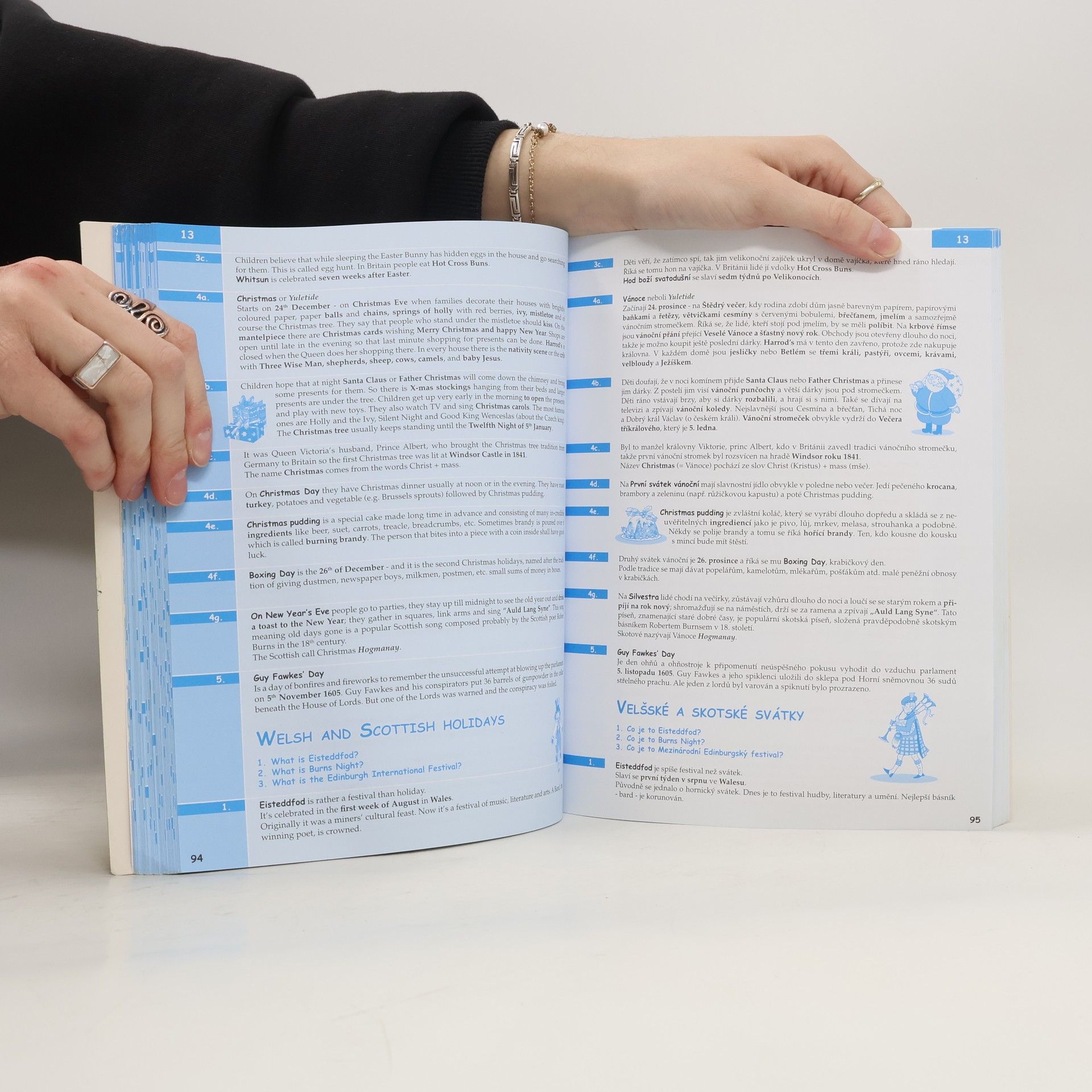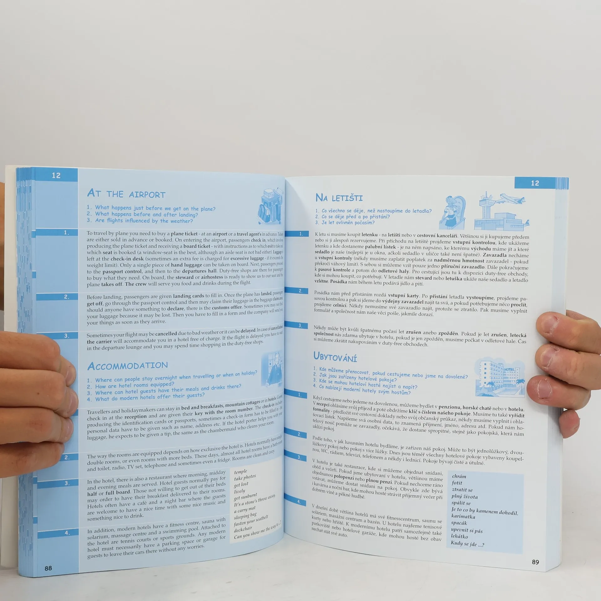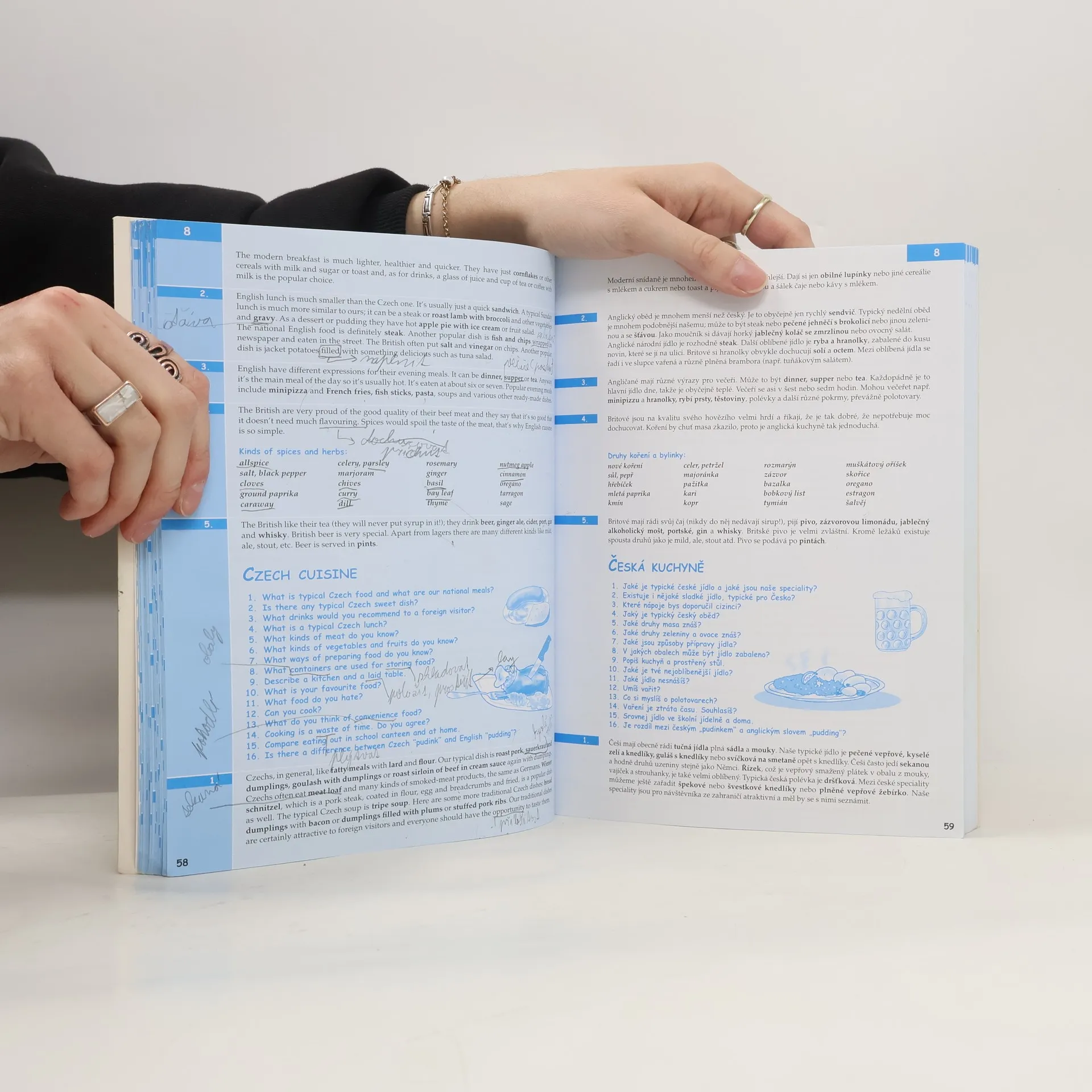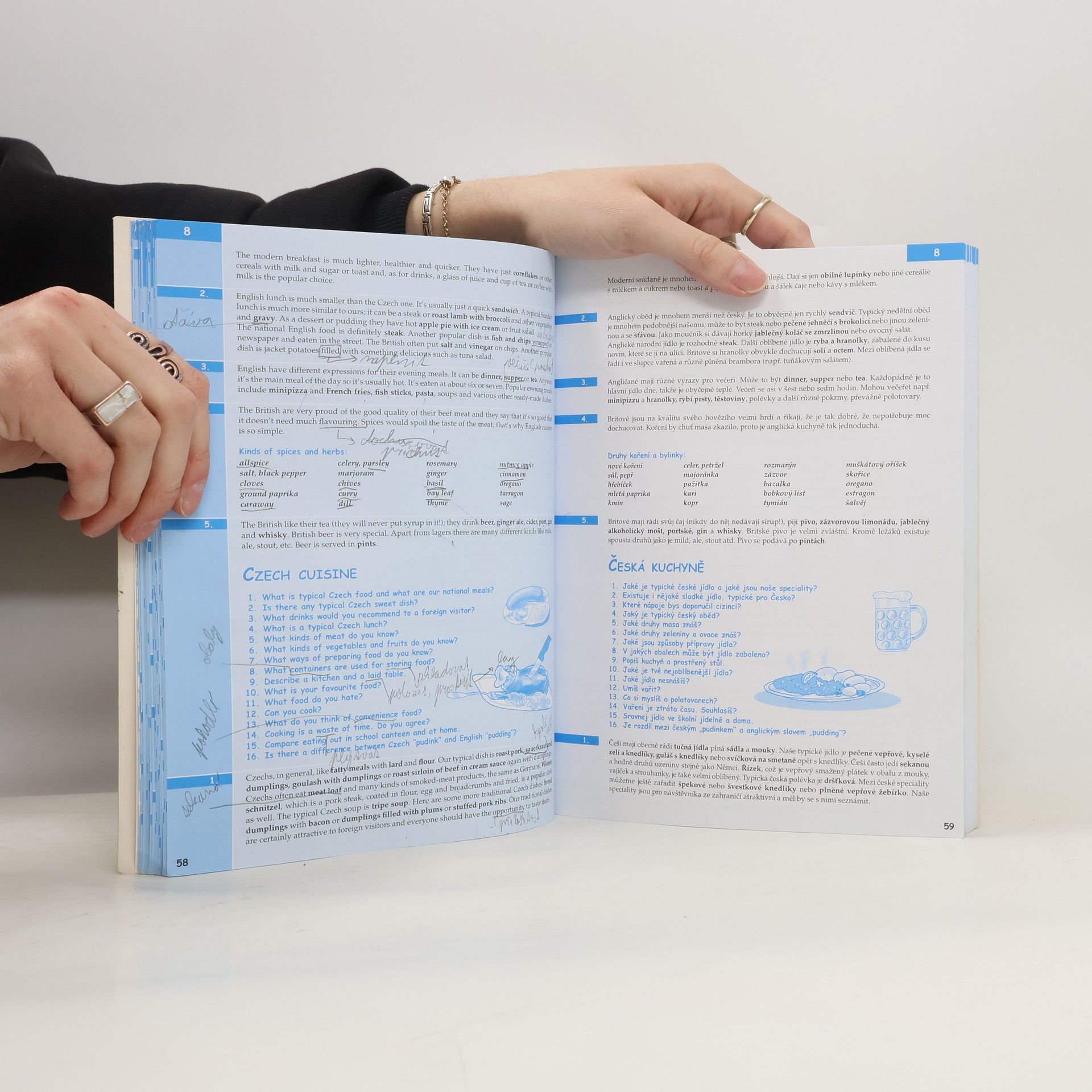Komplexní doplněk pro úspěšné stredoškolské studium angličtiny, 28 podrobně zpracovaných témat, 68 podkapitol, 800 otázek a odpovědí, dvojjazyčné zpracování pro snazší studium, tematicky zaměřená slovní zásoba, reálie anglicky mluvících zemí, nahrávka anglických textů namluvená rodilými mluvčími V knize najdete podrobně zpracovaná témata: Rodinný život, Bydlení, Denní režim, Volný čas a zábava, Dnešní mládež, Škola a vzdělání, Volba povolání, Životopis, Pokrmy, Nakupování, Služby, Sport, Cestování, Zdraví a nemoci, Svátky, Móda a oblečení, Počasí a příroda, Umění a kultura, Média, Věda a technika, Evropská unie, Česká republika, Praha atd. Z anglických reálií témata: Spojené království Velké Británie a Severního Irska, Londýn, Spojené státy americké, Washington D. C. a jiná města v USA, Britské společenství, Anglická a americká literatura, Anglický jazyk