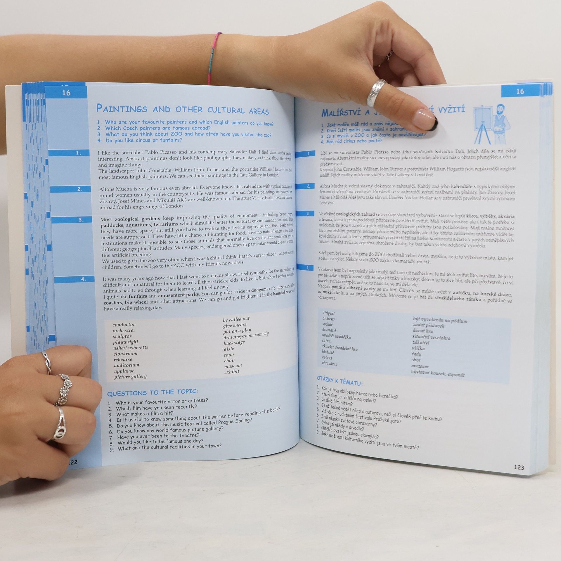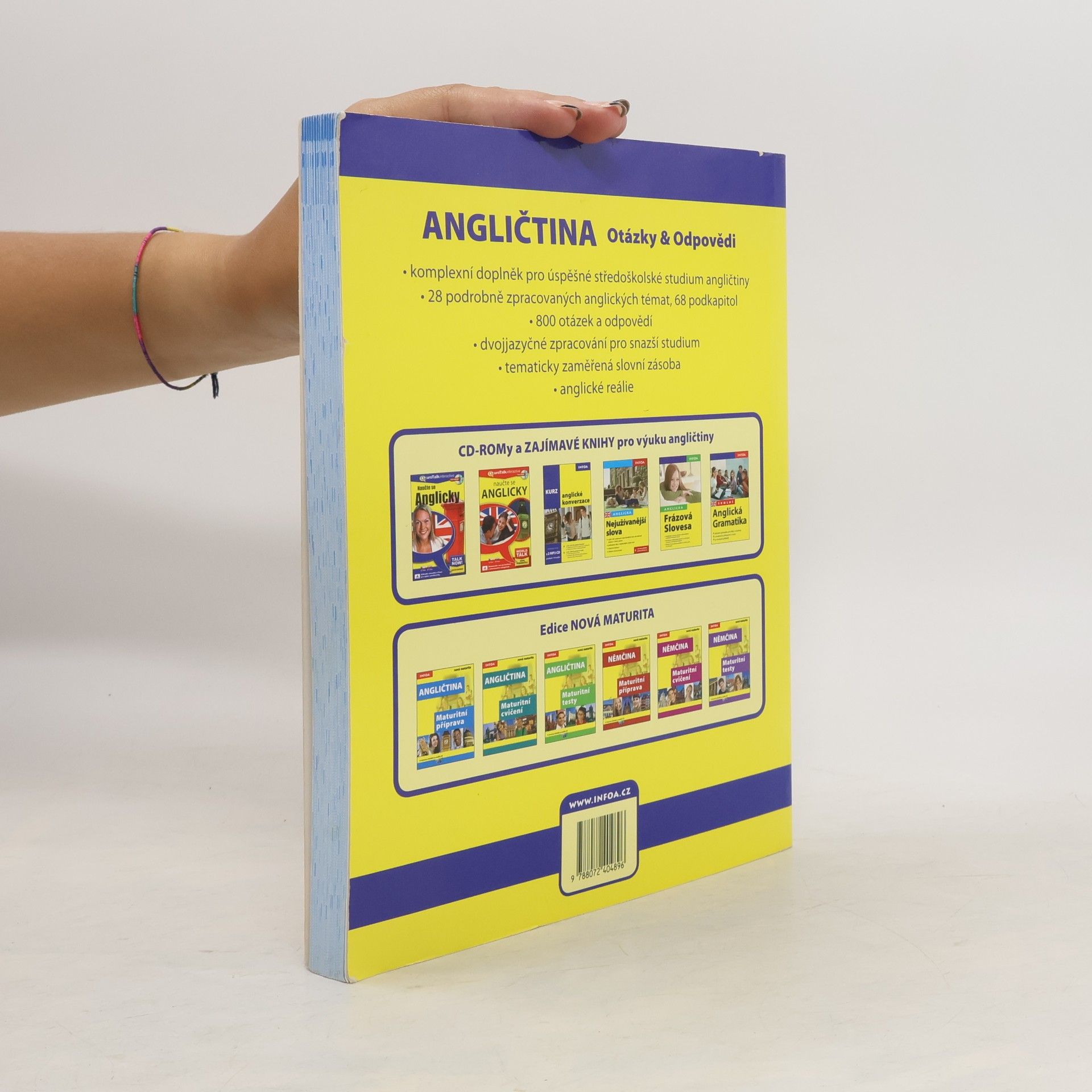 Komplexní doplněk pro úspěšné stredoškolské studium angličtiny, 28 podrobně zpracovaných témat, 68 podkapitol, 800 otázek a odpovědí, dvojjazyčné zpracování pro snazší studium, tematicky zaměřená slovní zásoba, reálie anglicky mluvících zemí, nahrávka anglických textů namluvená rodilými mluvčími V knize najdete podrobně zpracovaná témata: Rodinný život, Bydlení, Denní režim, Volný čas a zábava, Dnešní mládež, Škola a vzdělání, Volba povolání, Životopis, Pokrmy, Nakupování, Služby, Sport, Cestování, Zdraví a nemoci, Svátky, Móda a oblečení, Počasí a příroda, Umění a kultura, Média, Věda a technika, Evropská unie, Česká republika, Praha atd. Z anglických reálií témata: Spojené království Velké Británie a Severního Irska, Londýn, Spojené státy americké, Washington D. C. a jiná města v USA, Britské společenství, Anglická a americká literatura, Anglický jazyk