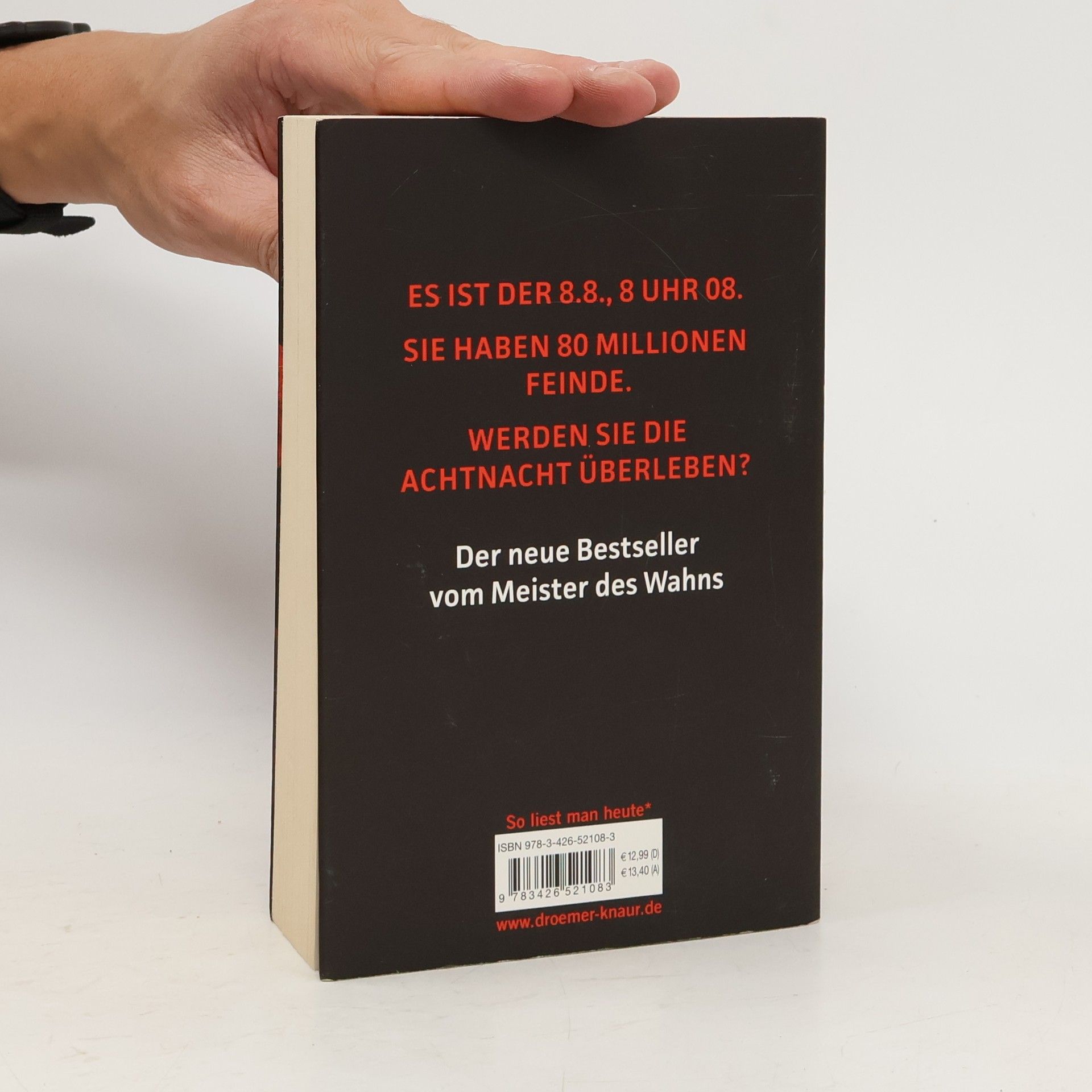 Ein furioser Thriller von Sebastian Fitzek, basierend auf einer großartigen Wahn-Idee: Was wäre, wenn du einen Menschen deiner Wahl straflos töten darfst? Es ist der 8. 8., acht Uhr acht. Du hast 80 Millionen Feinde. Wirst du die AchtNacht überleben? Stell dir vor, es gibt eine Todeslotterie. Du kannst den Namen eines verhassten Menschen in einen Lostopf werfen. In der „AchtNacht“, am 8. 8. jedes Jahres, wird aus allen Vorschlägen ein Name gezogen. Der Auserwählte ist eine AchtNacht lang geächtet, vogelfrei. Jeder in Deutschland darf ihn straffrei töten - und wird mit einem Kopfgeld von zehn Millionen Euro belohnt. Das ist kein Gedankenspiel. Sondern bitterer Ernst. Es ist ein massen-psychologisches Experiment, das aus dem Ruder lief. Und dein Name wurde gezogen! Ein rasanter Action-Thriller und Bestseller von Sebastian Fitzek, dem „Meister des Wahns“ – exklusiv im Taschenbuch.