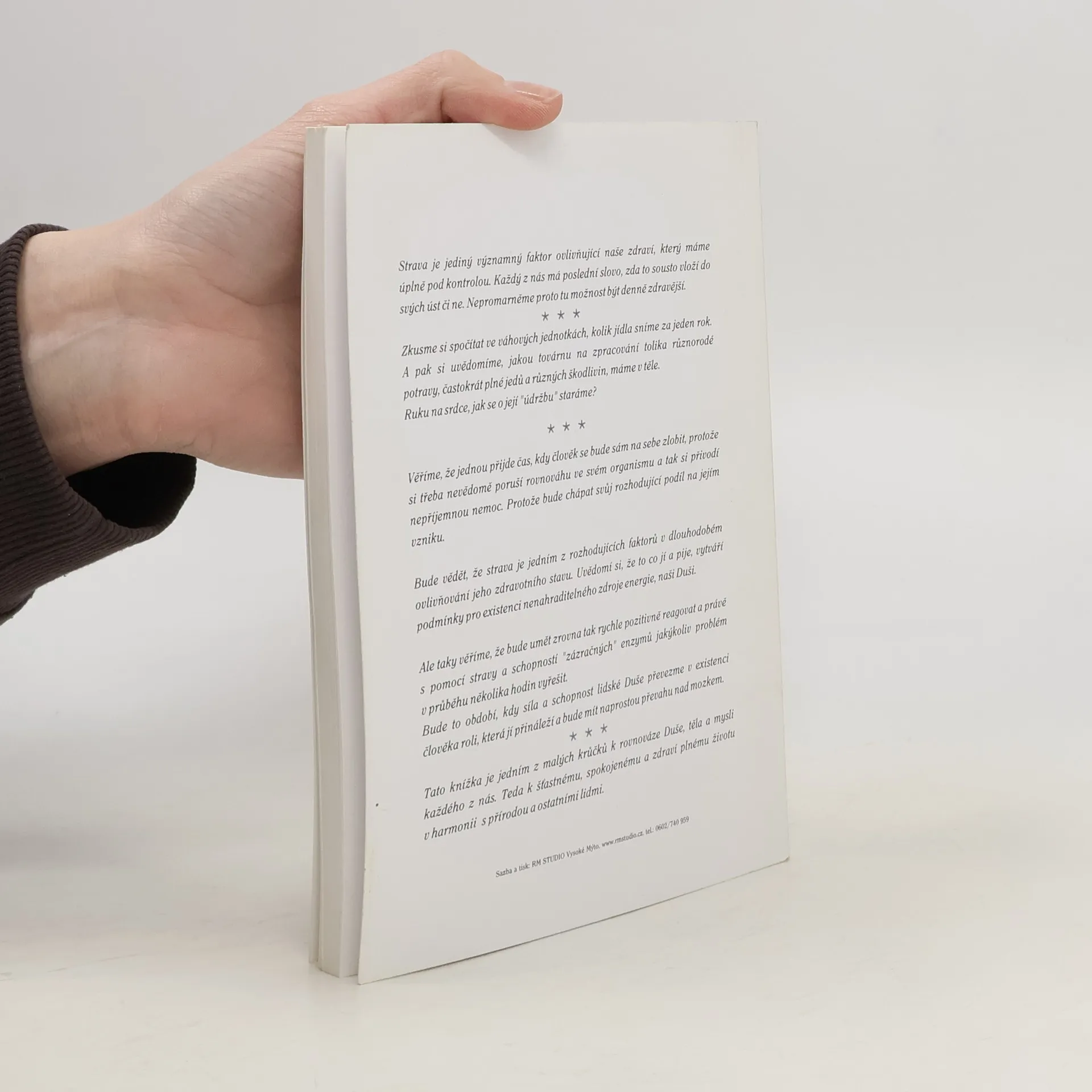 Vesmírný pohled na stravu a na naše zdraví. Strava je jediný významný faktor nášeho zdraví, ktorý máme plně pod kontrolou. Táto knížka je jedním z kroků na ceste k rovnováze duše, těla a mysli. Apeluje na naše svedomí a zodpovednost vůči sobě samým a uvádí množství důležitých informácí, údajů, rád a doporučení, které se vyplatí brát vážně.... celý text