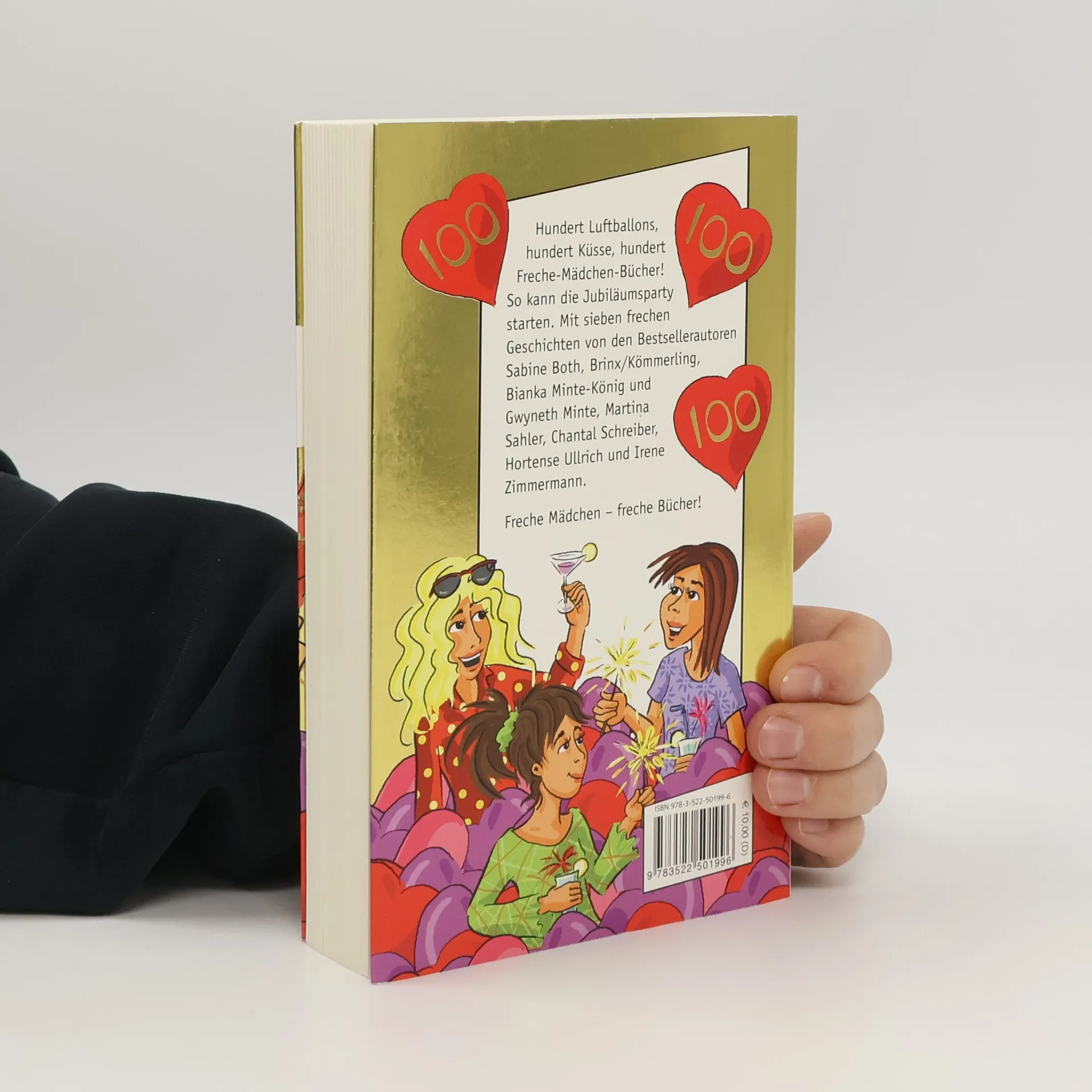 Freche Mädchen - freche Party! Jetzt wird gefeiert! Dieser Jubiläumsband enthält gleich sieben Geschichten rund um die Zahl Hundert. So muss Henri die Kussechtheit eines Lippenstifts 100-fach unter Beweis stellen. Lilly macht sich für eine 100-jährige Eiche stark und Jette und Holly für 100 arme Hunde im Tierheim. Bei Jojo soll es Rosenblüten zum 100. Kuss regnen und Maxi freut sich über 100 Gänseblümchen zum Valentinstag. Aber auch eine 100-prozentige Wette sorgt für einigen Wirbel, bevor dann alle mitzählen:. 98, 99, freche Mädchen!
