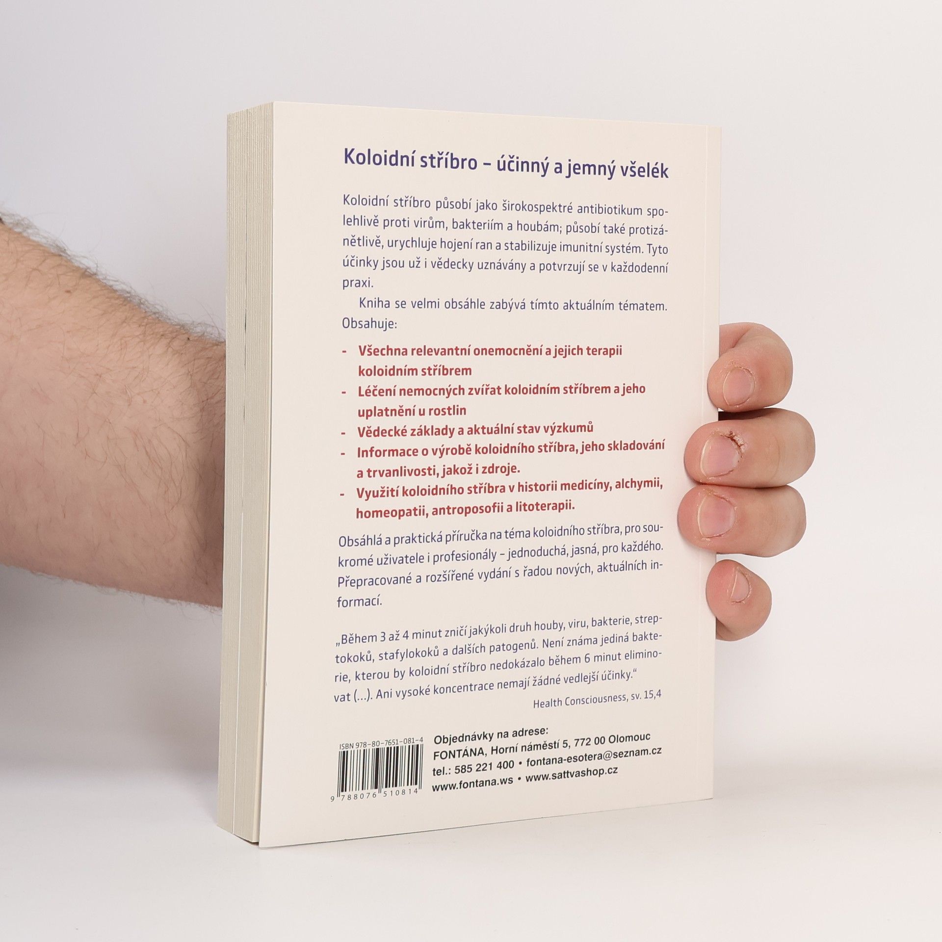 Koloidní stříbro – účinný a jemný všelék. Koloidní stříbro působí jako širokospektré antibiotikum spolehlivě proti virům, bakteriím a houbám; působí také protizánětlivě, urychluje hojení ran a stabilizuje imunitní systém. Tyto účinky jsou už i vědecky uznávány a potvrzují se v každodenní praxi. Kniha se velmi obsáhle zabývá tímto aktuálním tématem. Obsahuje: - Všechna relevantní onemocnění a jejich terapii koloidním stříbrem - Léčení nemocných zvířat koloidním stříbrem a jeho uplatnění u rostlin - Vědecké základy a aktuální stav výzkumů - Informace o výrobě koloidního stříbra, jeho skladování a trvanlivosti, jakož i zdroje. - Využití koloidního stříbra v historii medicíny, alchymii, homeopatii, antroposofii a litoterapii. Obsáhlá a praktická příručka na téma koloidního stříbra, pro soukromé uživatele i profesionály – jednoduchá, jasná, pro každého. Přepracované a rozšířené vydání s řadou nových, aktuálních informací. „Během 3 až 4 minut zničí jakýkoli druh houby, viru, bakterie, streptokoků, stafylokoků a dalších patogenů. Není známa jediná bakterie, kterou by koloidní stříbro nedokázalo během 6 minut eliminovat (…). Ani vysoké koncentrace nemají žádné vedlejší účinky.“ Health Consciousness, sv. 15,4