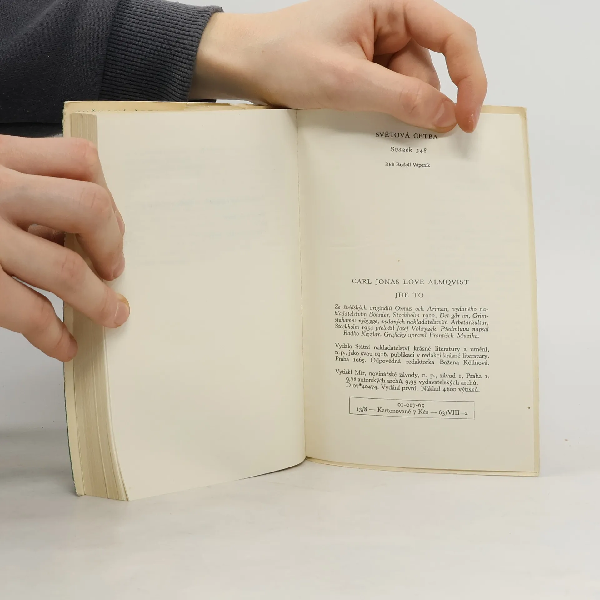 Do svazku jsou zařazeny tři novely u nás dosud neznámého švédského spisovatele, jednoho z průkopníků realismu ve švédské literatuře. V prvé (Ormus a Ariman) se vysmál byrokratům a byrokratismu ve švédském životě, v druhé (Jde to) řeší otázky nového, modernějšího vztahu mezi mužem aženou a v třetí (Grimstahamnská novina) s vřelým zaujetím vypráví o švédském venkově a jeho životě. - Předmluva: Radko Kejzlar, Neromantický romantik-realista Almqvist.