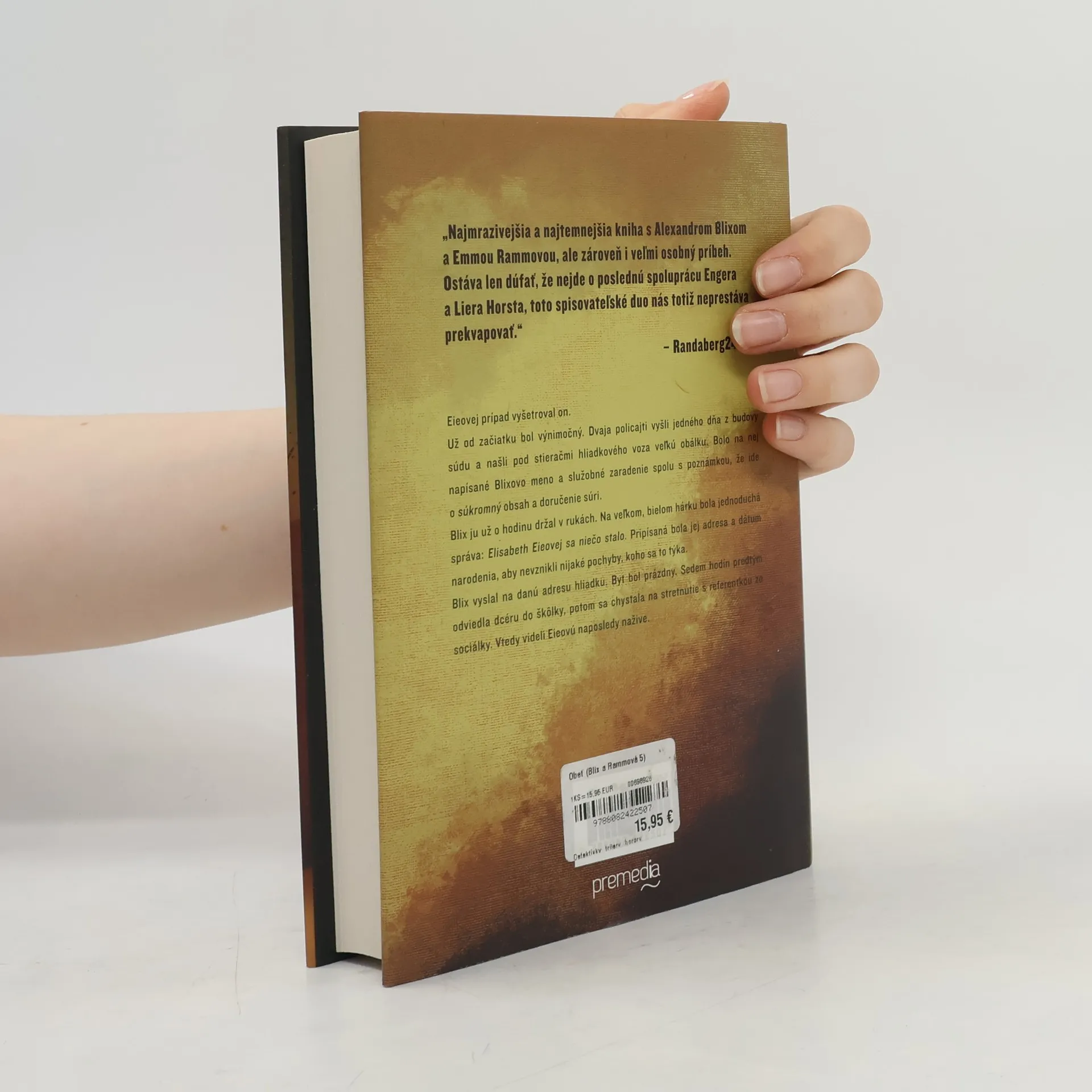 Piaty diel série, ktorá sa v Nórsku stáva fenoménom. Alexander Blix pracoval pred dvomi rokmi na prípade zmiznutia Elisabeth Eieovej. Vyšetrovanie sa zastavilo, keď bola zavraždená jeho dcéra a dlho to vyzeralo tak, že nikto nikdy nevypátra, čo sa Elisabeth prihodilo. Čo ak sa však náhle ozve niekto, kto to vie? A čo znamená, že nielenže vie, čo sa stalo po jej zmiznutí, ale ovláda i detaily z Blixovho života? Medzitým Emmu kontaktuje neznáme mladé dievča. Carmeninho otčima zadržali, podozrievajú ho z vraždy kamarátky z detstva. Polícia však nemá telo. A ani iných potenciálnych páchateľov. Kruh udalostí uzatvára nečakaný nález na detskej kresbičke z jedného miesta činu – prítomnosť sa dostáva do kontaktu s minulosťou. A tam, v bode, kde sa pretínajú, si obeť nachádza svoju vlastnú, jedinečnú formu terapie.