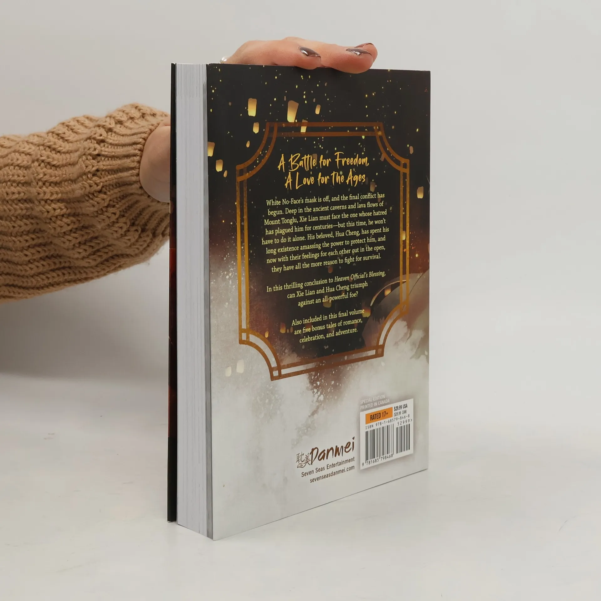 Limited Edition (one printing only!) of the NEW YORK TIMES BEST SELLER! The blockbuster danmei/Boys' Love novels from China that inspired the animated series! In this final book (Volume 8), read the conclusion to this epic historical fantasy about a prince and the mysterious man by his side, in English for the very first time. Also includes bonus stories! White No-Face's mask is off, and the final conflict has begun. Deep in the ancient caverns and lava flows of Mount Tonglu, Xie Lian must face the one whose hatred has plagued him for centuries--but this time, he won't have to do it alone. His beloved, Hua Cheng, has spent his long existence amassing the power to protect him, and now with their feelings for each other out in the open, they have all the more reason to fight for survival. In this thrilling conclusion to Heaven Official's Blessing, can Xie Lian and Hua Cheng triumph against an all-powerful foe? Also included in this final volume are five bonus tales of romance, celebration, and adventure. This limited Special Edition contains the Standard Edition, but with bonus merchandise shrinkwrapped to the book: a set of eight postcards, a double-sided bookmark, two folded mini posters, a sticker sheet, a lined notebook, and a papercraft standee. Don't miss the new art from guest artists included in this special merch!