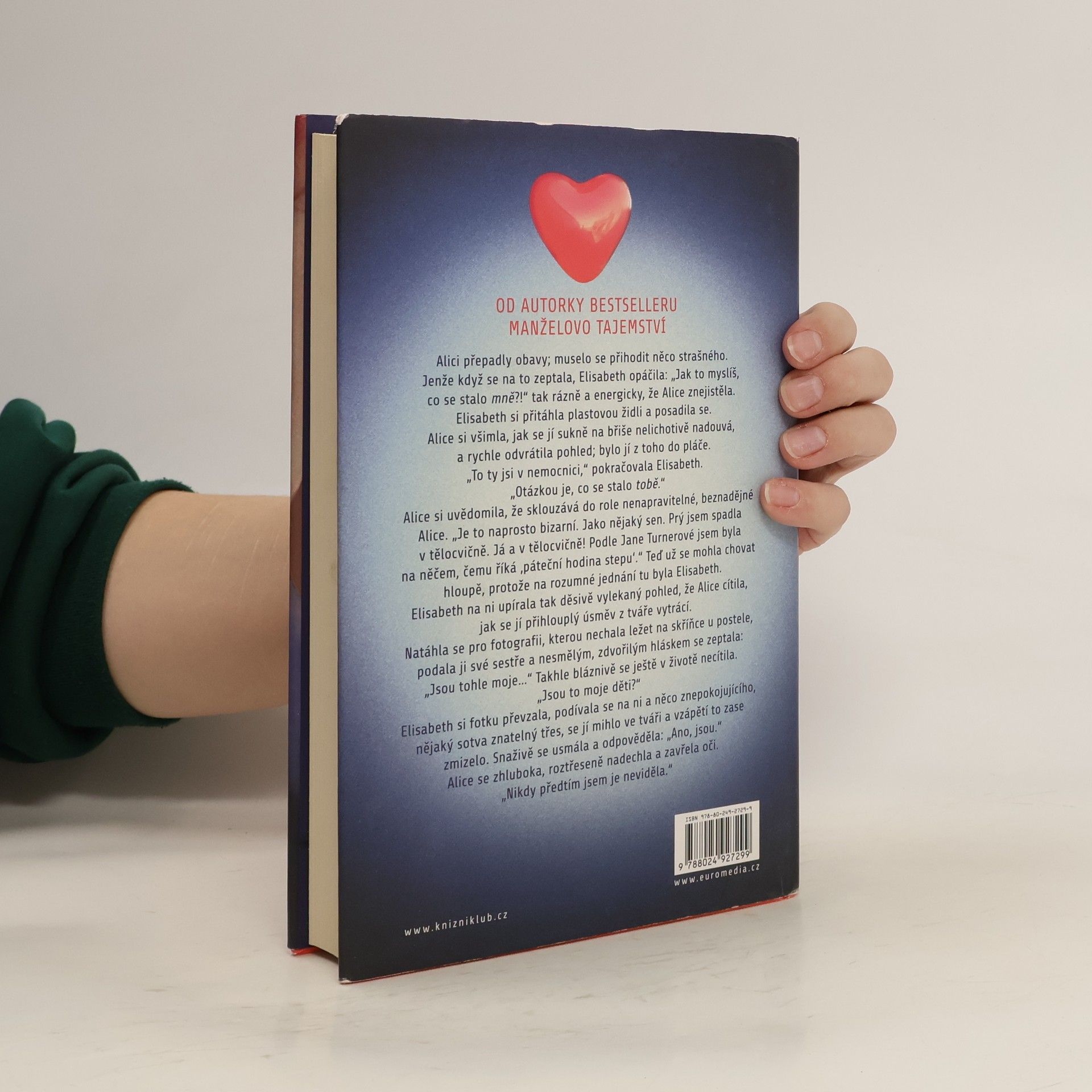 Když se Alice probere na zemi v posilovně, má na hlavě pořádnou bouli a myslí si, že je jí dvacet devět a čeká první dítě se svým superúžasným manželem Nickem. Jenomže pak se dozví, že se jí z paměti právě vymazalo deset let života a že je ve skutečnosti devětatřicetiletá neurotička, která nejraději tráví svůj volný čas v posilovně nebo na poradách školního výboru se ženami, jež kdysi nesnášela. Jak se to stalo, že se její život tak radikálně změnil? Proč ji její manžel nenávidí? Co tak hrozného provedla, že s ní její milovaná sestra skoro nemluví? A do toho si není schopná vůbec vzpomenout na svoje tři děti – ne, Alice se najednou vidí jinýma očima a ta nová žena, o které jí vyprávějí, se jí vůbec nezamlouvá. Najde způsob, aby se znovu stala tím člověkem, kterým bývala?