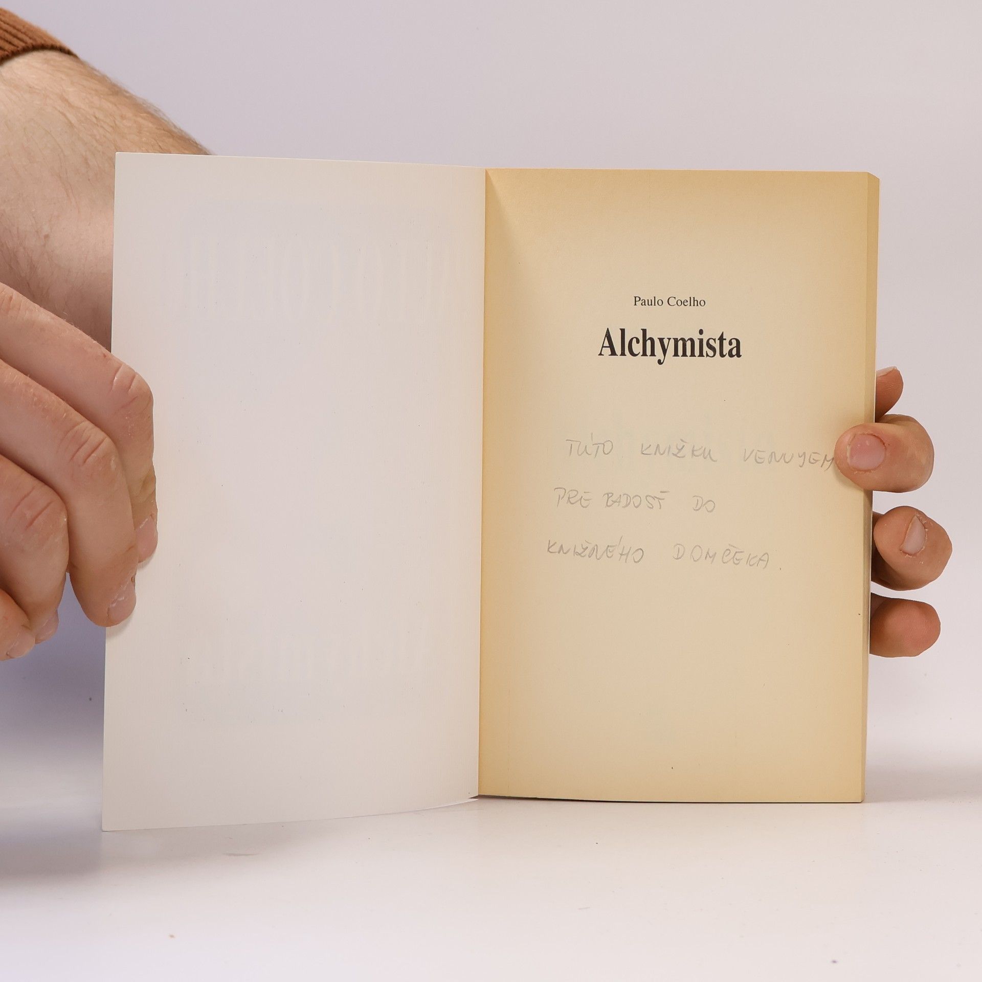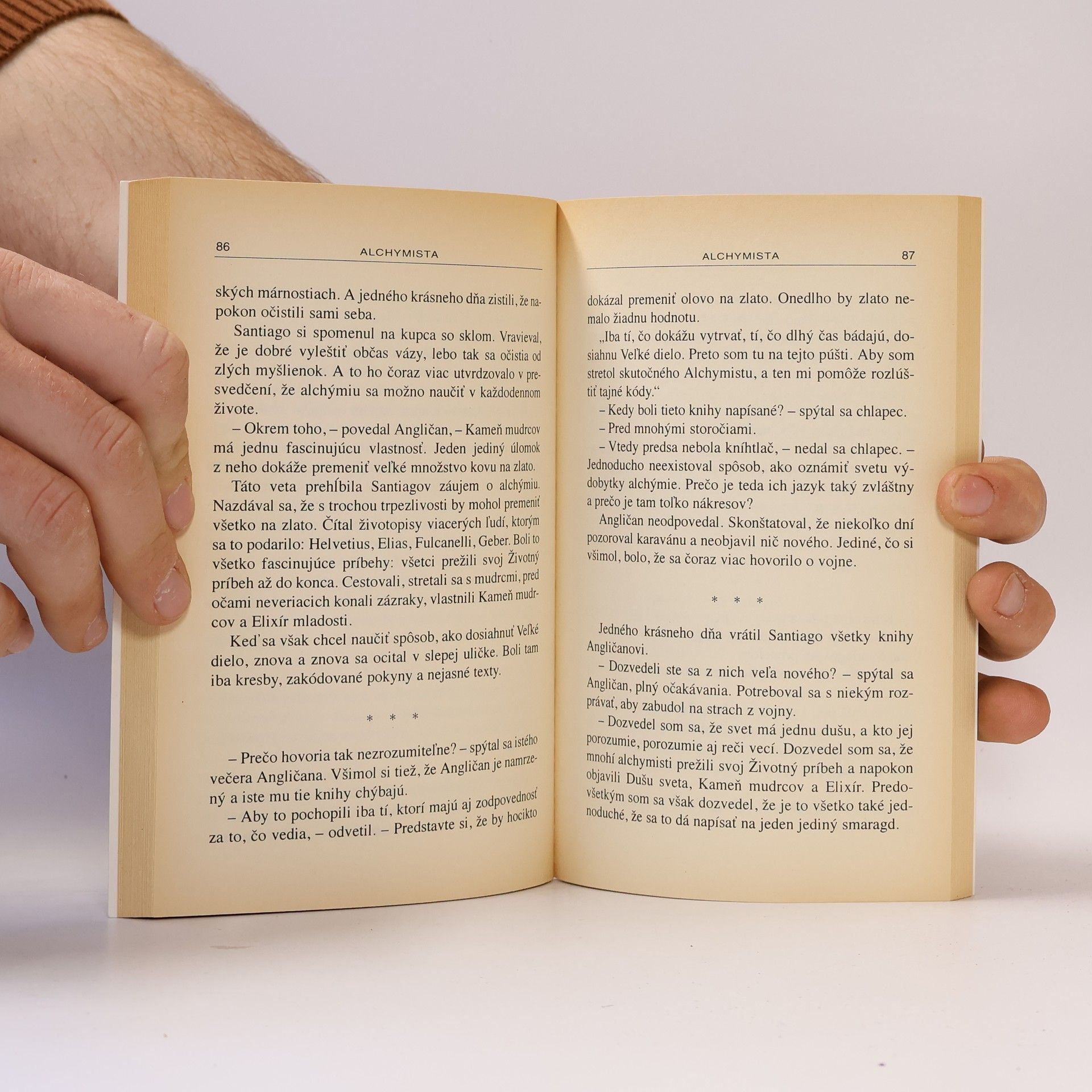 Symbolické putovanie andalúzskeho pastiera Santiaga za pokladom do Egypta. Prostredníctvom symbolického jazyka alchýmie sa Paulo Coelho snaží sprostredkovať poznanie, v čom spočíva podstata šťastia i to, že poslaním každého človeka je ísť po stopách znamení za svojím Osobným príbehom.