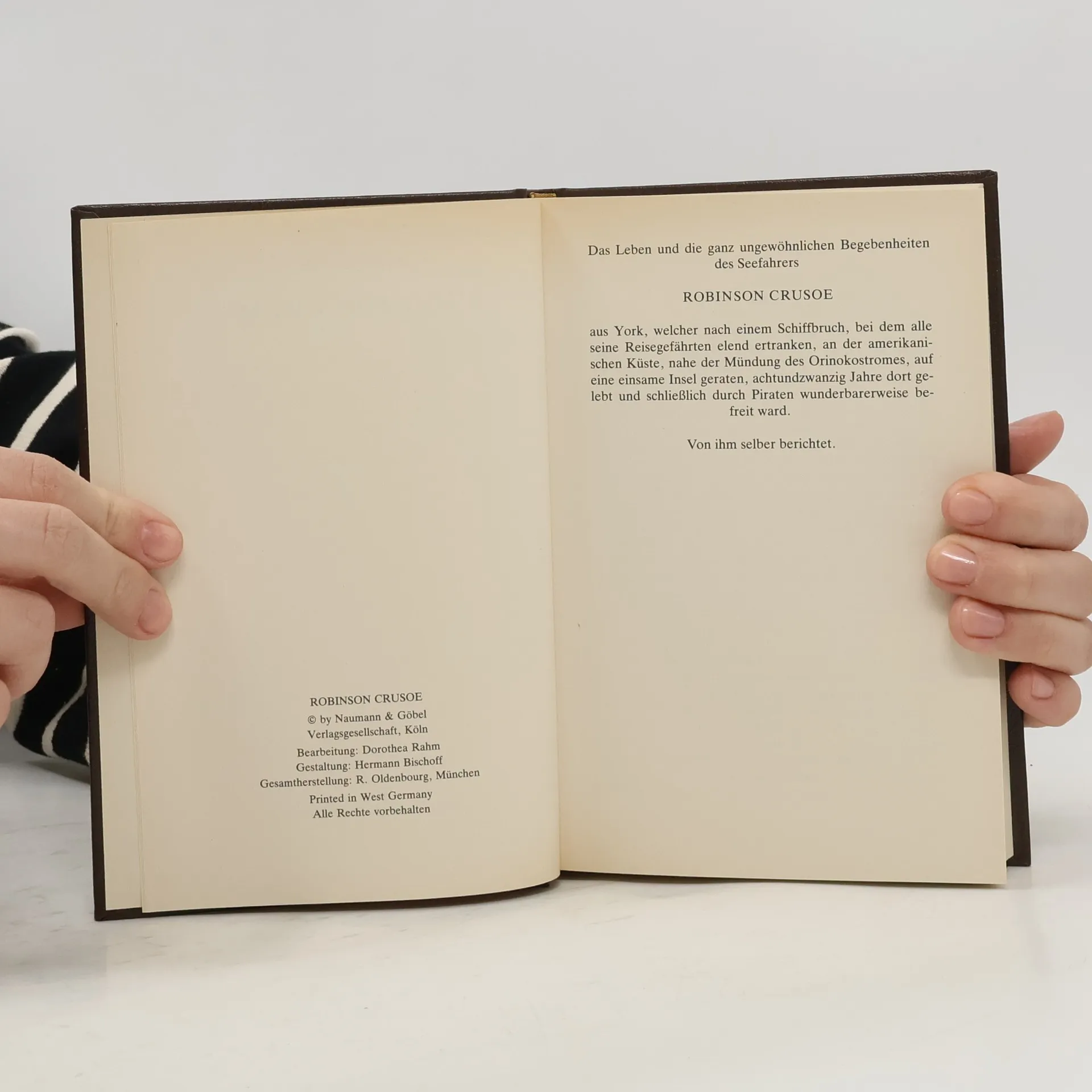 »Das Leben und die seltsamen Abenteuer des Robinson Crusoe, eines Seemanns aus York. Welcher achtundzwanzig Jahre ganz allein auf einer unbewohnten Insel vor der amerikanischen Küste, nahe der Mündung des großen Orinoco lebte, wohin er nach einem Schiffbruch, bei dem die ganze Besatzung außer ihm selbst ums Leben kam, verschlagen wurde. Nebst dem Bericht wie er auf wundersame Weise durch Piraten gerettet wurde. Geschrieben von ihm selbst.« So lautet der volle Titel des Buches, dessen wichtigste Begebenheiten hier in Auswahl dargeboten werden. Gekürzte Ausgabe