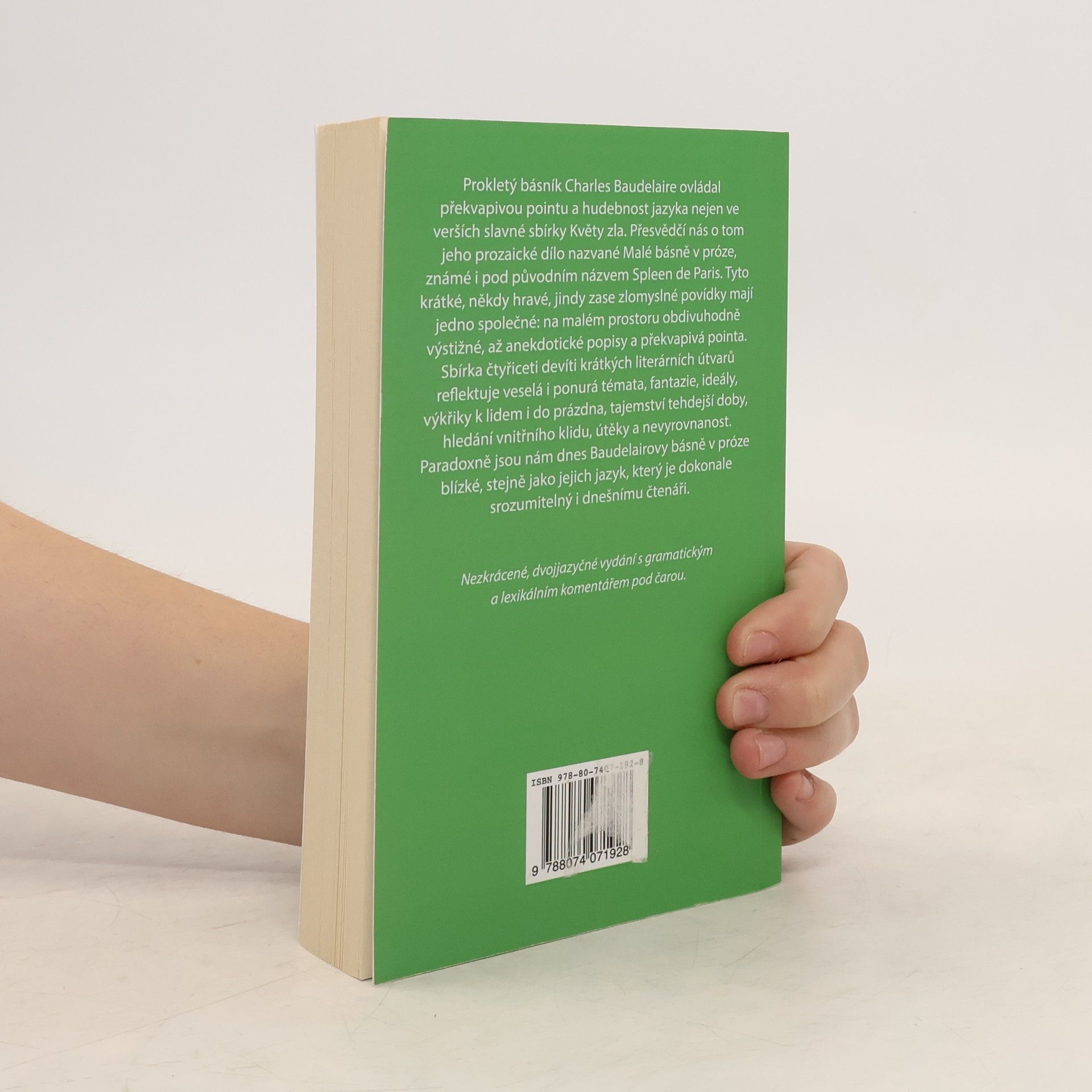 Prokletý básník Charels Baudelaire ovládal překvapivou pointu a hudebnost jazyka nejen ve verších slavné sbírky Květy zla. Přesvědčí nás o tom jeho prozaické dílo nazvané Malé básně v próze, známé i pod původním názvem Spleen de Paris. Tyto krátké, někdy hravé, jindy zase zlomyslné povídky mají jedno společné: na malém prostoru obdivuhodné krátké a přitom výstižné, až anekdotické popisy a břitká pointa. Francouzský text je překvapivě velmi srozumitelný i pro dnešní studenty francouzštiny. Dvojjazyčný text s gramatickým a lexikálním komentářem pod čarou. Pro středně pokročilé. Komentář Aude Brunel.