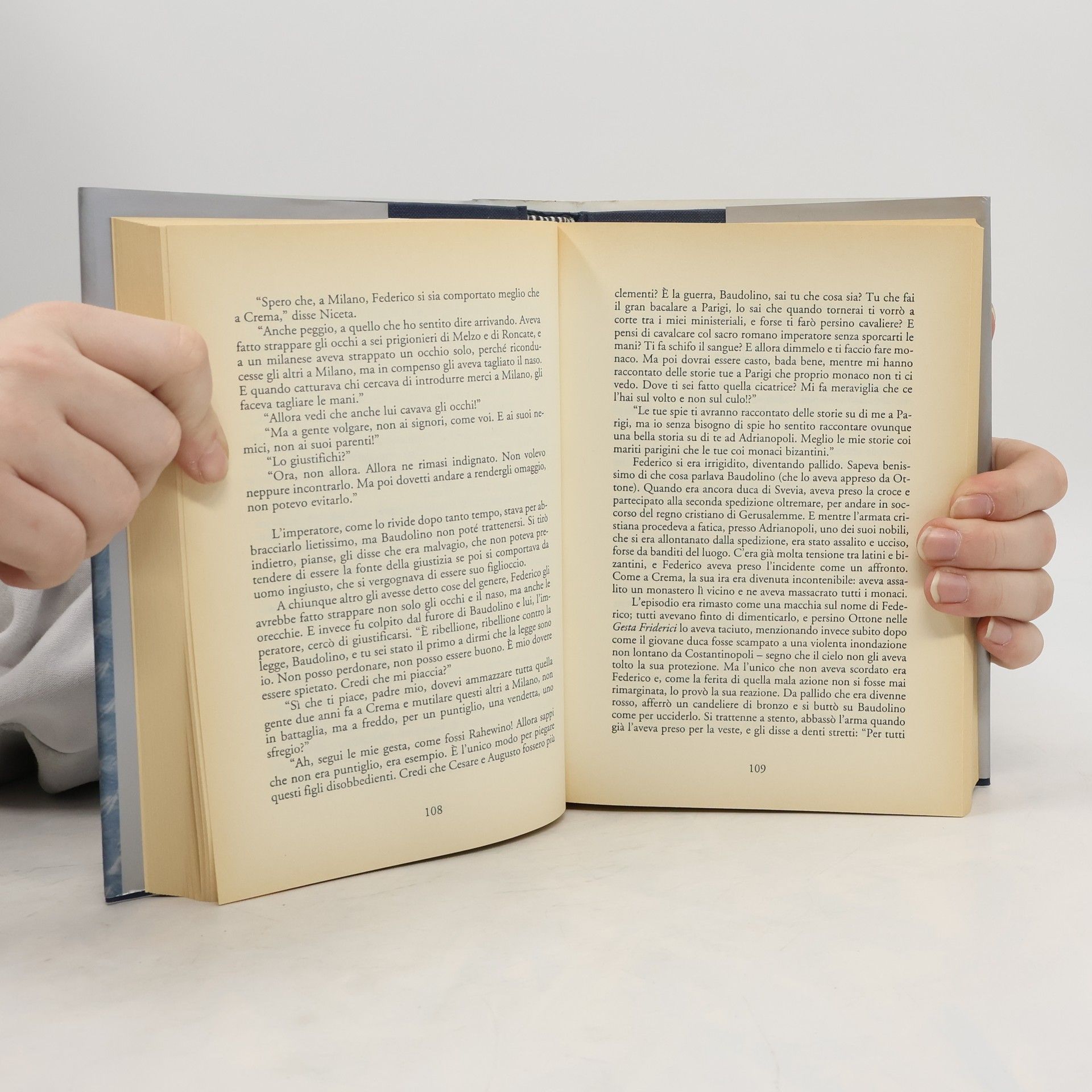 Konstantinopel brennt, erobert und geplündert von den Rittern des Vierten Kreuzzuges. Unter ihnen ist Baudolino aus dem Piemont, ein Junge voller Phantasien und Lügen, der uns durch ein historisches Panorama führt. Er erzählt, wie er als 13-jähriger Bauernsohn den im Nebel umherirrenden Kaiser Barbarossa trifft, der ihn adoptiert. Baudolino begleitet den Kaiser auf seinen Italienzügen gegen aufmüpfige Städte und auf dem großen Kreuzzug ins Heilige Land, stets auf der Suche nach dem mythischen Reich des Priesterkönigs Johannes im Orient. Mit seinen aberwitzigen Ideen beeinflusst er den Lauf der Geschichte, sei es bei der Heiligsprechung Karls des Großen 1165 oder bei der Erfindung der Legende der Heiligen Drei Könige, um dem Erzbischof von Köln, Rainald von Dassel, einen triumphalen Einzug in seine Domkirche zu ermöglichen. Obwohl Baudolino alles miterlebt hat, trägt er ein Geheimnis in sich: Barbarossa, der angeblich im Fluss ertrank, ist in Wahrheit bereits in der Nacht zuvor gestorben. Unfall, Herzversagen oder Mord? Baudolino ahnt, wer der Mörder sein könnte.