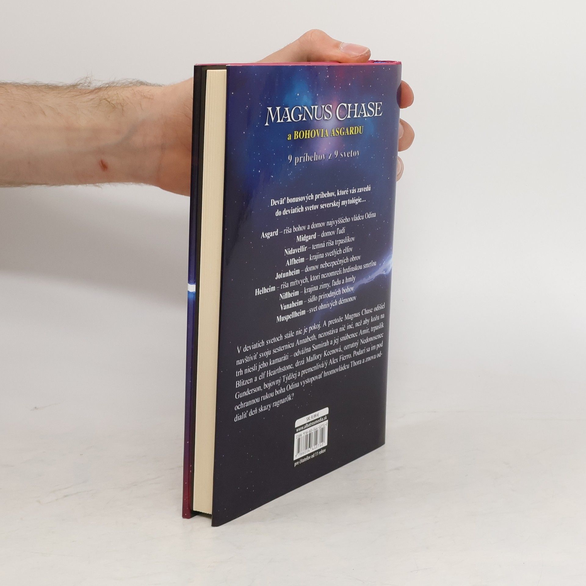 Deväť bonusových príbehov, ktoré vás zavedú do deviatich svetov severskej mytológie. .. Asgard – ríša bohov a domov najvyššieho vládcu Odina Midgard – domov ľudí Nidavellir – temná ríša trpaslíkov Alfheim – krajina svetlých elfov Jotunheim – domov nebezpečných obrov Helheim – ríša mŕtvych, ktorí nezomreli hrdinskou smrťou Niflheim – krajina zimy, ľadu a hmly Vanaheim – sídlo prírodných bohov Muspellheim –svet ohnivých démonov V deviatich svetoch stále nie je pokoj. A pretože Magnus Chase odišiel navštíviť svoju sesternicu Annabeth, nezostáva nič iné, než aby kožu na trh niesli jeho kamaráti – odvážna Samirah a jej snúbenec Amir, trpaslík Blitzen a elf Hearthstone, drzá Mallory Keenová, ozrutný Nedonosenec Gunderson, bojovný Týdžej a premenlivá/ý Alex Fierro. Podarí sa im pod ochrannou rukou boha Odina vystopovať hromovládcu Thora a znova oddialiť deň skazy ragnarök?
