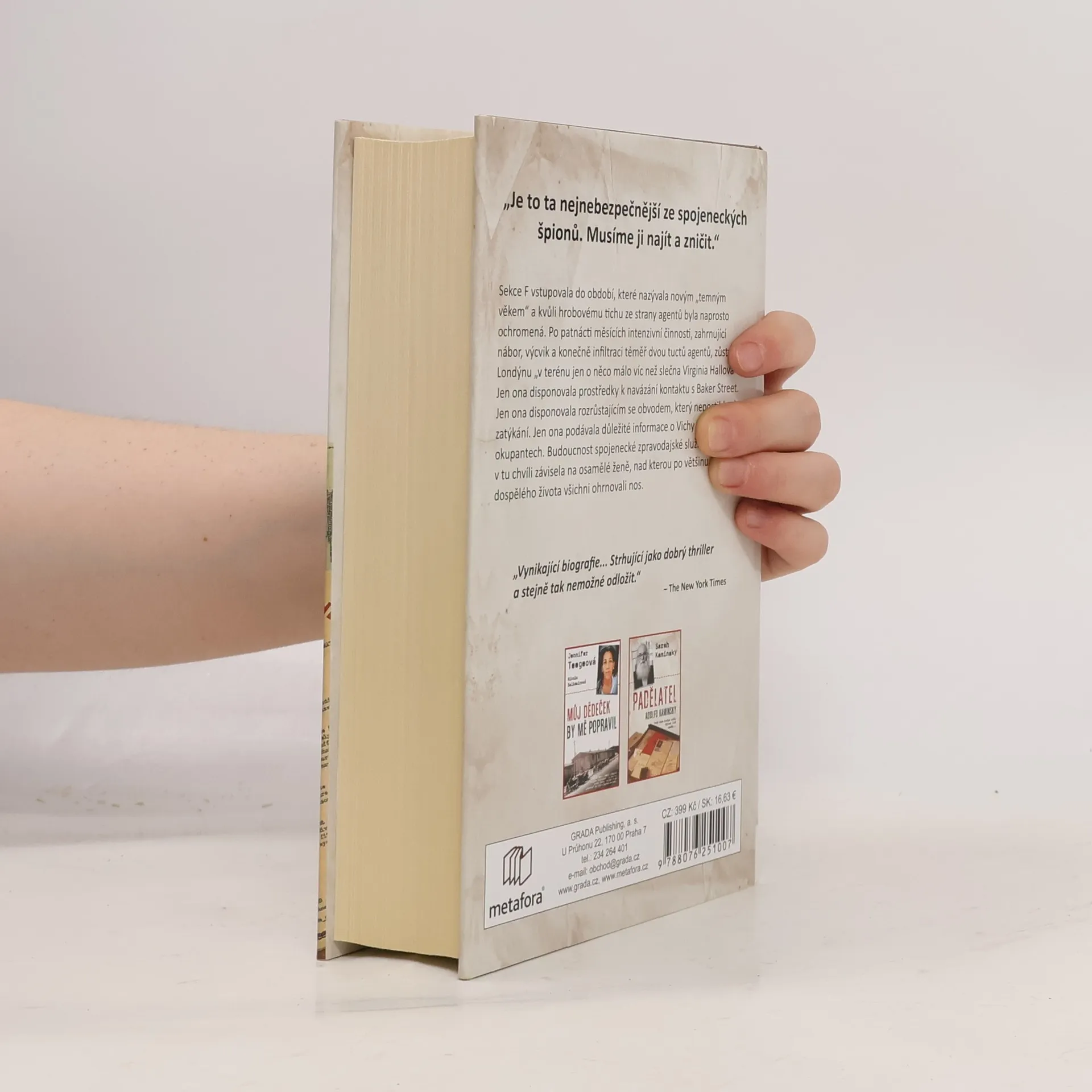 Dosud nezveřejněný příběh špionky, ze které mělo strach i samotné gestapo, přináší fascinující pohled na život Virginie Hallové. Pocházela z majetné rodiny z Baltimoru, kde studovala jazyky a ekonomii. Pracovala na americké ambasádě ve Varšavě a snila o kariéře na Ministerstvu zahraničí, ale po nehodě při lovu v roce 1932 přišla o nohu, což její ambice zkomplikovalo. Přesto se dokázala prosadit ve službách britské rozvědky, stala se první ženou nasazenou za nepřátelskou linií, kde vybudovala rozsáhlé špionážní sítě ve Francii. Byla klíčovou osobou odboje, organizovala shozy zbraní a výbušnin a stala se průkopnicí tajného bojiště. Gestapo po ní neúnavně pátralo, plakáty s její podobiznou visely téměř všude a byla na ni vypsaná odměna, ale ona odmítala z Francie odejít. Až po odhalení uprchla přes Pyreneje do Španělska, ale brzy se vrátila, aby vedla úspěšnou partyzánskou válku proti nacistům během invaze v Normandii. Sonia Purnellová na základě nových informací a rozsáhlého výzkumu odhaluje tajný život Virginie Hallové v inspirativním příběhu o hrdinství a osobním vítězství nad nepřízní osudu, ukazujícím, jak vytrvalost jedné ženy pomohla vyhrát nejdůležitější válku v historii.