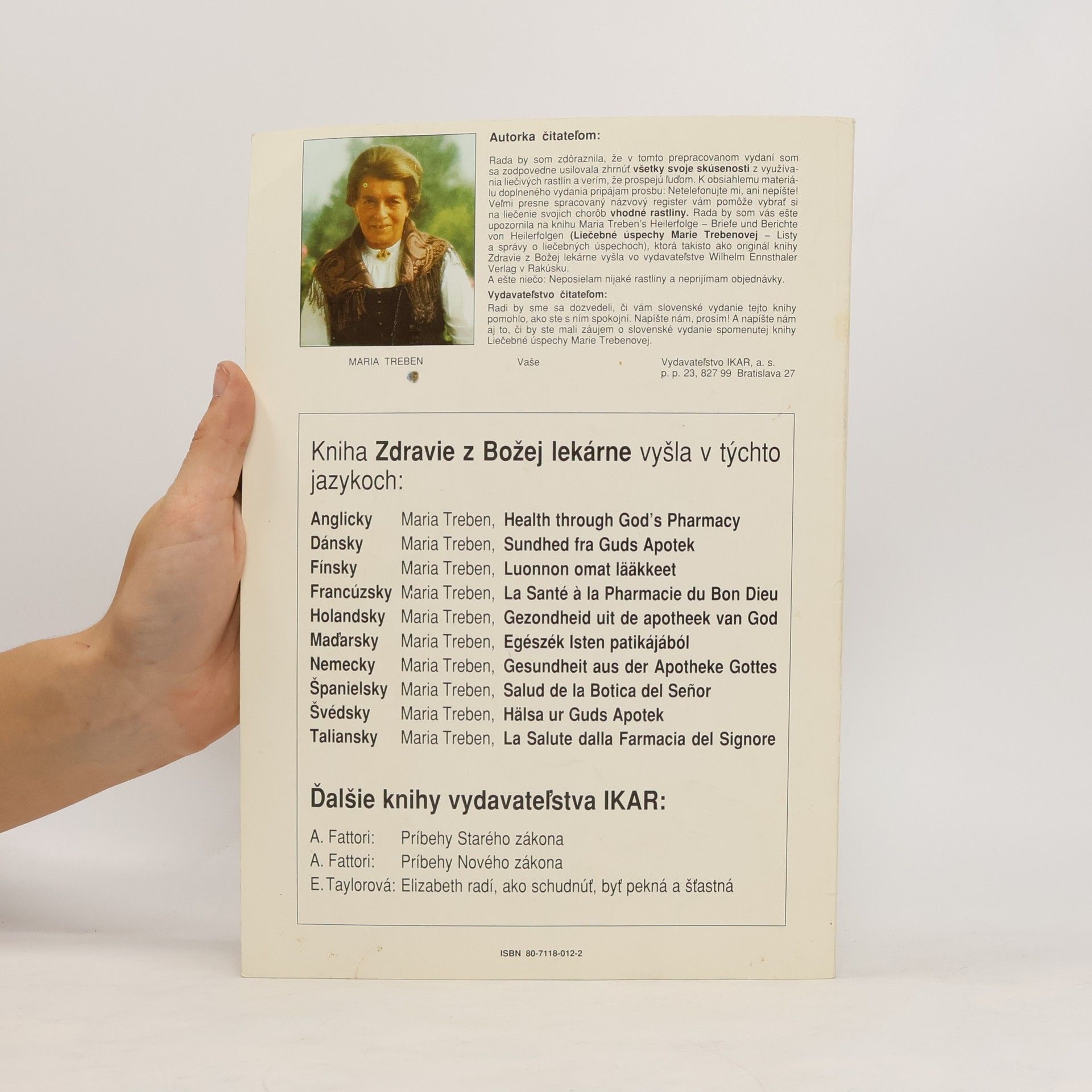 Svetoznáma rakúska liečiteľka a bylinkárka ponúka v novom vydaní žiadanej a obľúbenej bylinkárskej knihy množstvo informácií o bylinkách a liečivách z nich vyrábaných, o ich účinkoch a možnostiach použitia. Hoci je publikácia už staršieho dáta, i dnes si nachádza stále nových čitateľov kvôli svojmu nadčasovému obsahu. Poznatky Marie Trebenovej sú rovnako dobre použiteľné v súčasnosti, tak ako boli aj v minulosti.