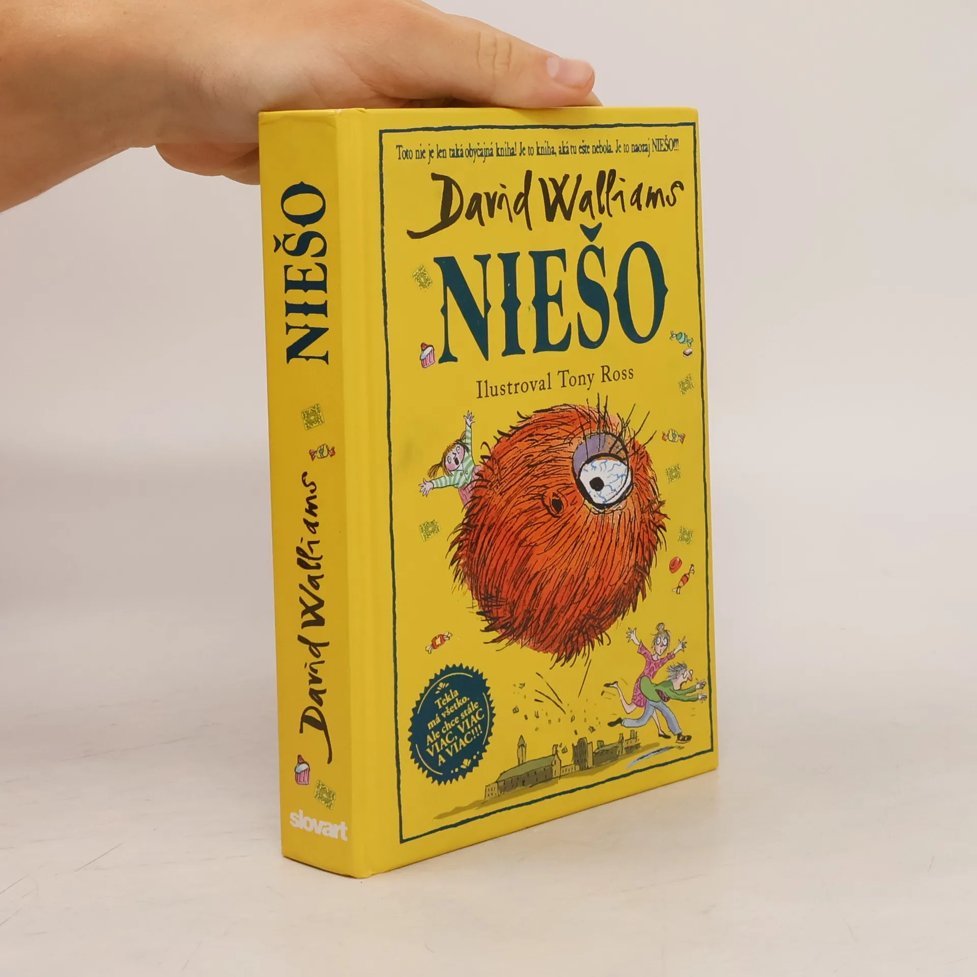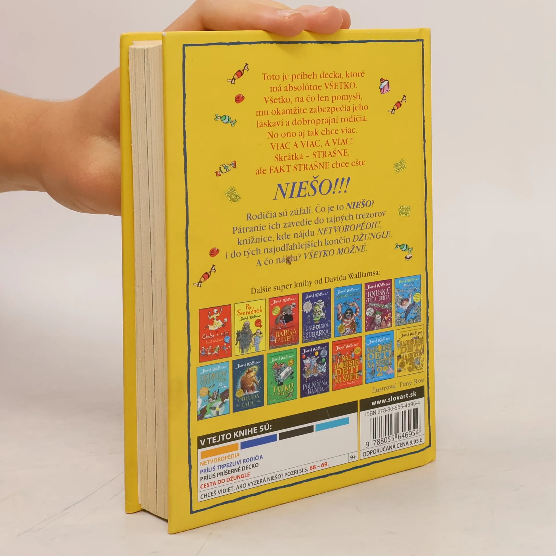 Svetoznámy britský komik a autor detských bestsellerov David Walliams už napísal množstvo skvelých kníh o neposlušných, zlostných, papuľnatých, drzých, nadutých a rozmaznaných deťoch, dokonca aj o tých, čo sú fakt najhoršie na svete. Ale toto tu ešte nebolo! Vymyslel príbeh decka, ktoré má absolútne všetko. Všetko, na čo len pomyslí, mu okamžite zabezpečia jeho láskaví a dobroprajní rodičia. No ono aj tak chce viac. Viac a viac, a viac! Skrátka – strašne chce, ale fakt strašne chce ešte NIEŠO! Rodičia sú zúfalí. Čo je to NIEŠO? Pátranie ich zavedie do tajných trezorov knižnice, kde nájdu Netvoropédiu, i do tých najodľahlejších končín džungle. A čo nájdu? Všetko možné. Tak to poďte hľadať s nimi. Len pozor, aby ste pritom neexplodovali od smiechu!
